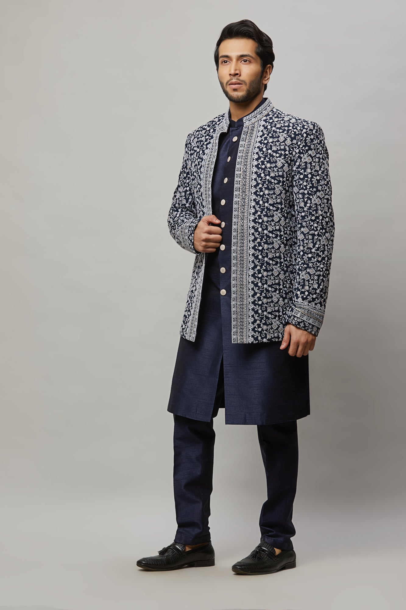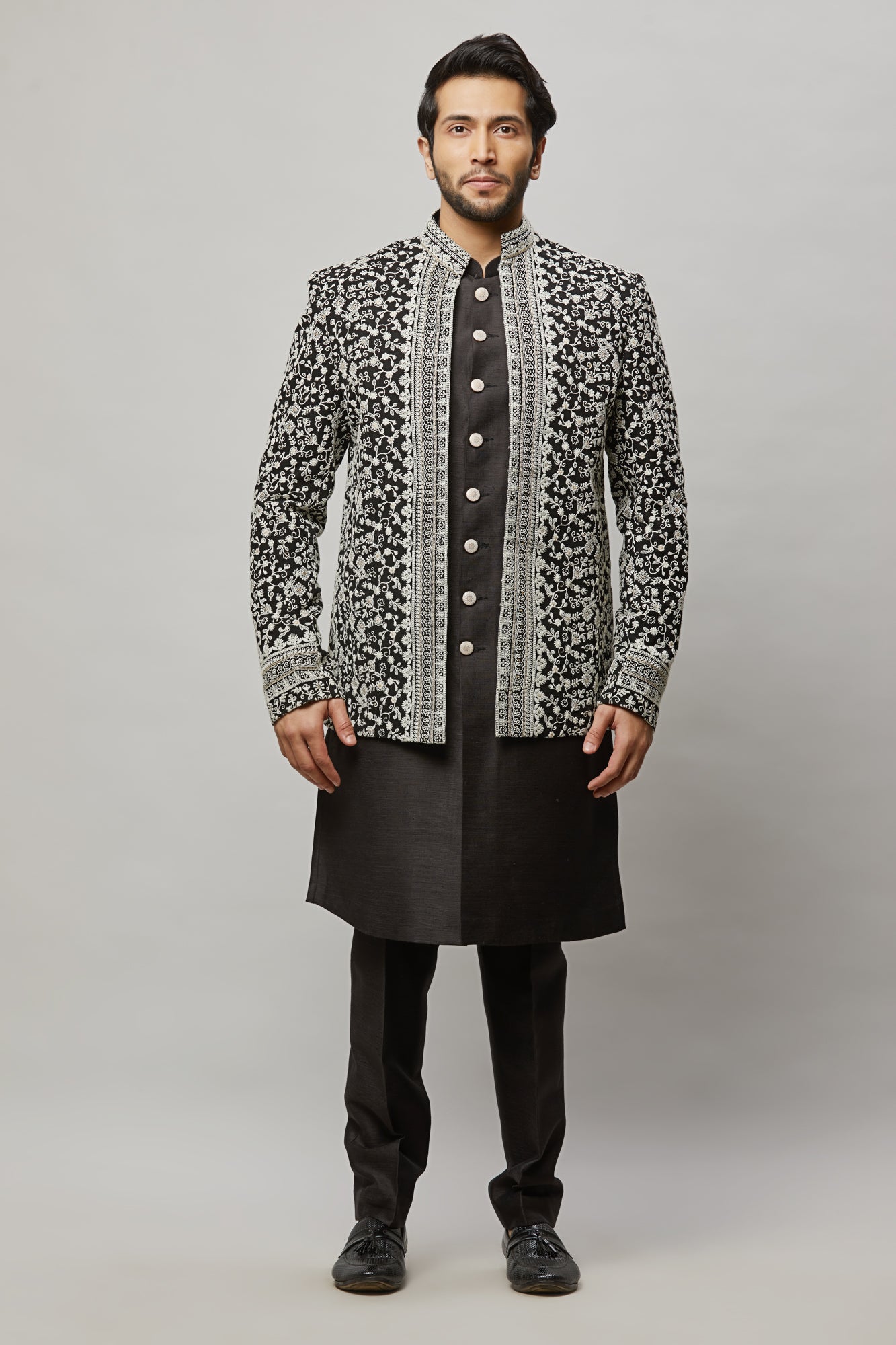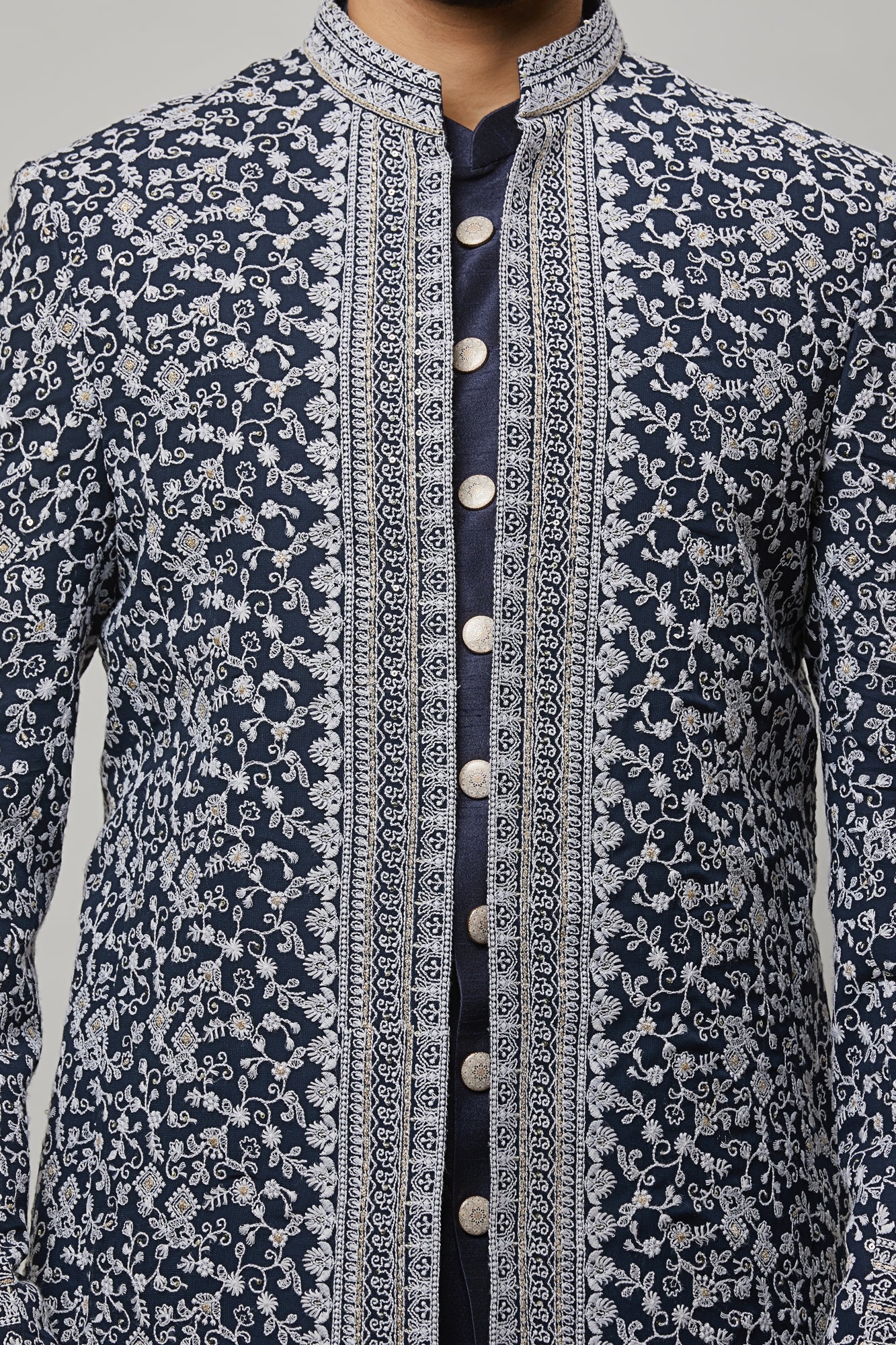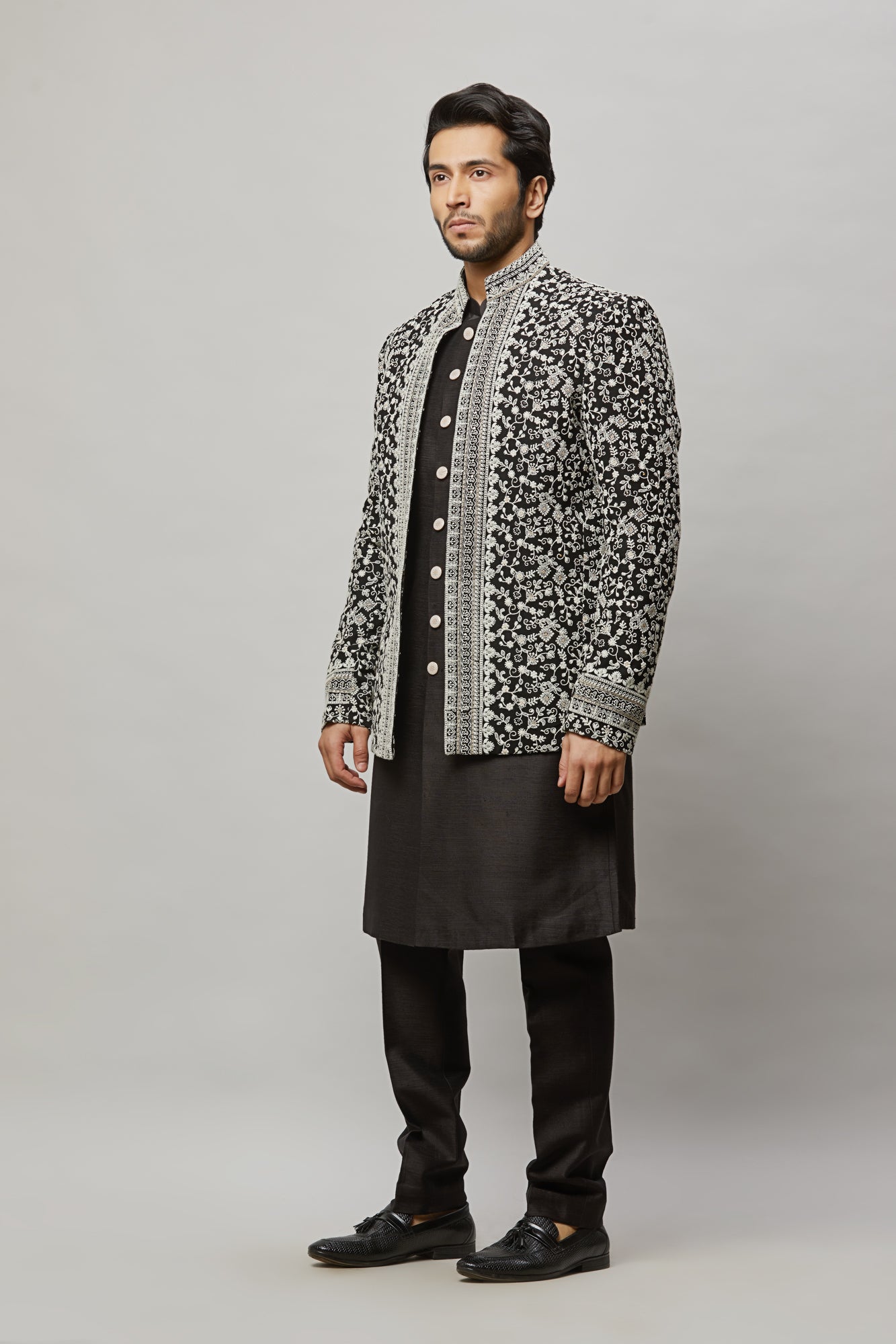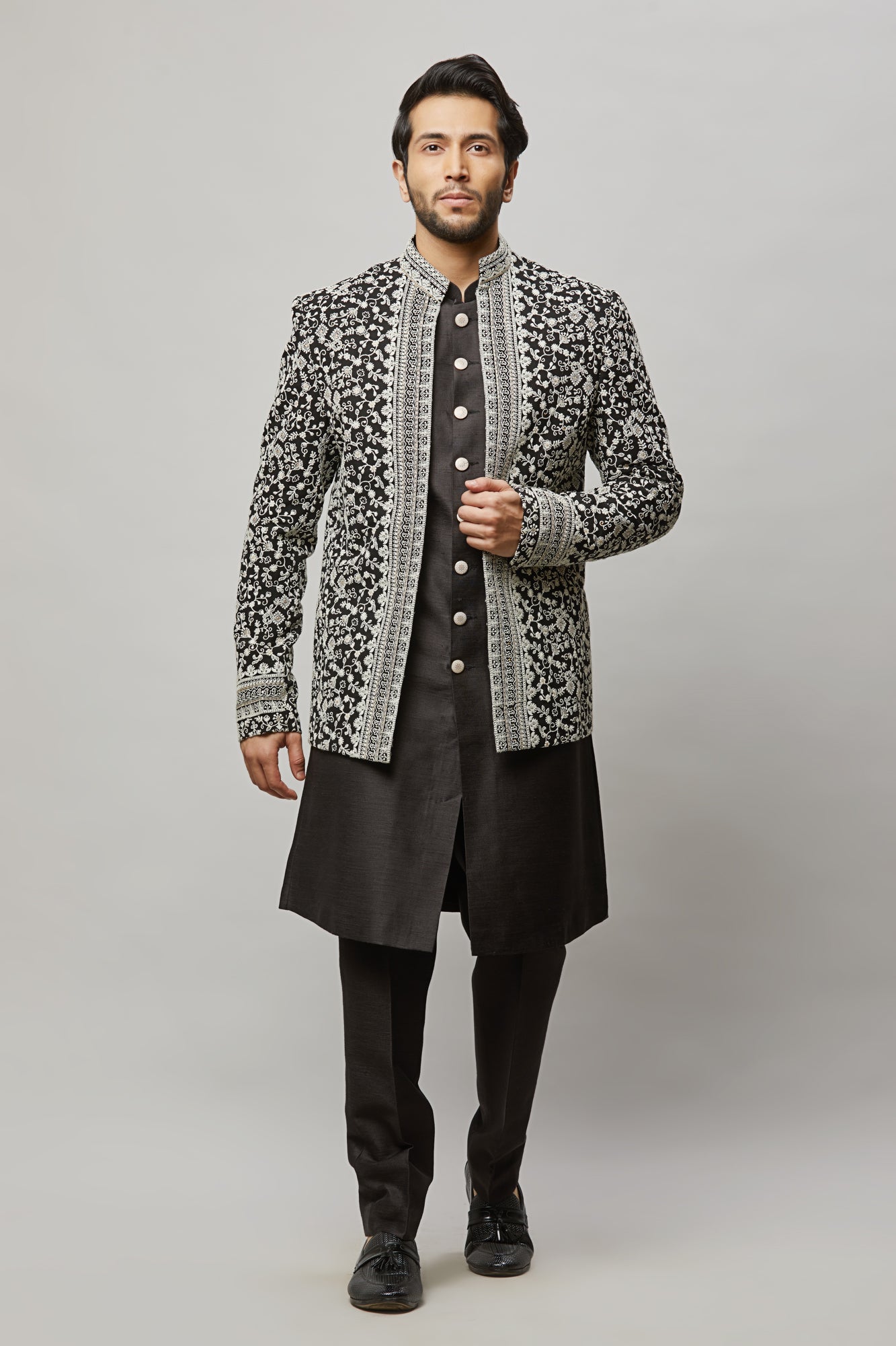 • This open jacket sherwani is an ideal wear for someone who really likes to dance and be comfortable. It's designed for maximum comfort. If you are the kind of groom who likes to dance, this sherwani is a solution to all your problems. This is a 2 layer sherwani, with the inside being a kurta and a short embroidered jacket on the outside.
