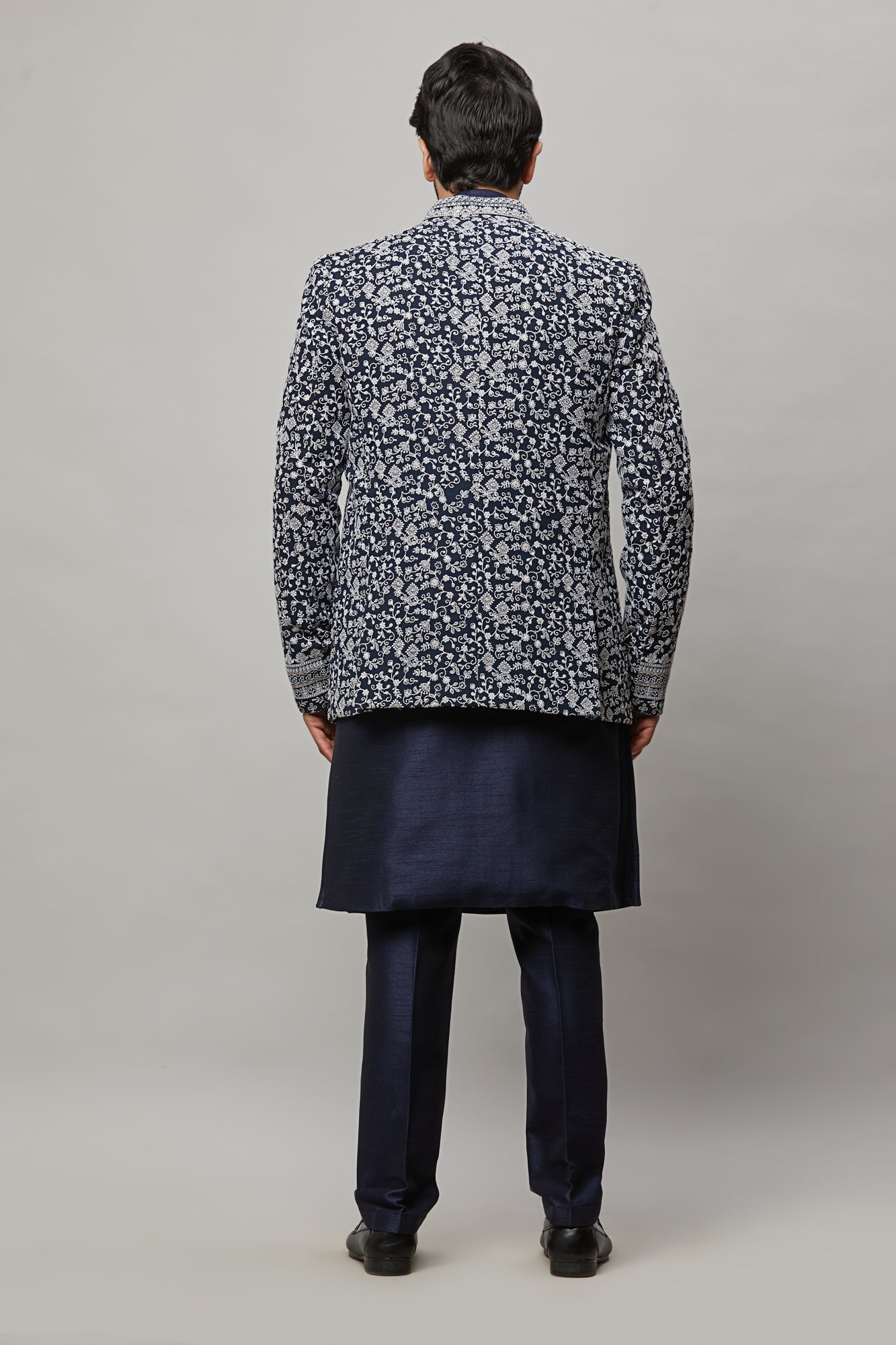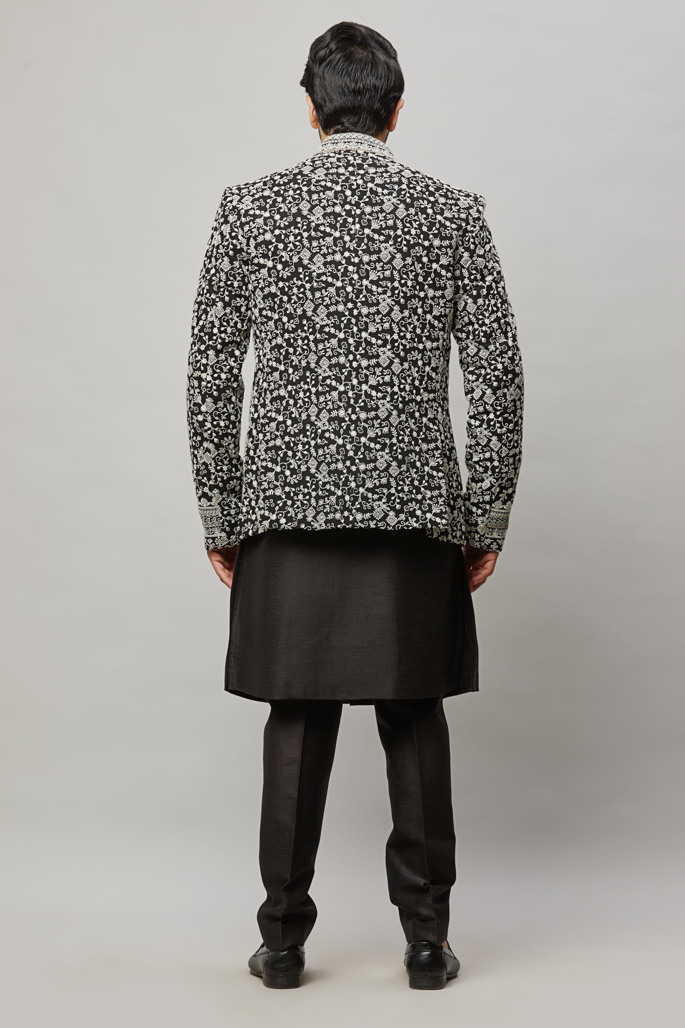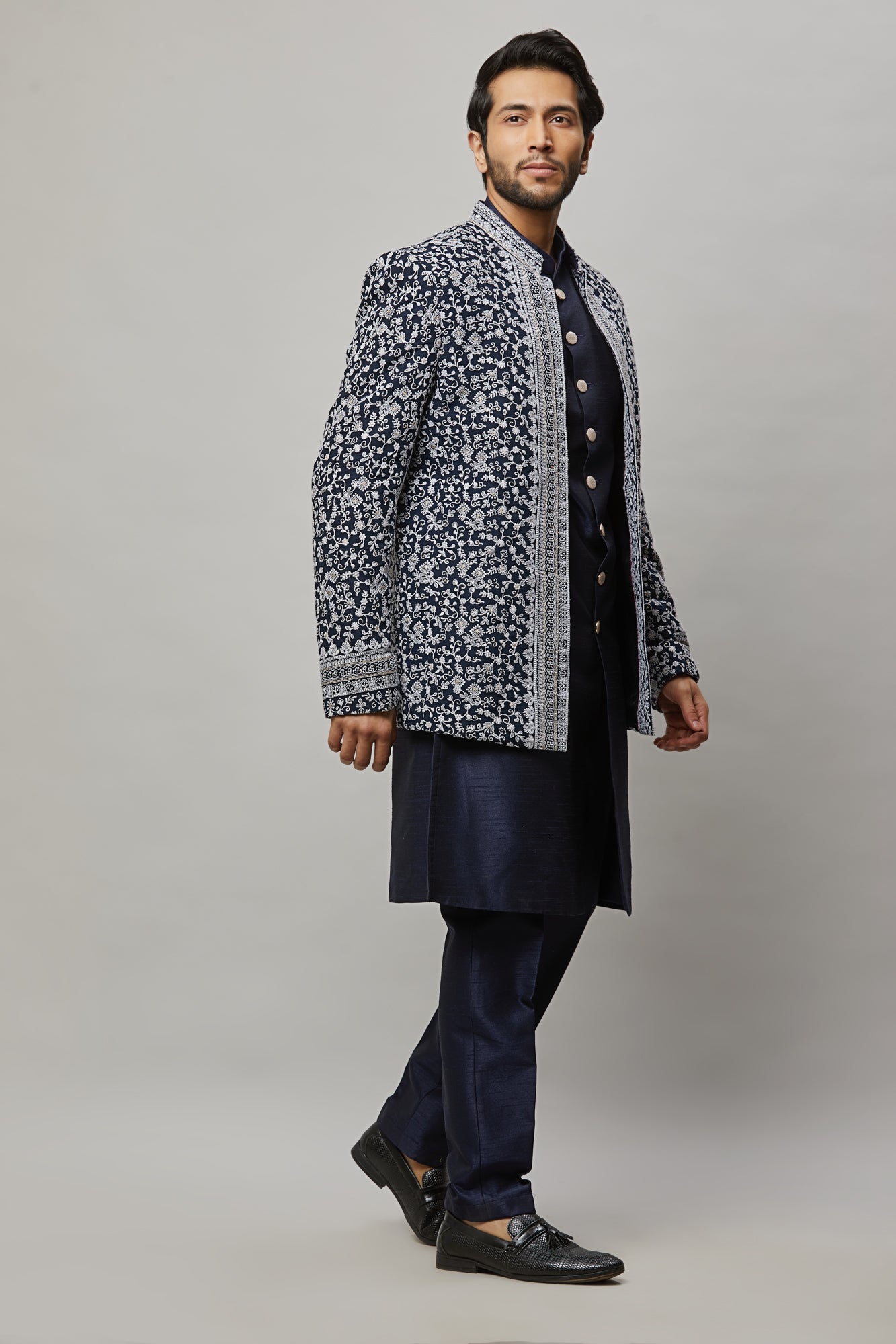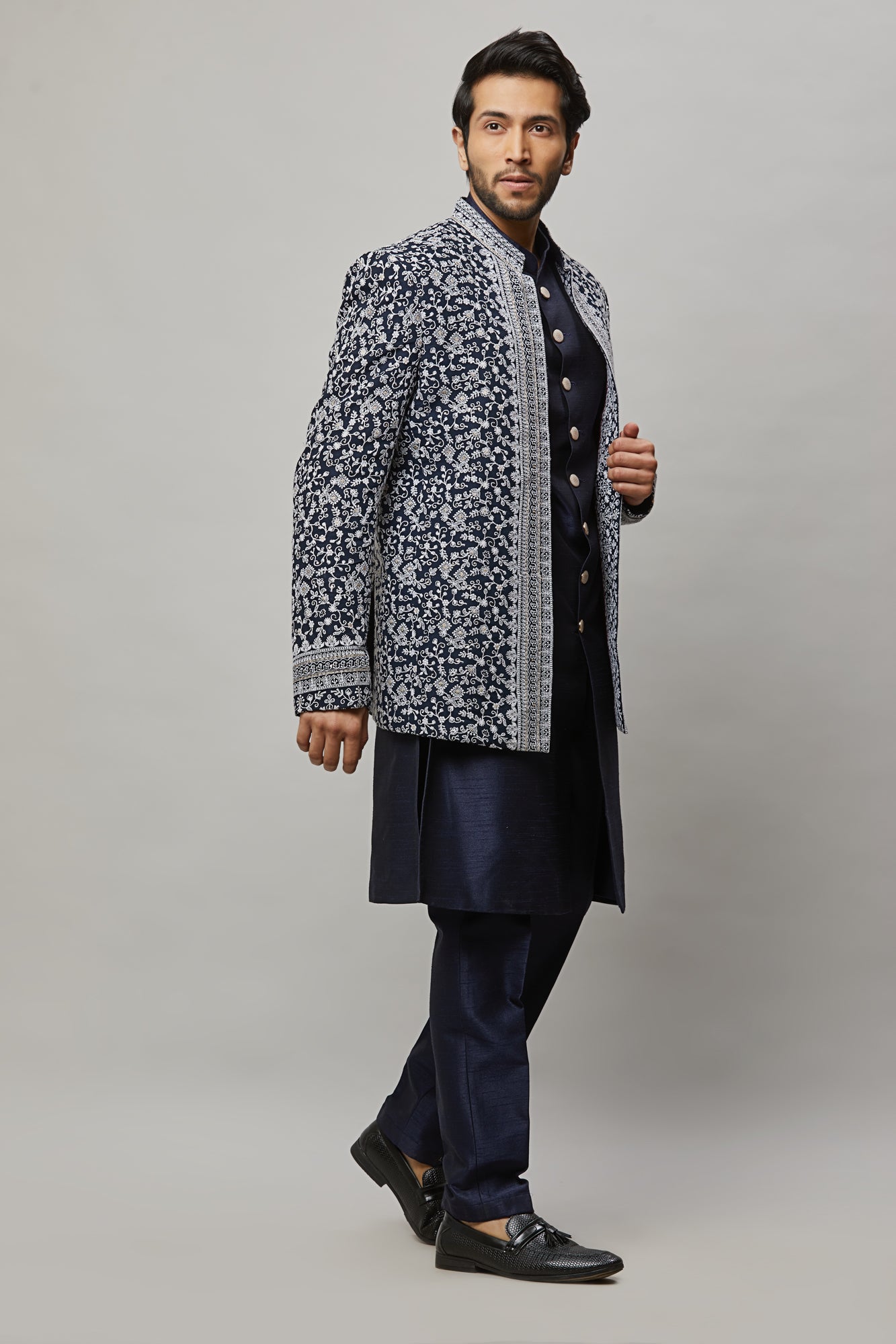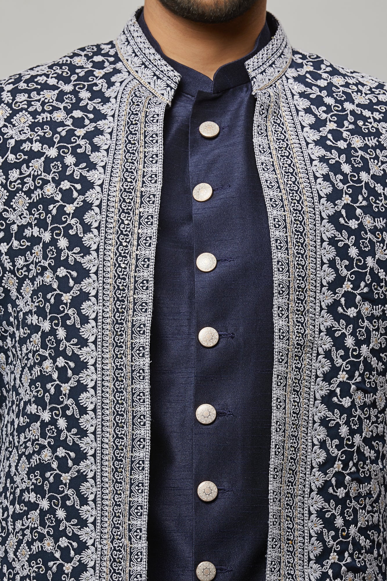 • This open jacket sherwani is an ideal wear for someone who really likes to dance and be comfortable. It's designed for maximum comfort. If you are the kind of groom who likes to dance, this sherwani is a solution to all your problems. This is a 2 layer sherwani, with the inside being a kurta and a short embroidered jacket on the outside.