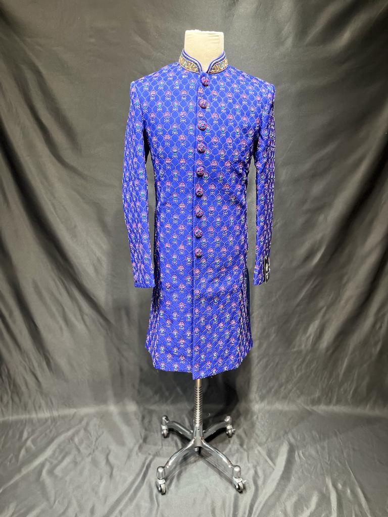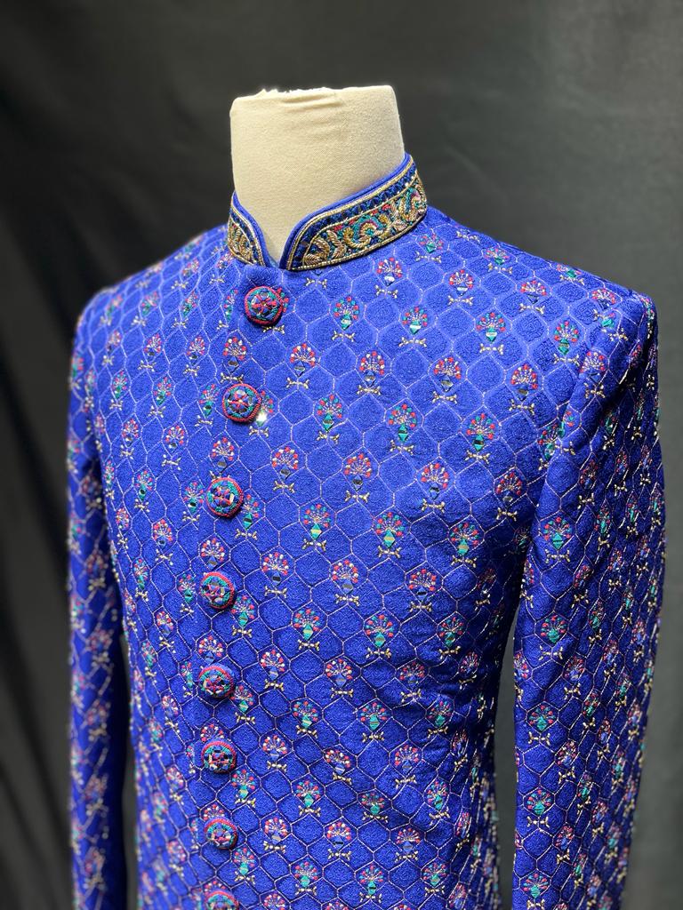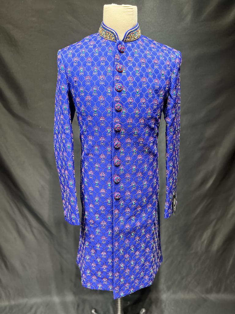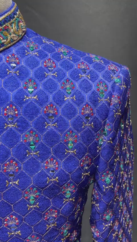 This Mens Sherwani 1032 is perfect for any formal occasion. Crafted of royal blue, this classic style is adorned with intricate mirror work and threads for a unique and sophisticated look. The perfect addition to any wardrobe.