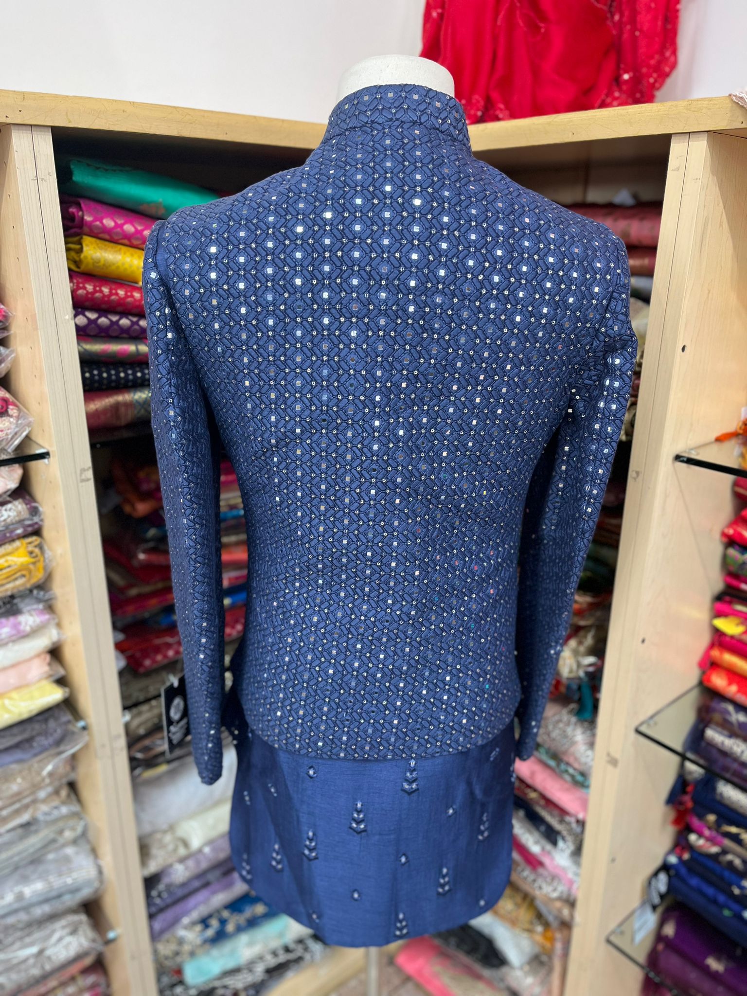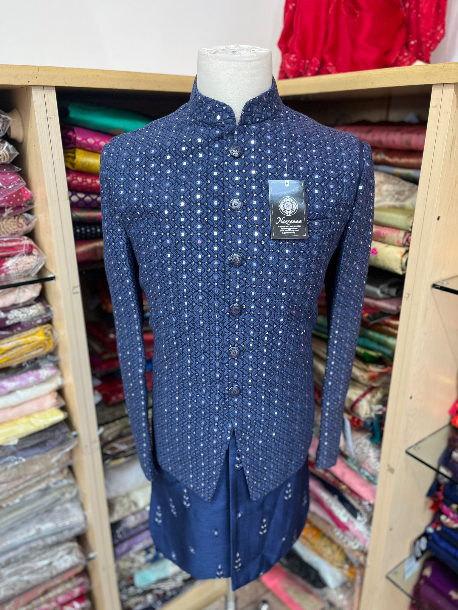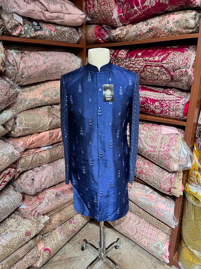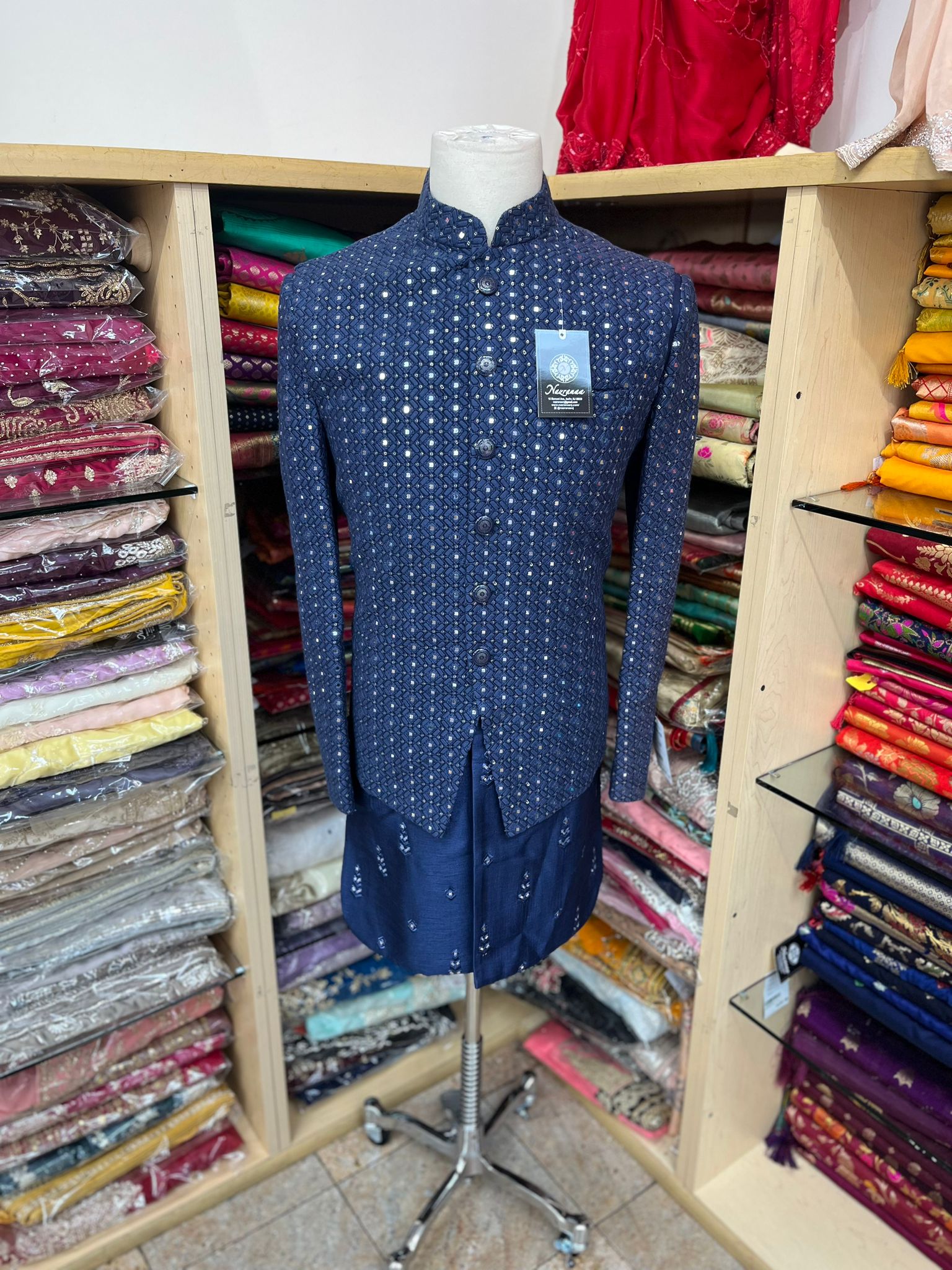 • Navy Blue embroidered sherwani with sequins and thread. The jacket is embellished in thread and sequins work. Completed look with matching bottom pant.