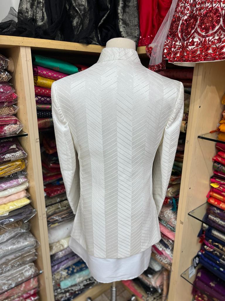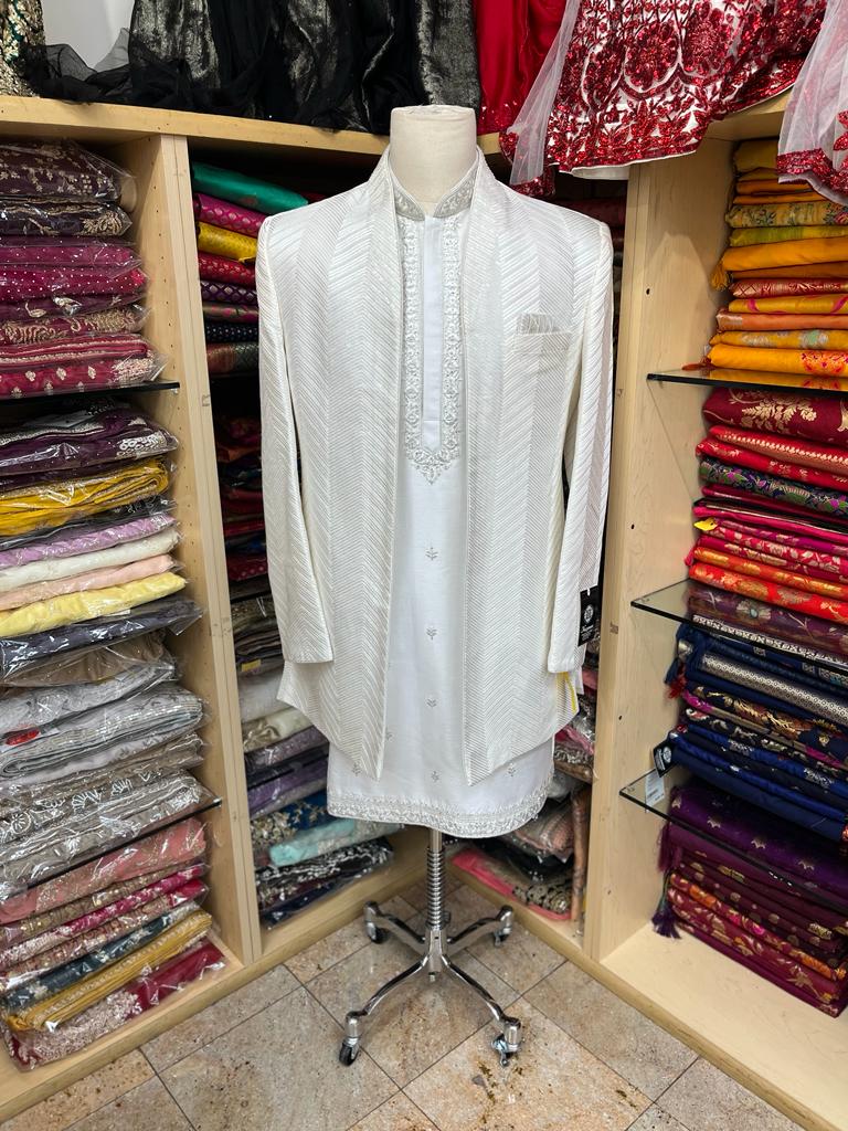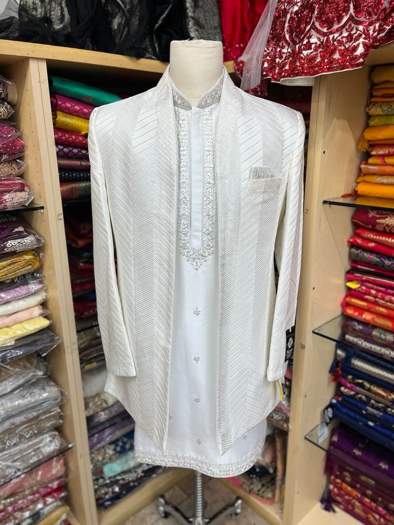 • This open jacket sherwani is an ideal wear for someone who really likes to dance and be comfortable. It's designed for maximum comfort. If you are the kind of groom who likes to dance, this sherwani is a solution to all your problems. This is a 2 layer sherwani, with the inside being a kurta and a short embroidered jacket on the outside.