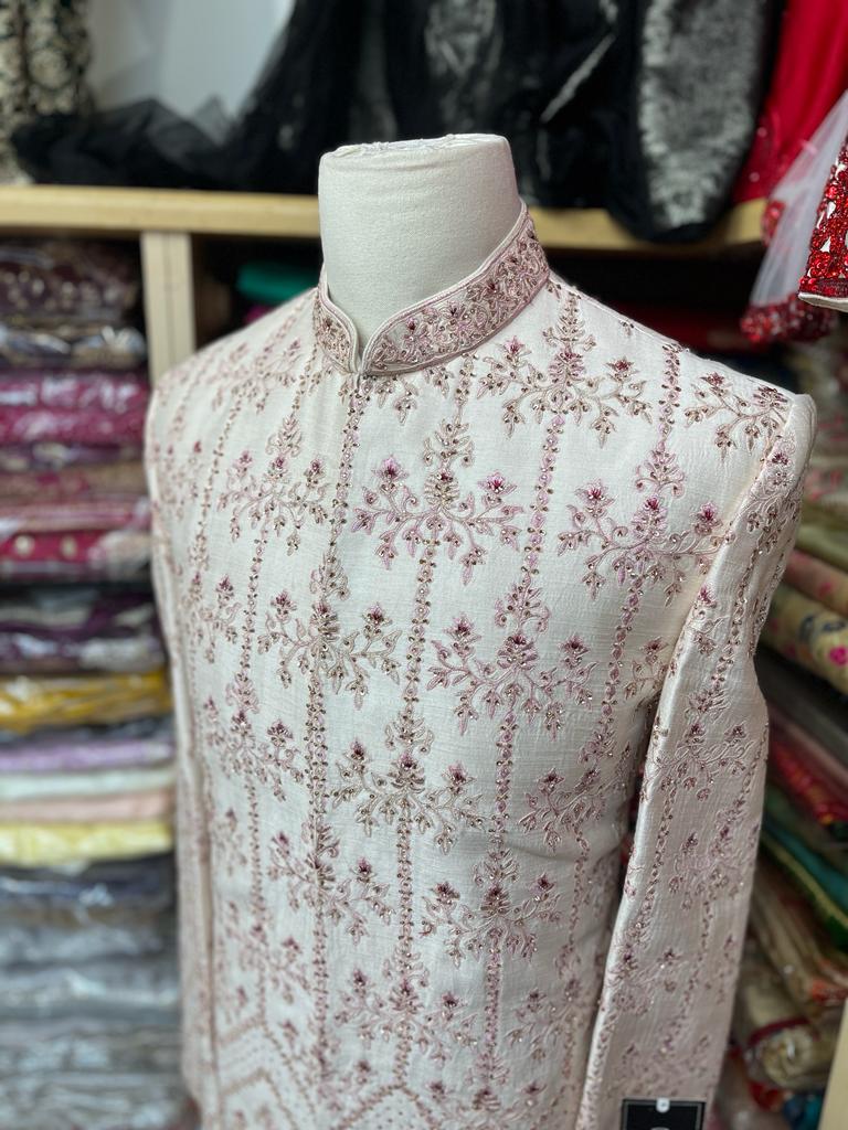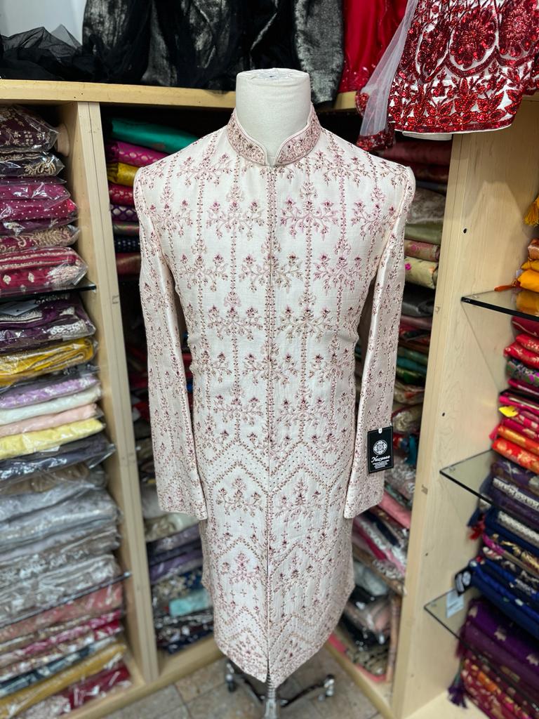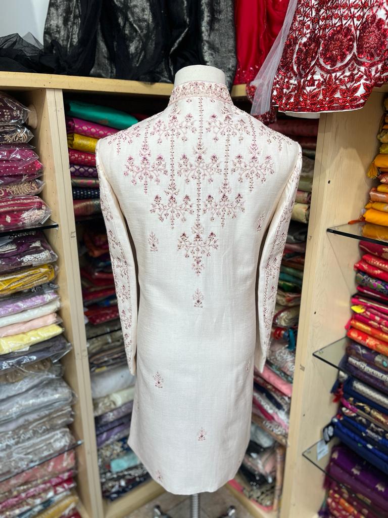 • Ivory sherwani blooms with fine floral charmed with resham beautifies with French knots and the mandarin collar is enriched with hot pink threadwork for a marvelous finish. Paired with a matching churidar pants.