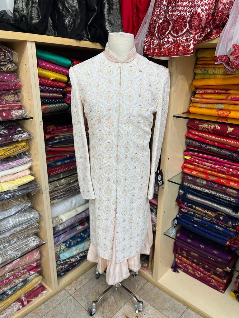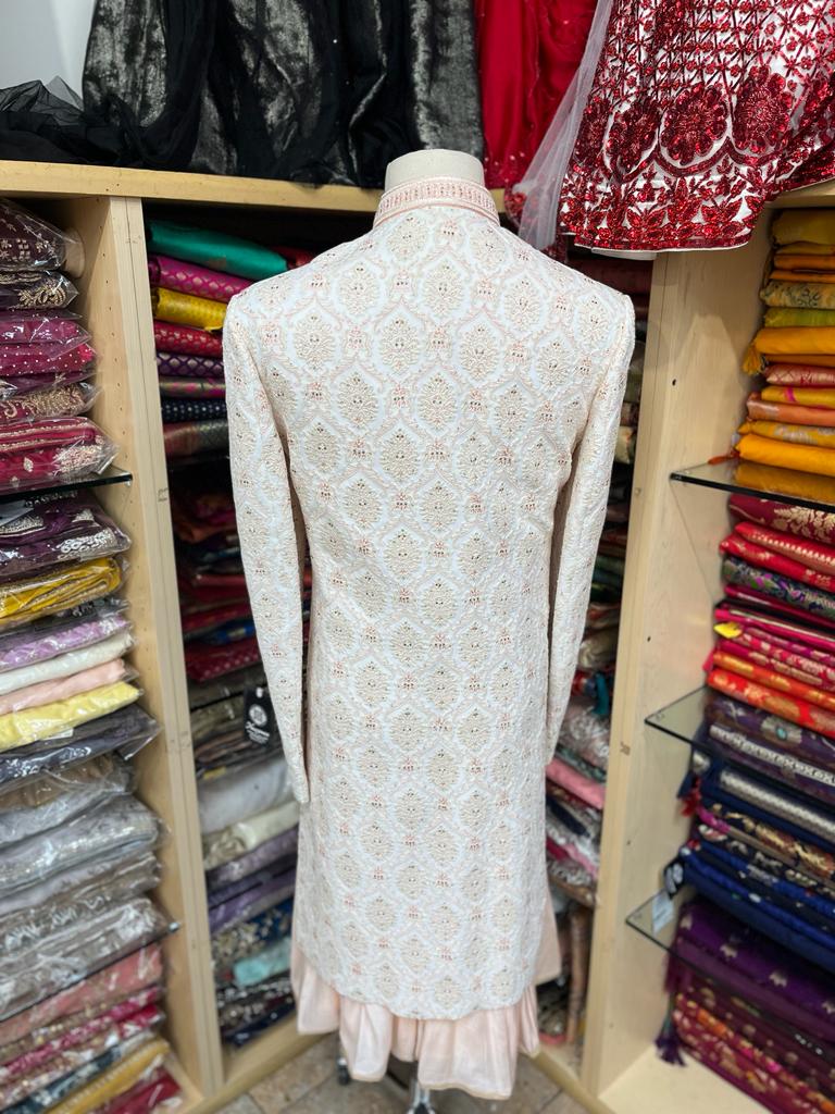 • Men's Ivory sherwani with all-over gold and pink thread embroidery. This sherwani is an easy to match with most lehengas