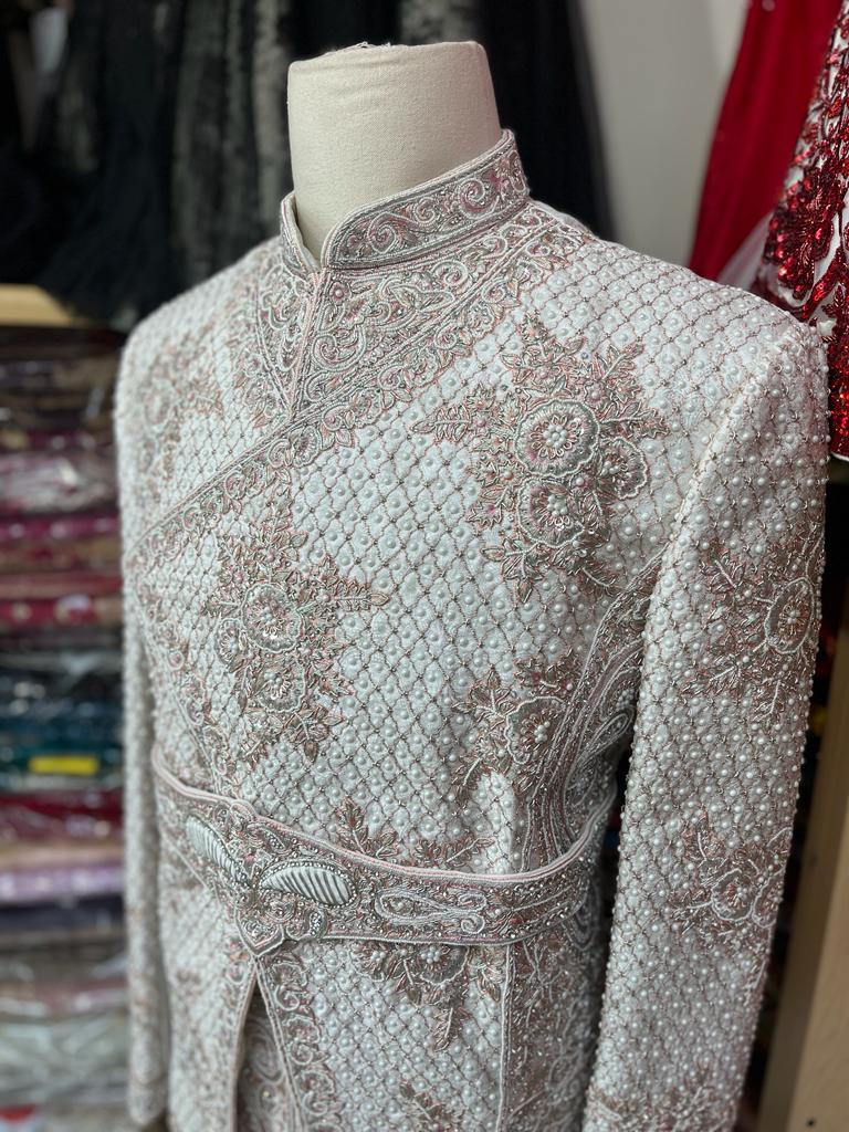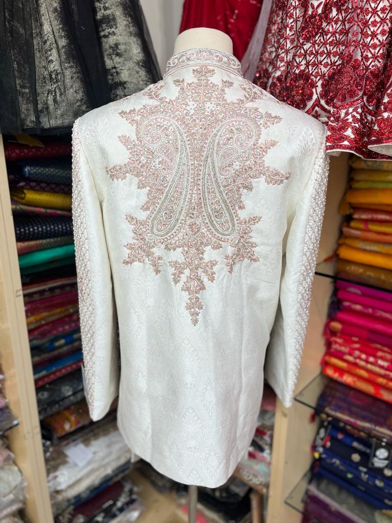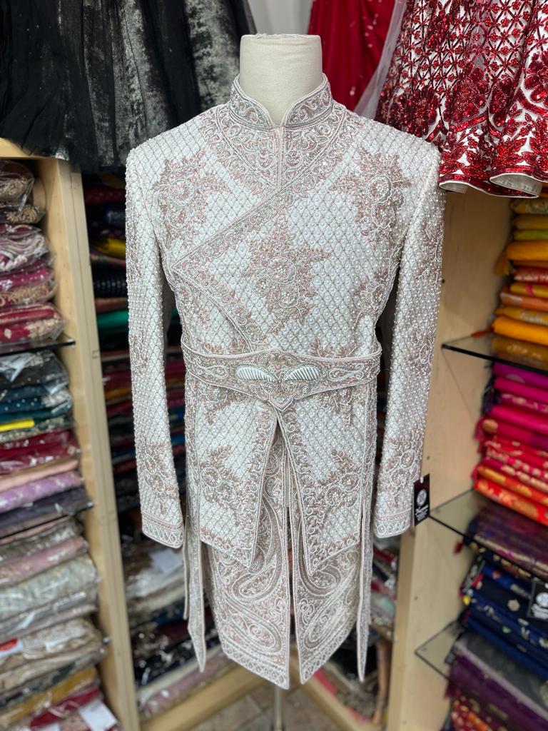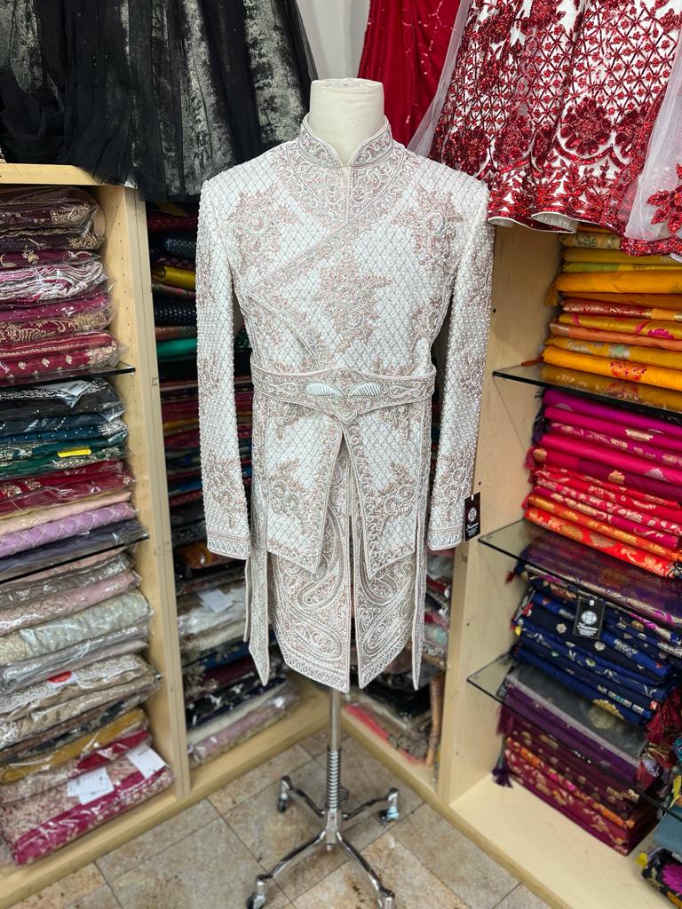 • Ivory asymmetric sherwani blooms with fine floral charmed with resham beautifies with French knots and the mandarin collar is enriched with multicolored threadwork for a marvelous finish. Paired with a matching churidar pants.