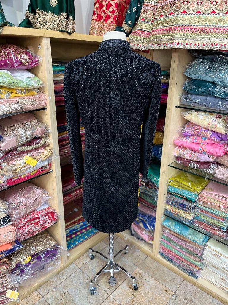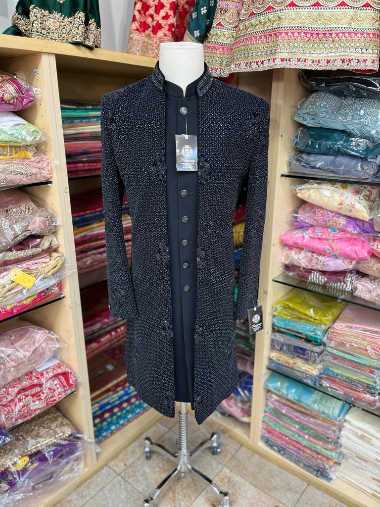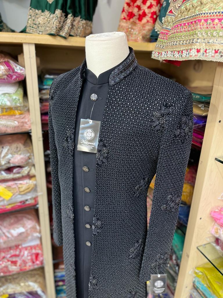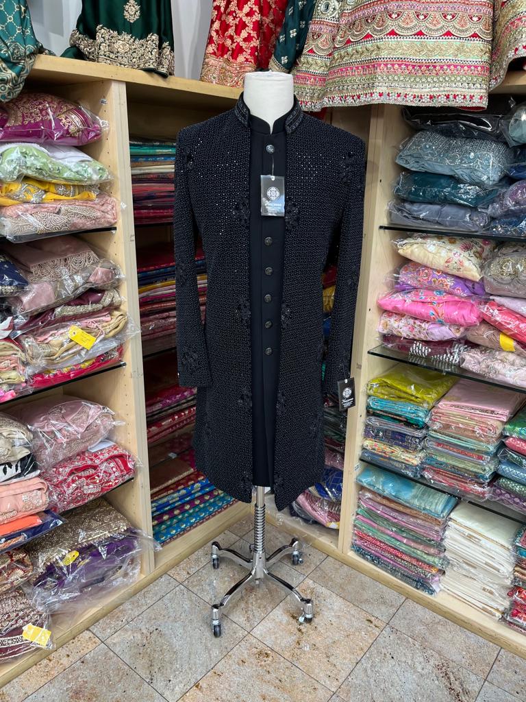 Men's open jacket sherwani. this sherwani is ideal for your reception. It's designed for maximum comfort. If you love to dance, this sherwani is for YOU! It is a double layer sherwani, with the inside being sleeveless and a Black color jacket on the outside.The black color jacket gives you a full range of motion when you want to dance.
