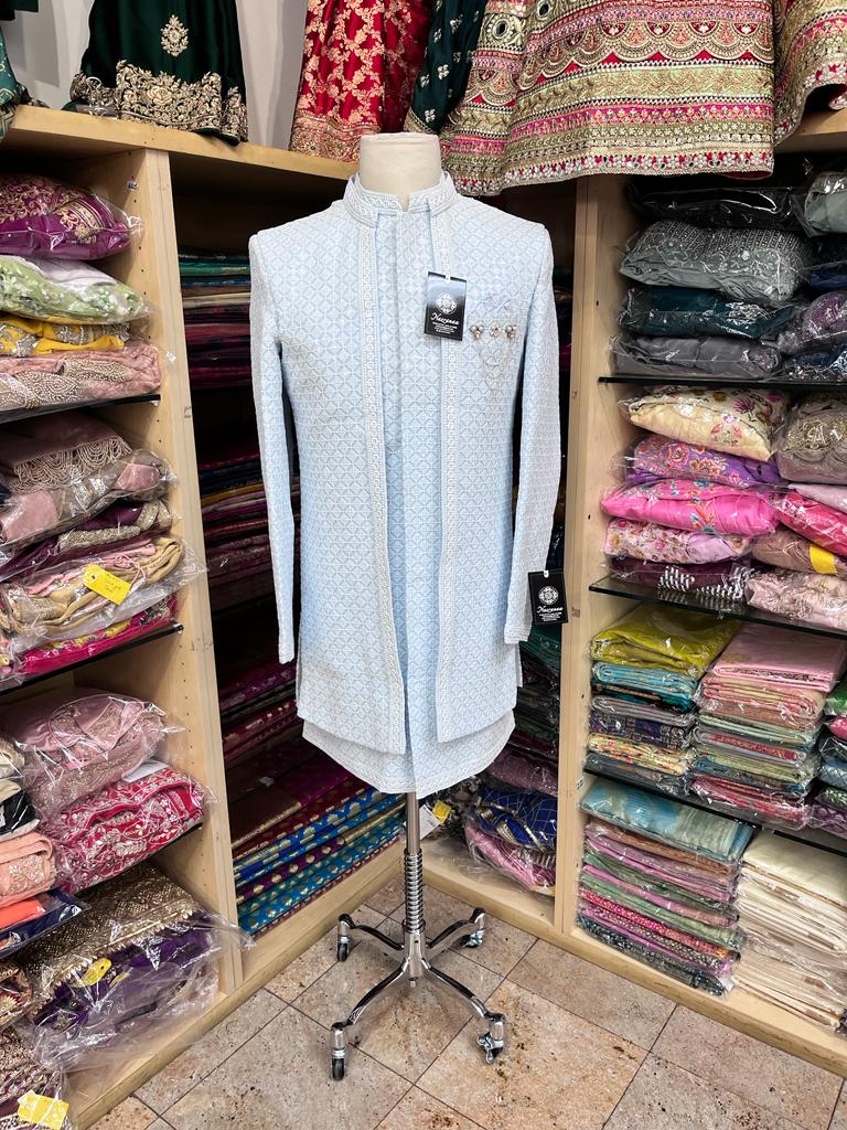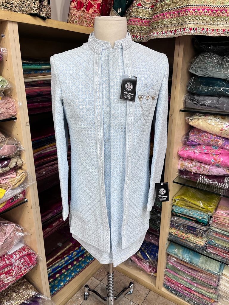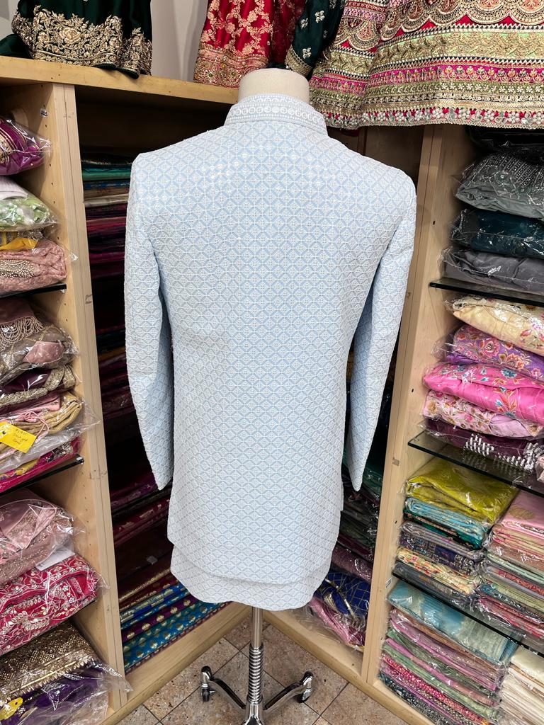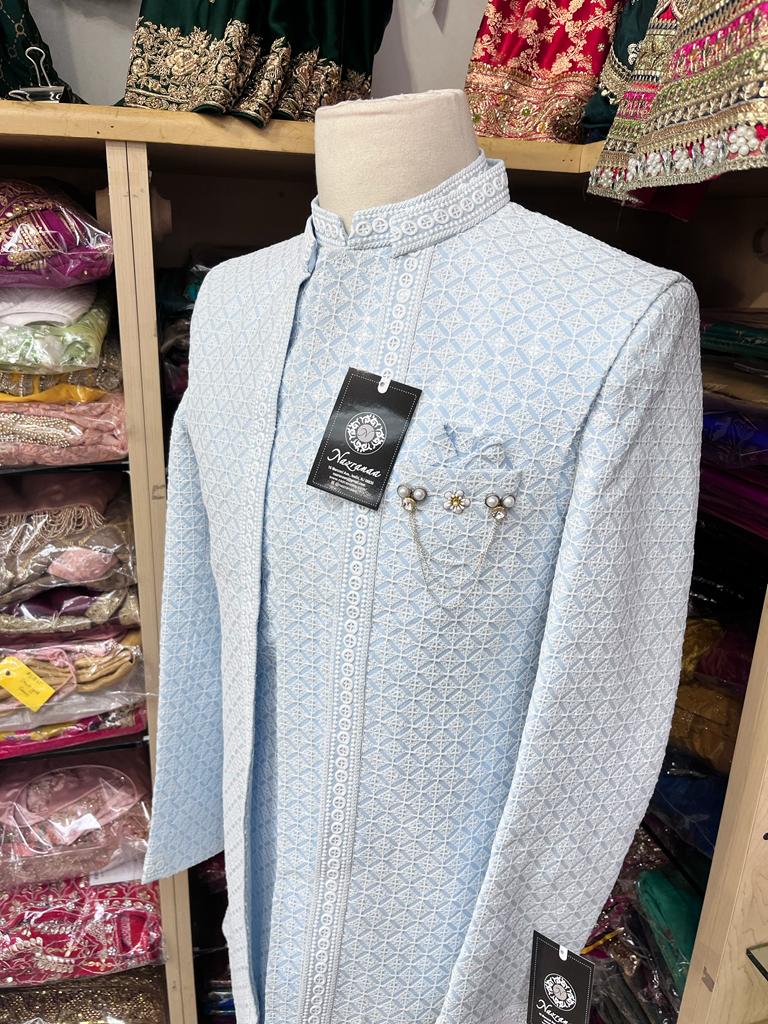 • Introducing our Sky Blue Open Jacket Sherwani with Transparent Sequins and Contrasting Ivory Thread Work, a stunning and modern traditional garment perfect for weddings or any special occasion. Made from high-quality materials, this sherwani features intricate ivory thread work embroidery with transparent sequins adding a touch of luxury, all in a beautiful sky blue color. Elevate your fashion game and order now.
