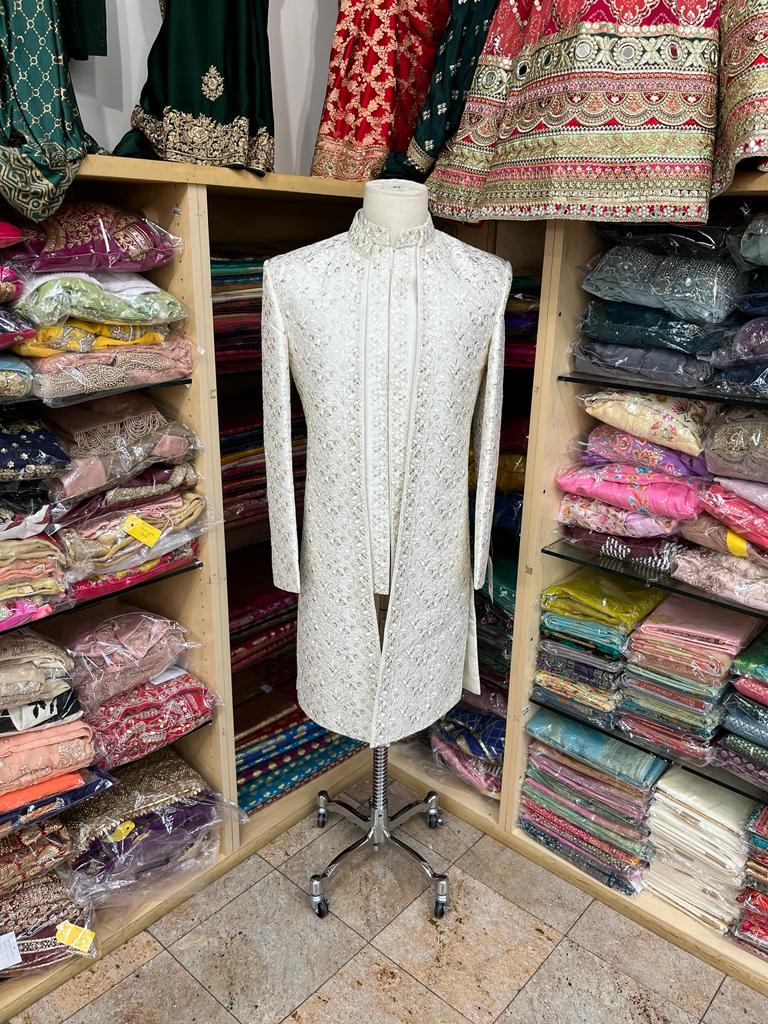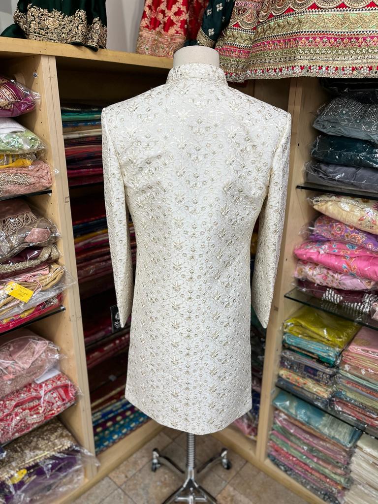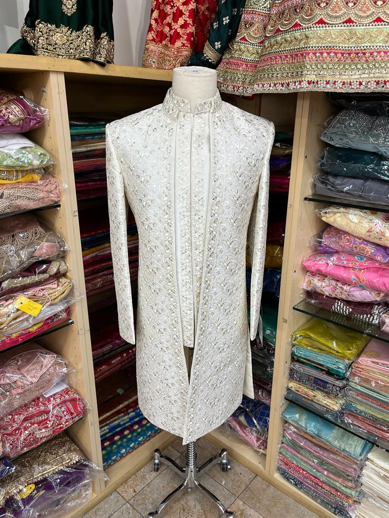 • Introducing our Ivory Open Jacket Sherwani with Thread Work and Short Button Down Kurta Inside, a modern and stylish twist on traditional Indian wear. Made from high-quality materials, this sherwani features intricate thread work embroidery and a contemporary open jacket style in a timeless ivory color, with a short button down kurta inside completing the look. Elevate your fashion game and order now.