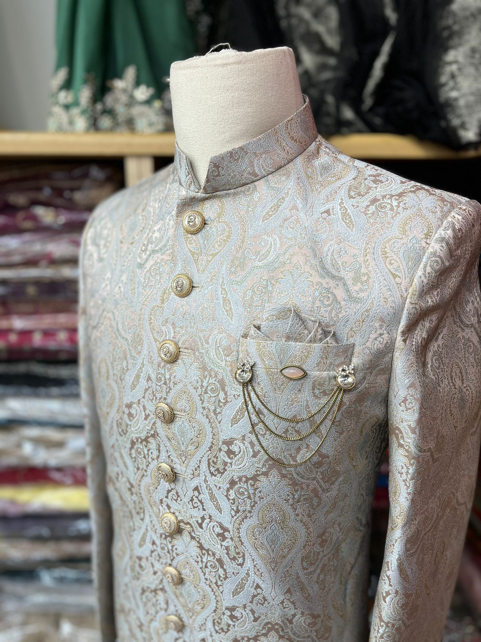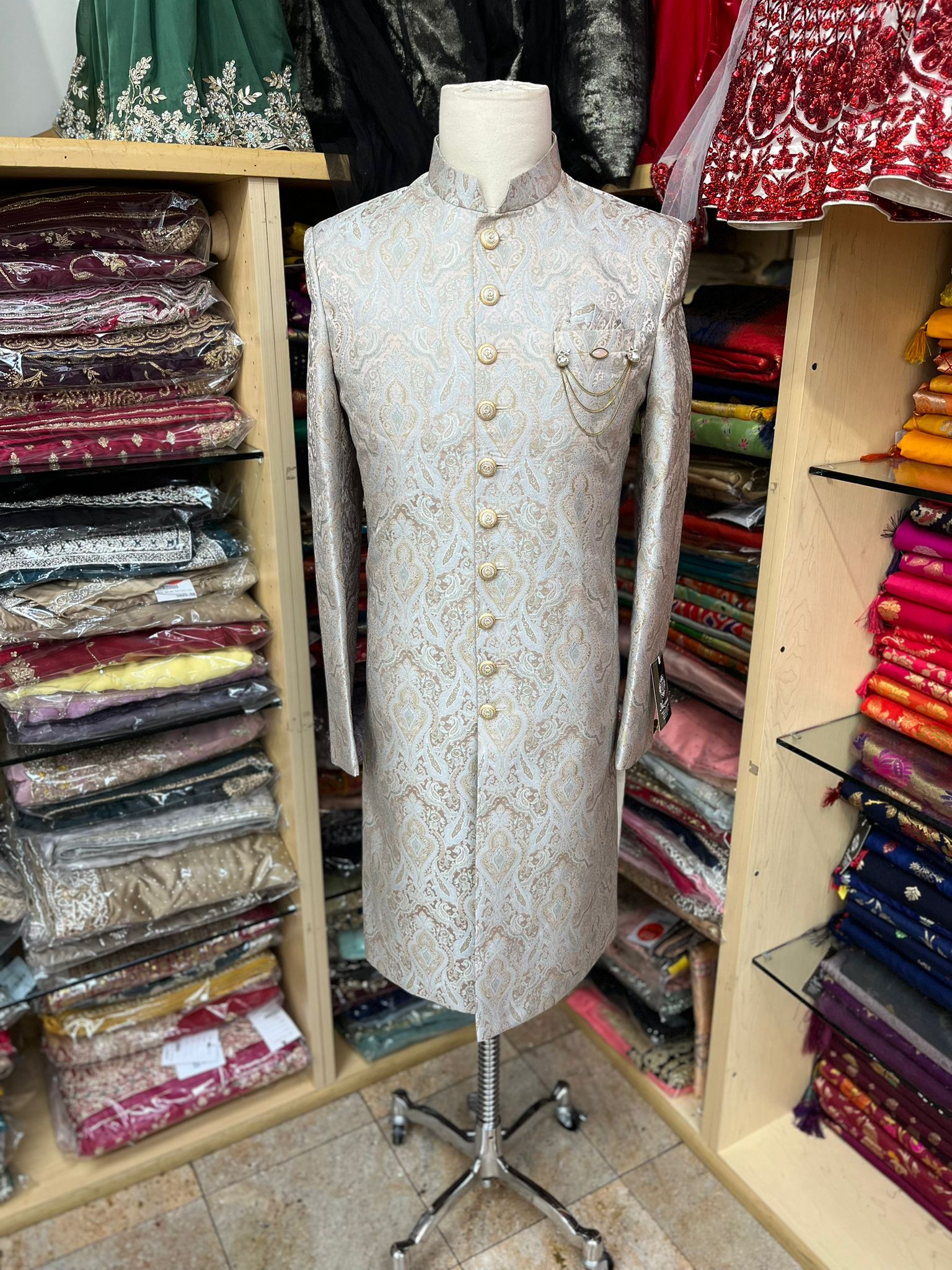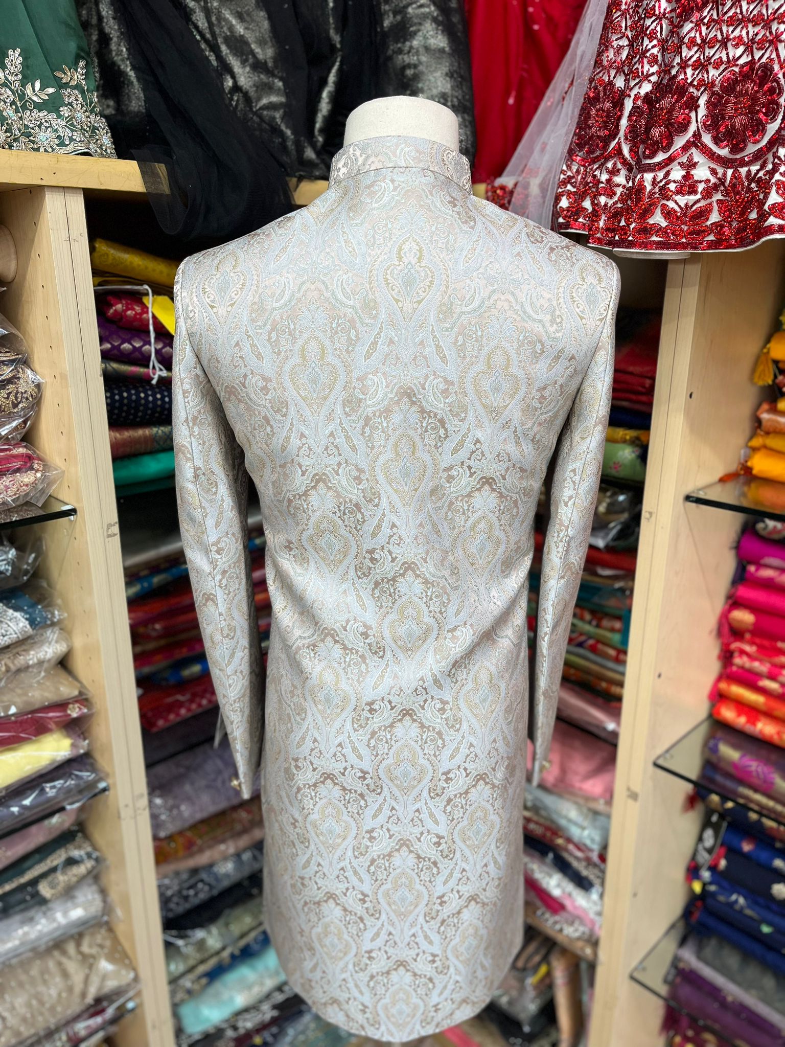 • Introducing our Grey Brocade Sherwani, a stylish and elegant traditional garment perfect for any formal occasion. Made from high-quality brocade fabric, this sherwani features a classic and sleek design in a stunning grey color, making it the perfect choice for any fashion-forward gentleman. Elevate your fashion game and order now.