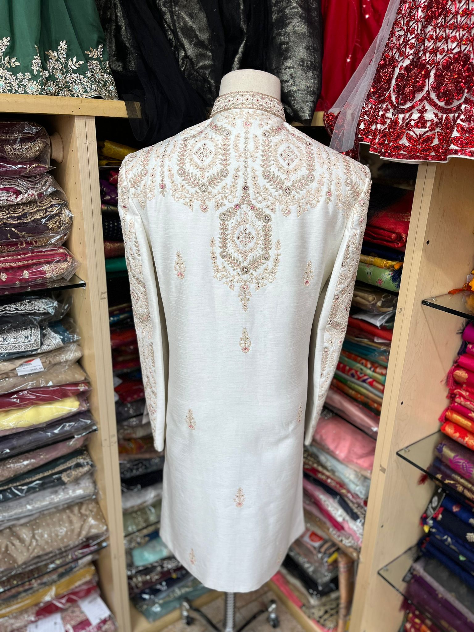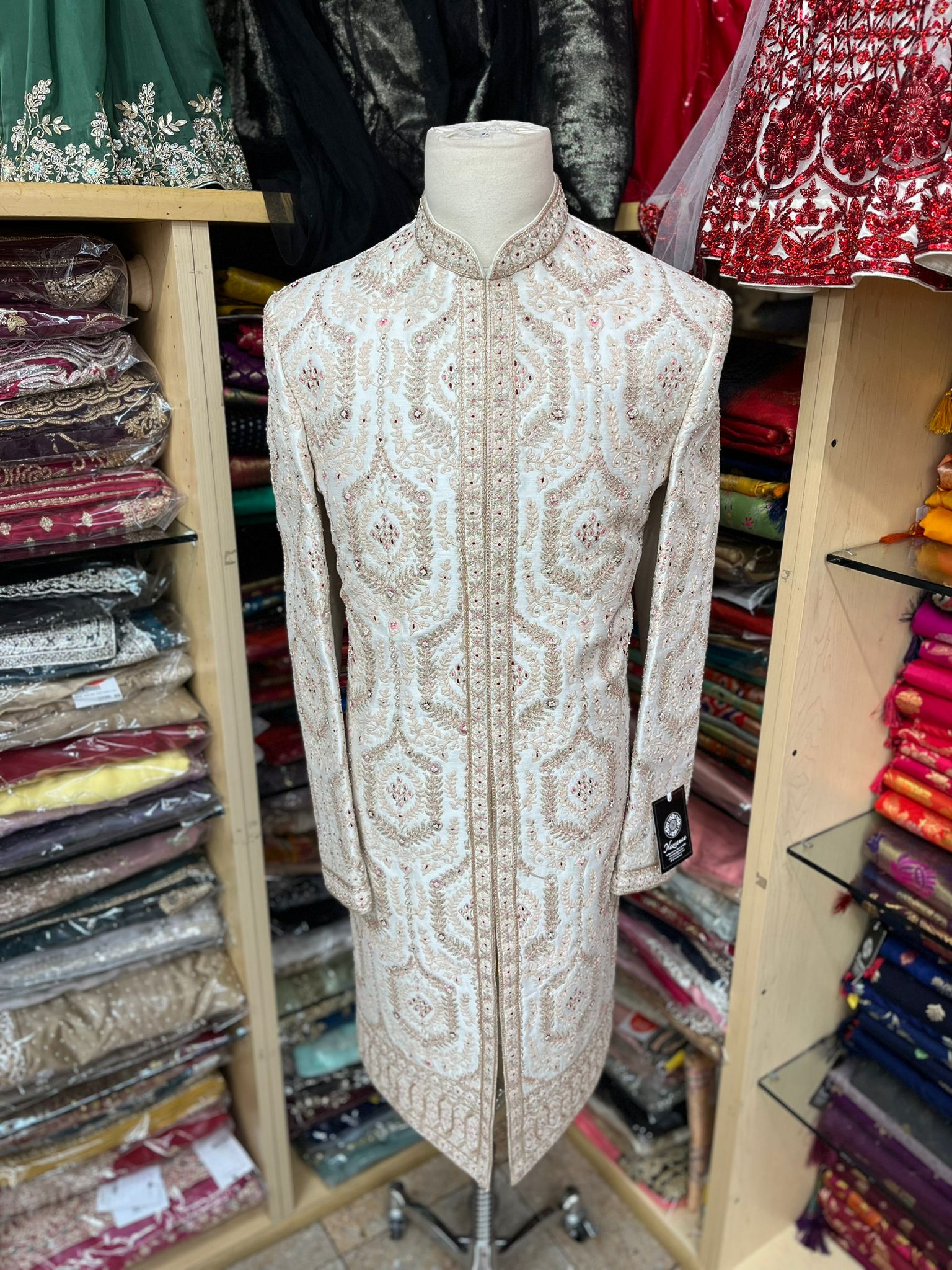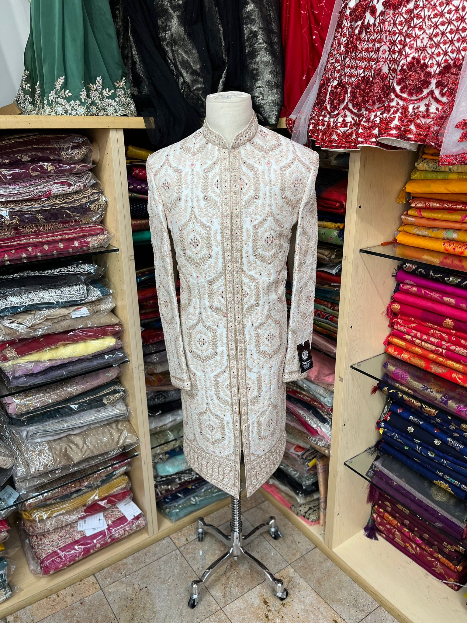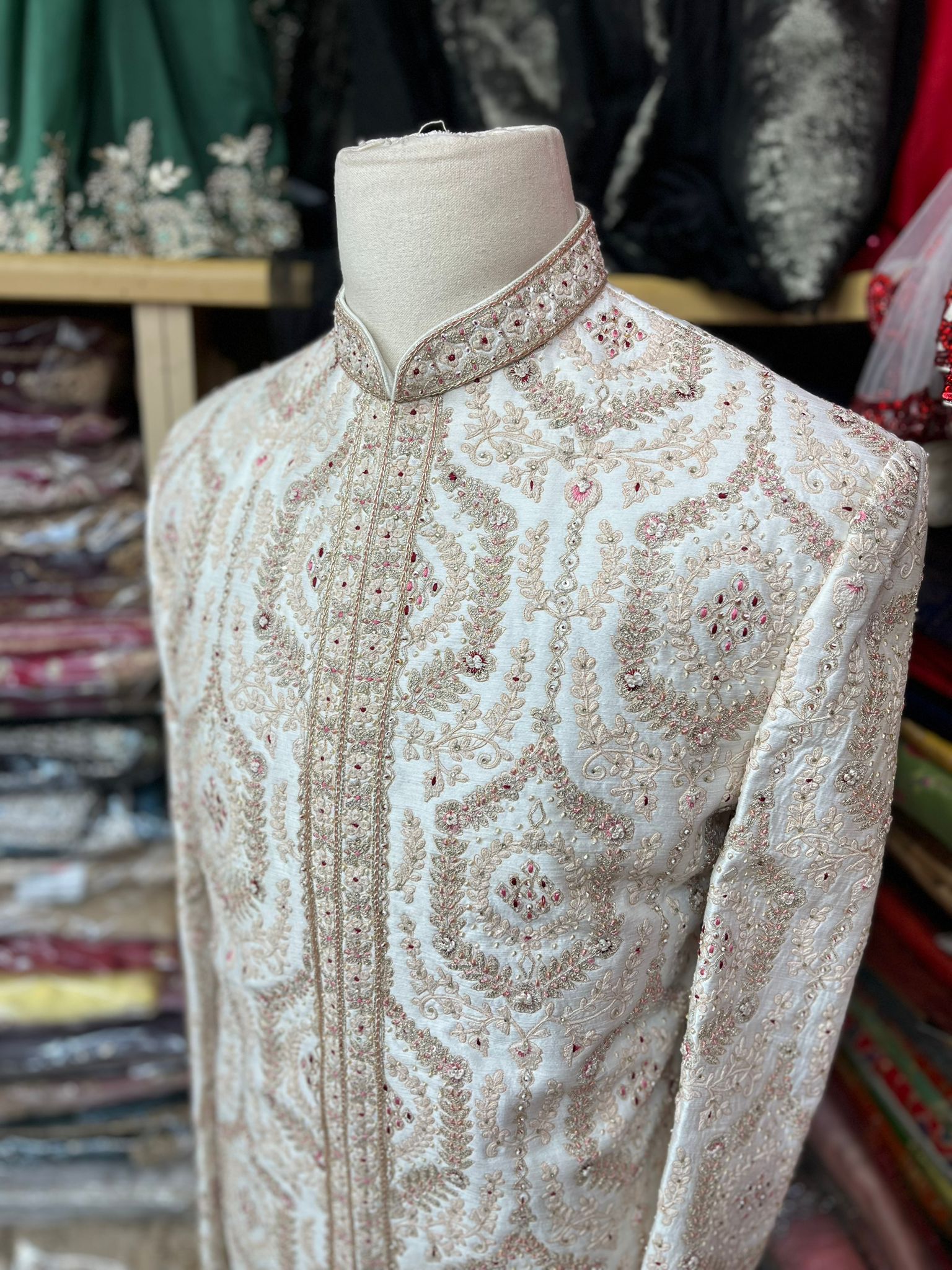 • Introducing our White Royal Sherwani, a stunning and elegant traditional garment perfect for weddings or any special occasion. Made from high-quality materials, this sherwani features exquisite pearl, stone, and cut dana work embroidery, creating a luxurious and regal design. This ensemble comes with matching pants, completing the look. Elevate your fashion game and order now.