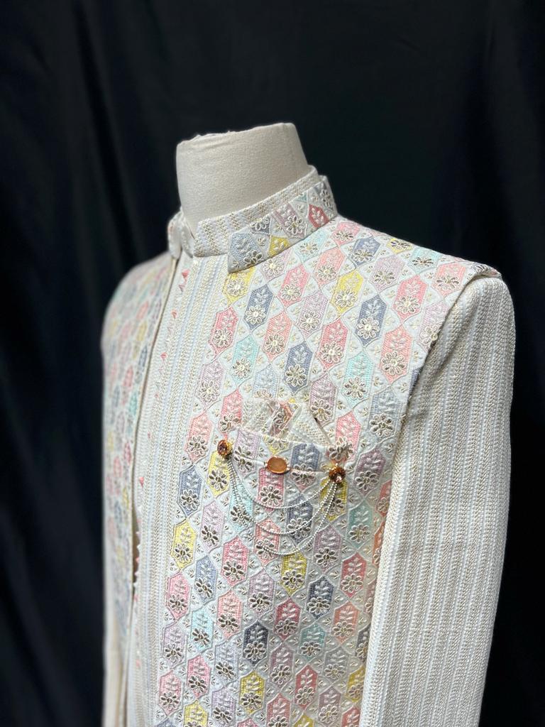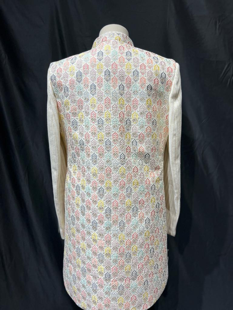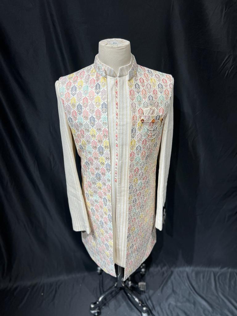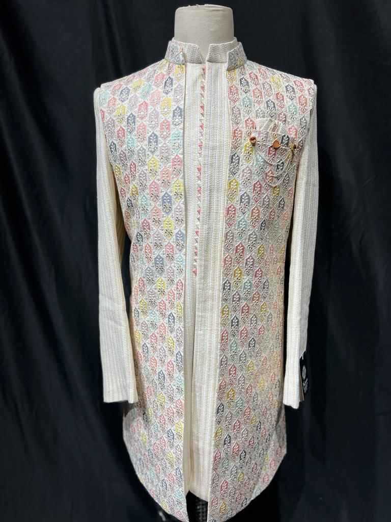 Introducing the Mens Sherwani G2-S178, perfectly designed with beautiful multi-colored thread work to give you an eye-catching, unique look. Notable features include a lightweight silk fabric, expertly crafted to ensure a sartorially superior finish. Make a statement with Mens Sherwani G2-S178.