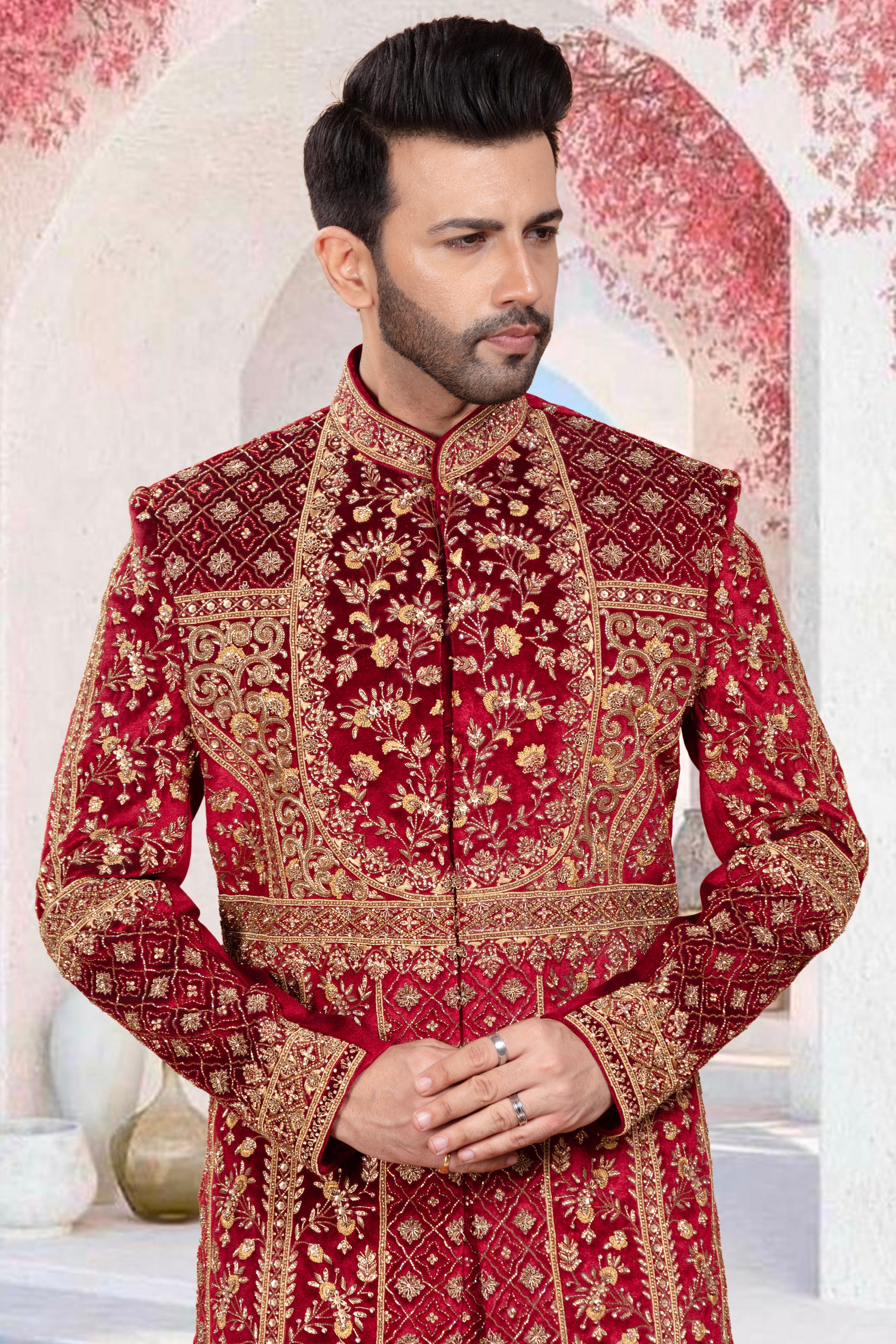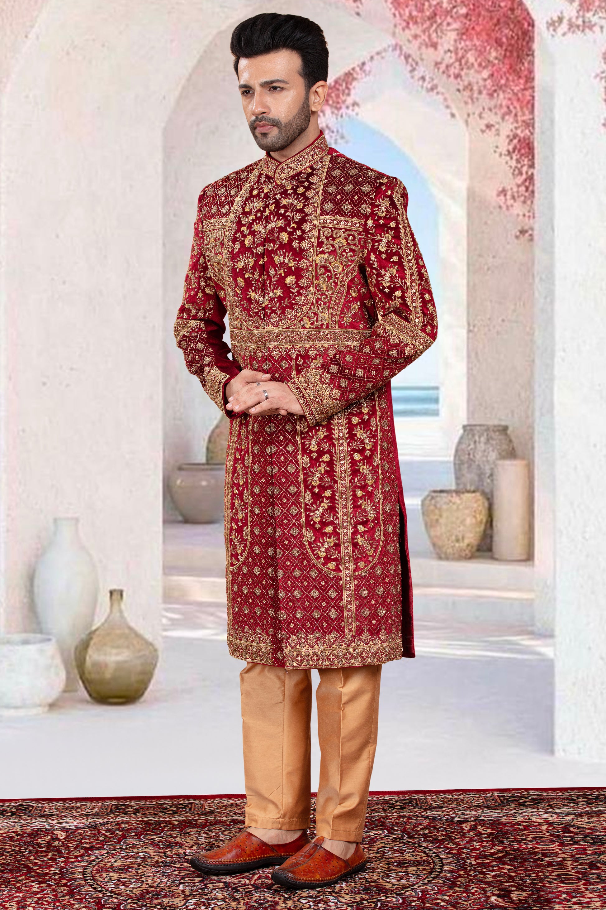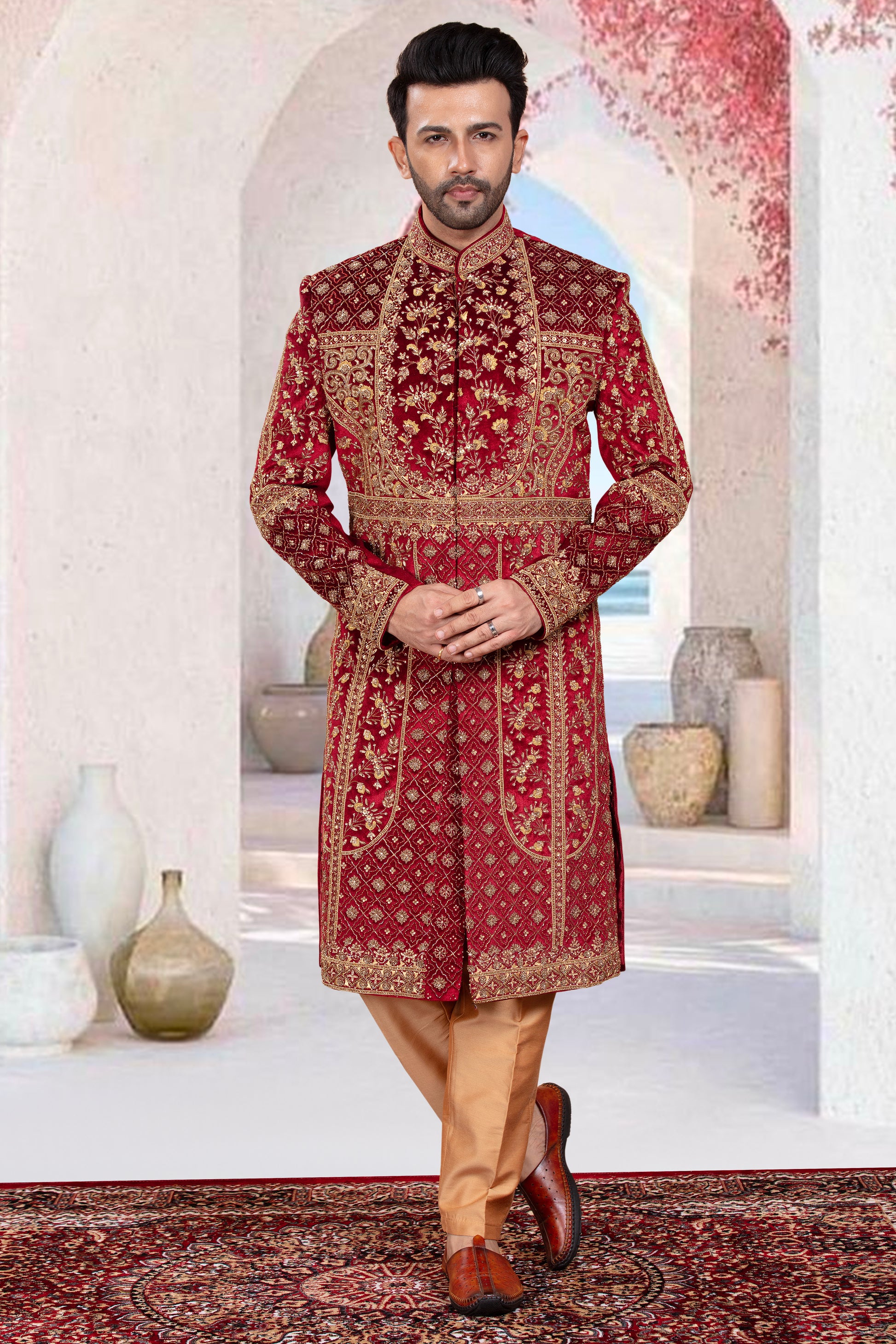 This Mens Sherwani is tailored for grooms, featuring traditional zardozi embroidery. Handcrafted for a perfect fit, it adds a touch of elegance and cultural authenticity to your special day. Own this piece of art that is steeped in history and adorned by experts.