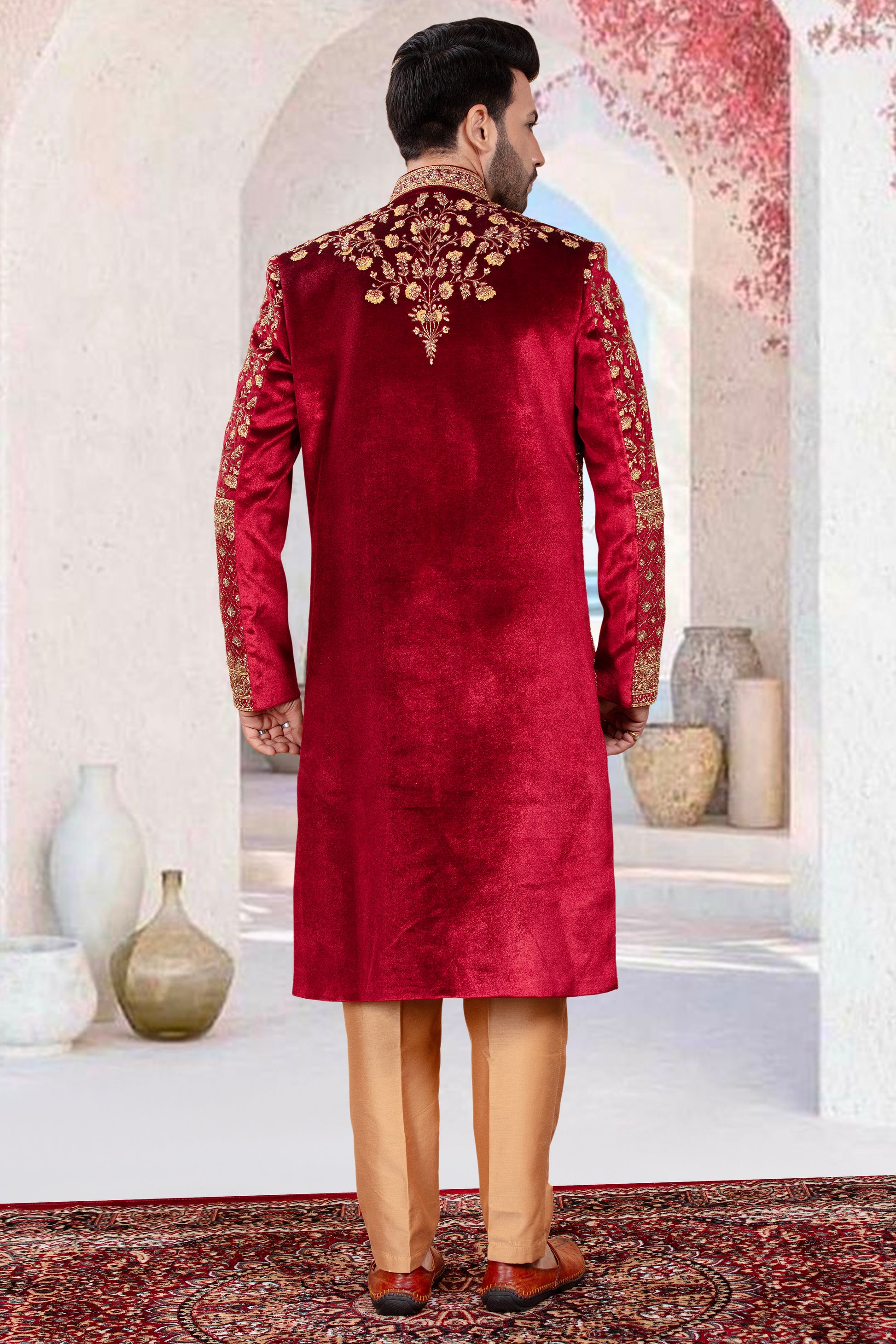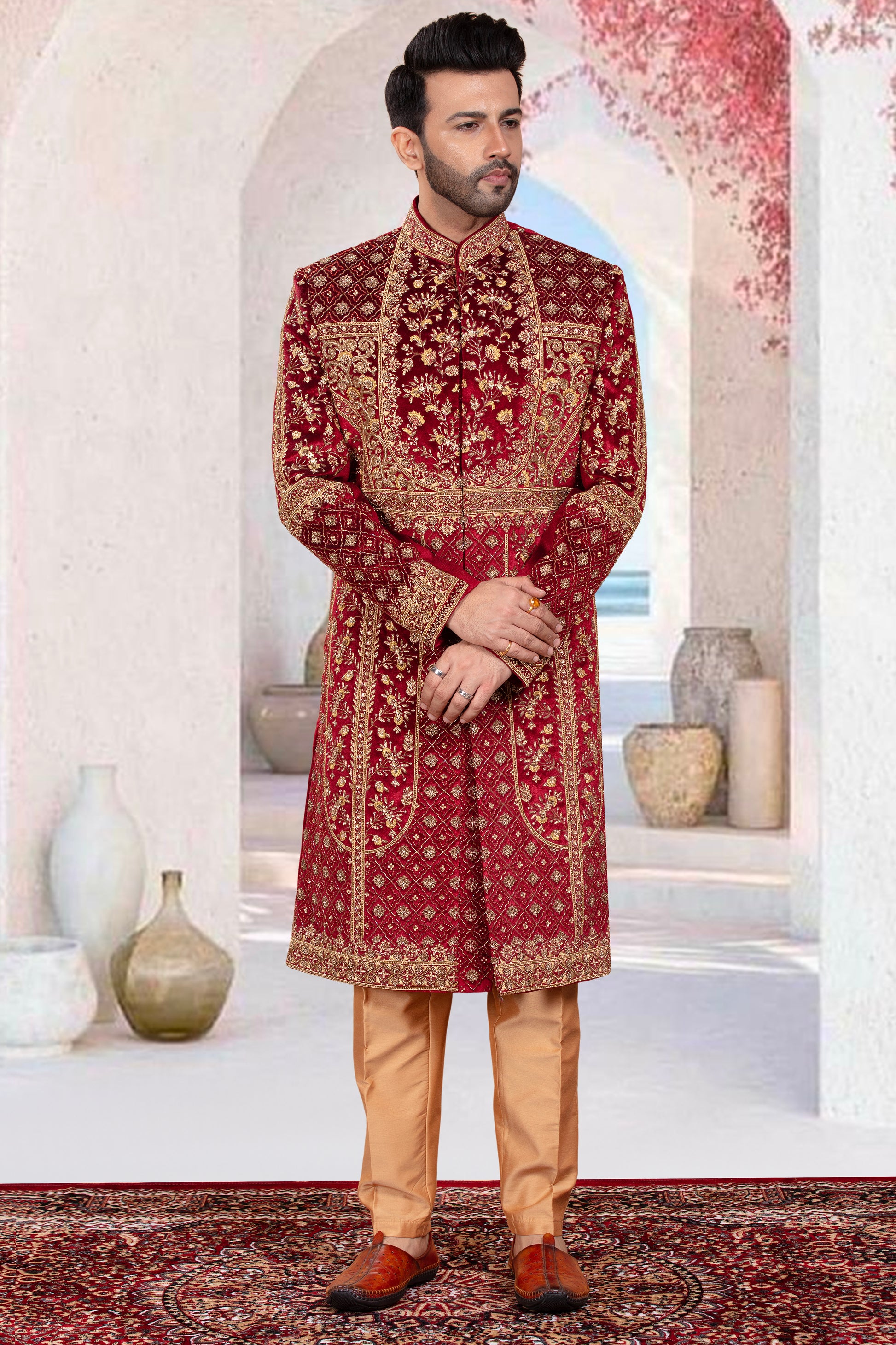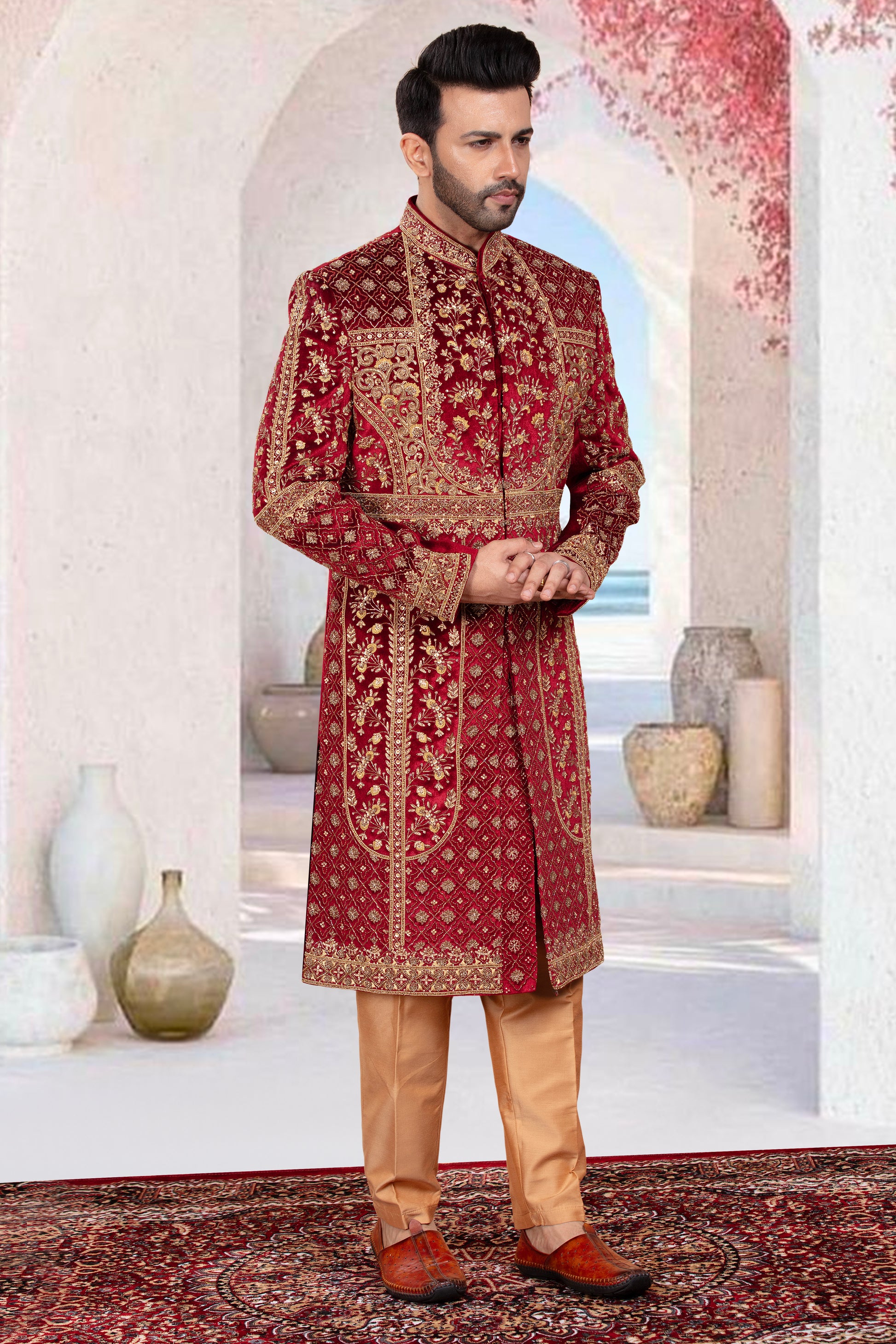 This Mens Sherwani is tailored for grooms, featuring traditional zardozi embroidery. Handcrafted for a perfect fit, it adds a touch of elegance and cultural authenticity to your special day. Own this piece of art that is steeped in history and adorned by experts.