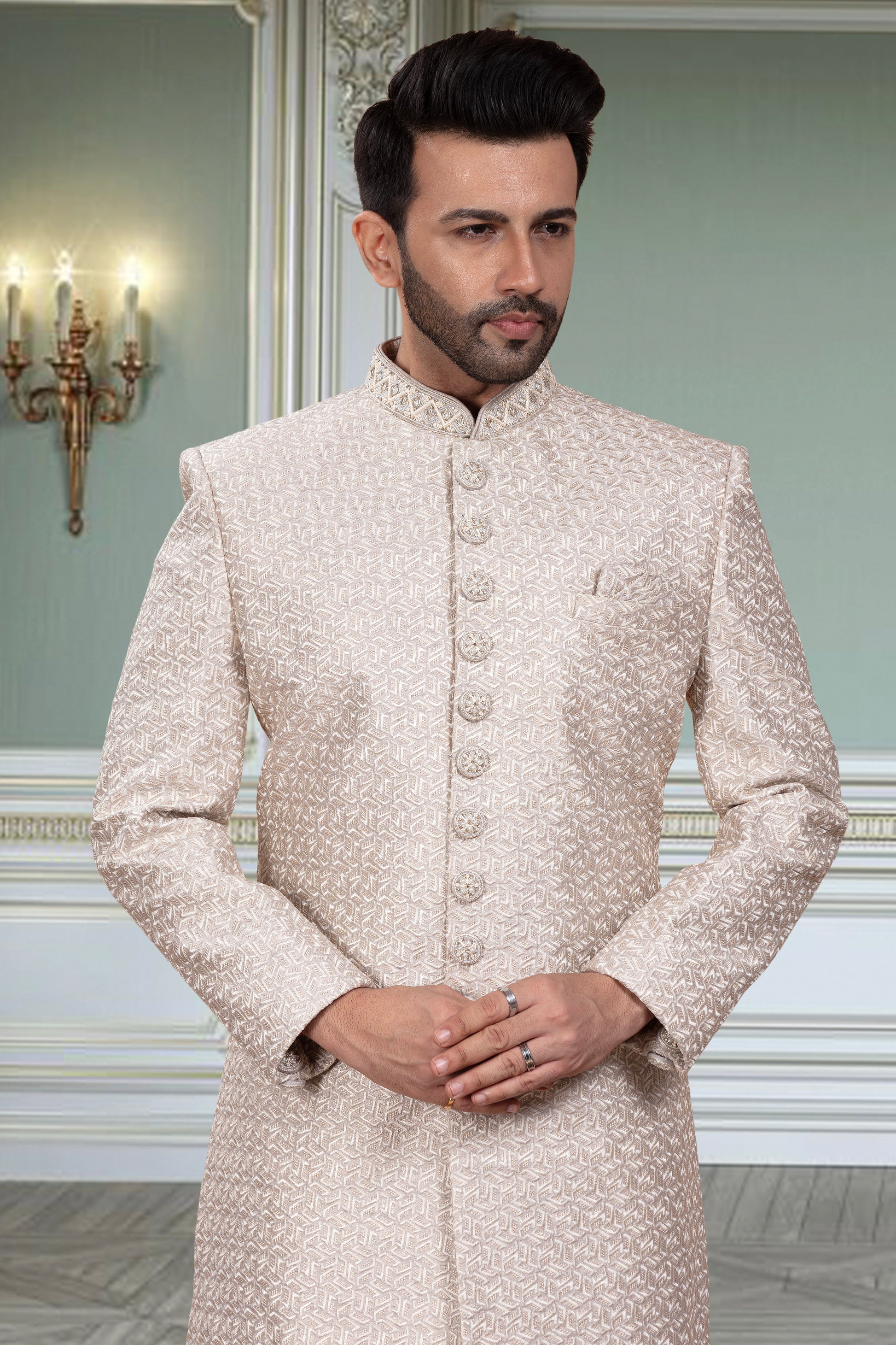 This mens sherwani, style number M42-S143, features a classic design with intricate thread embroidery. This traditional embroidery adds a touch of elegance to the garment, making it perfect for special occasions. The embroidery is done with precision and care, ensuring a high-quality finish for a sophisticated look.