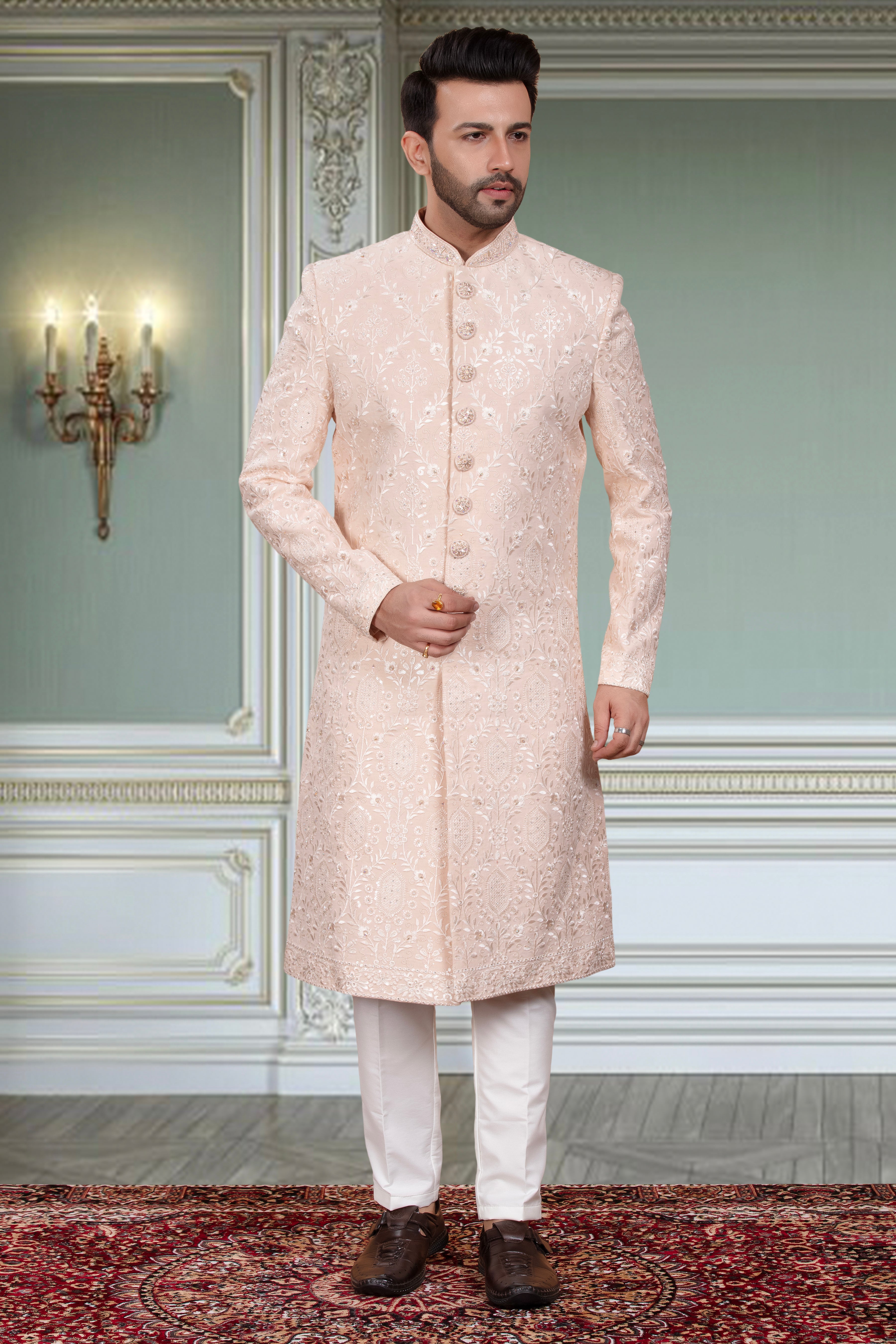 This mens sherwani (traditional Indian attire) features thread embroidery with sequin, adding intricate detail and shimmer. Perfect for formal and cultural occasions, this garment showcases skilled craftsmanship and adds a touch of luxury to any wardrobe.