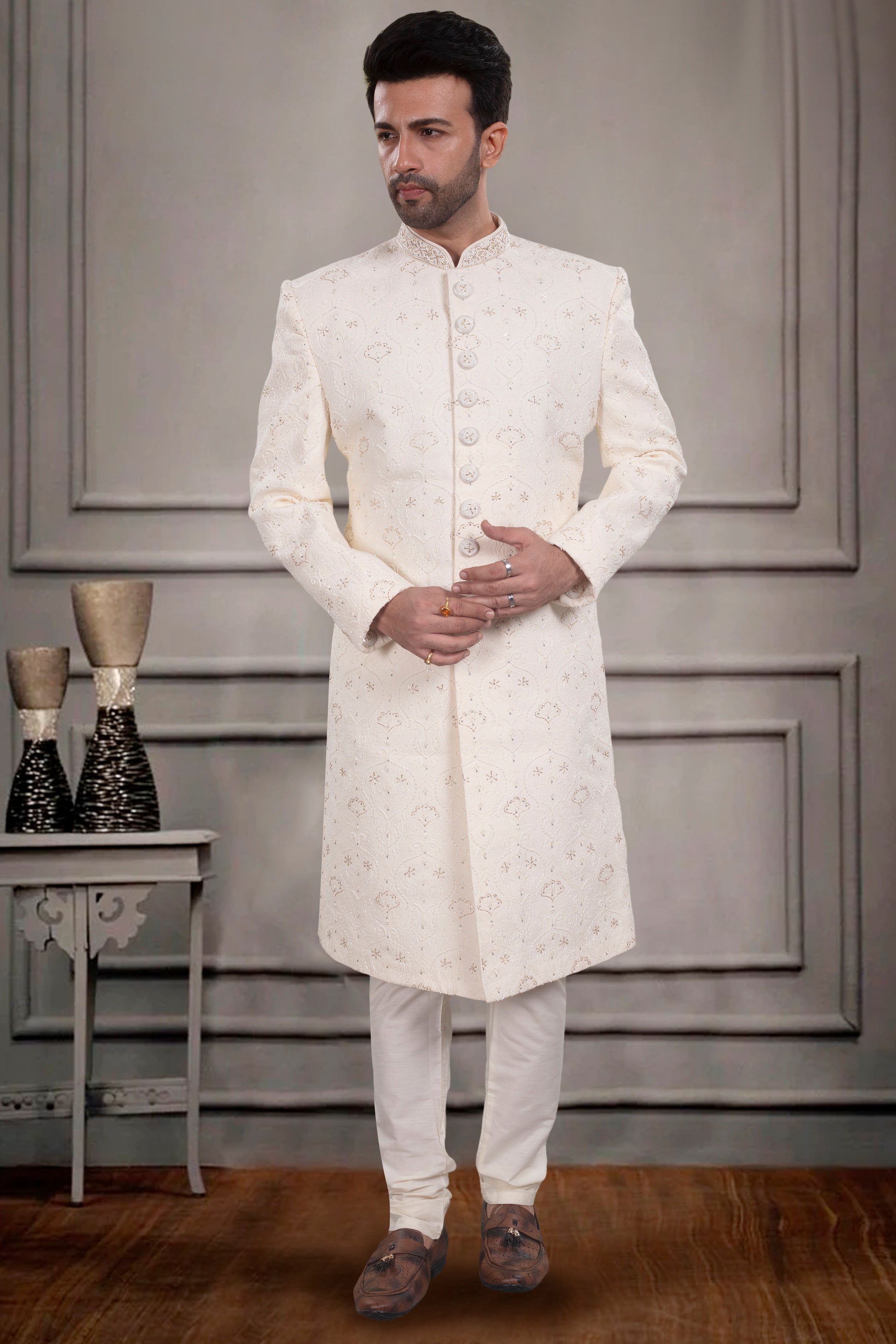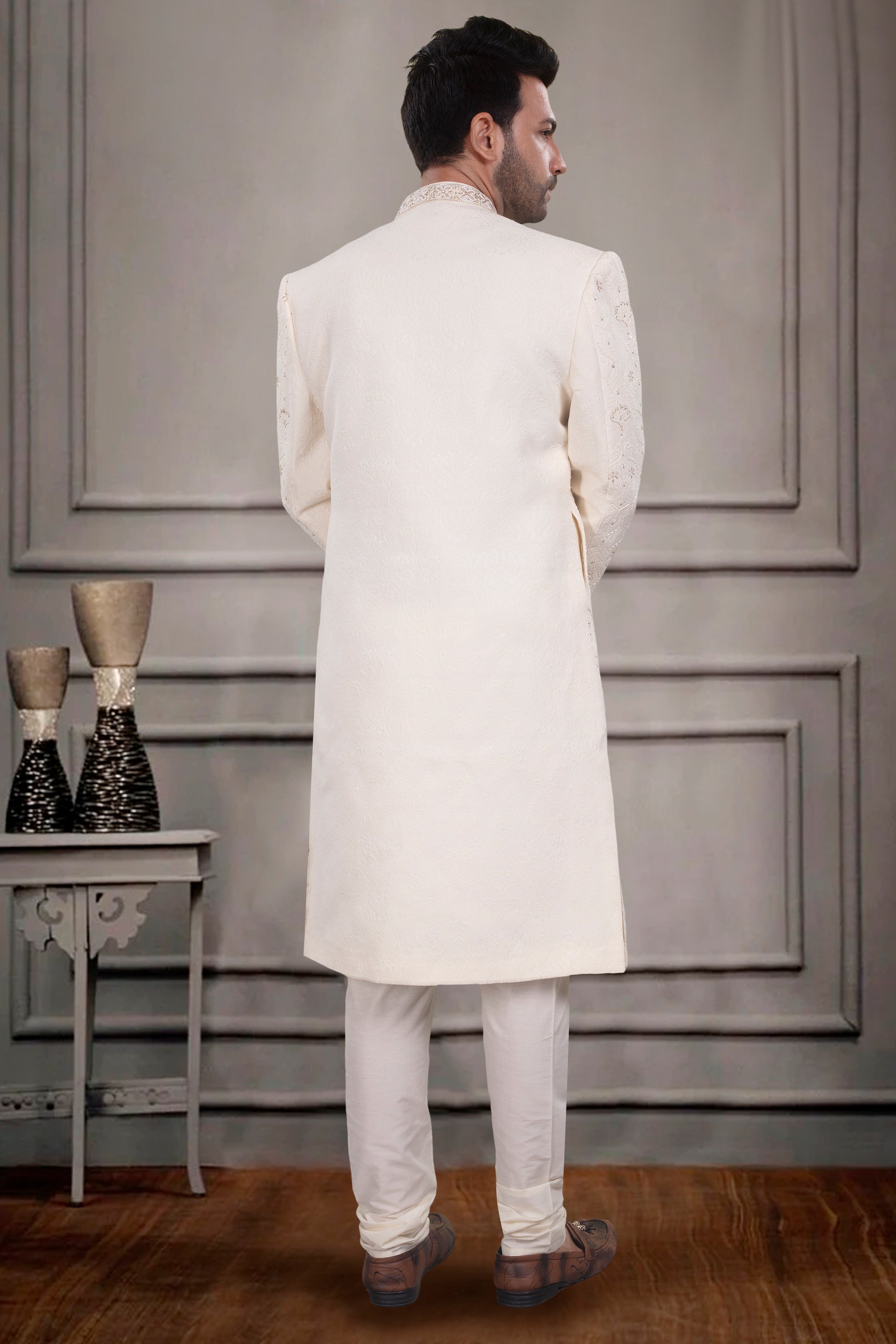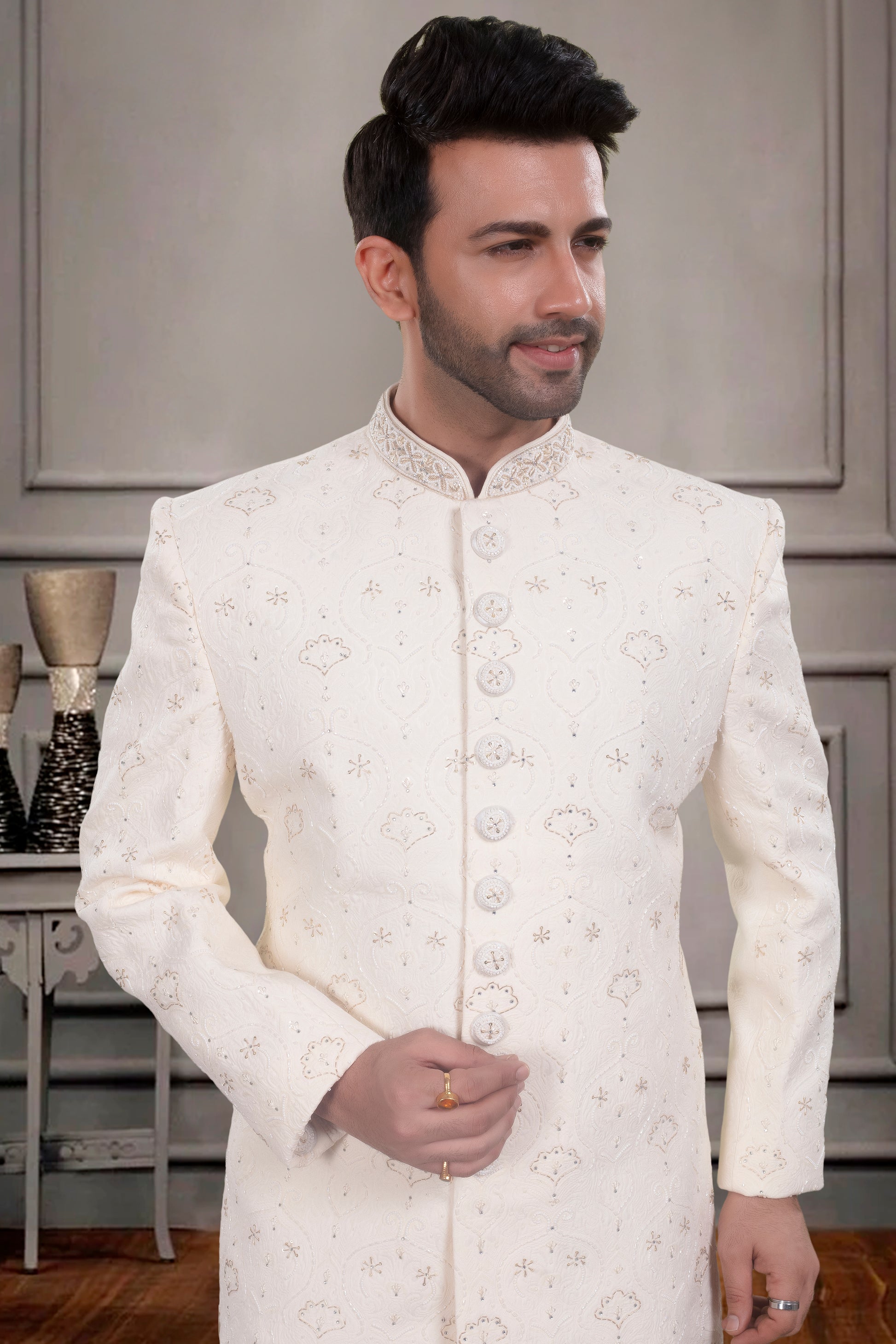 Classic never goes out of style—and this ivory sherwani is proof, adorned with white beads and fine zardozi work. The detailed craftsmanship creates a rich texture, while the subtle shimmer of the zardozi adds depth and regality to the ensemble.