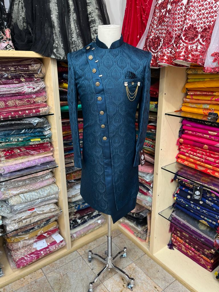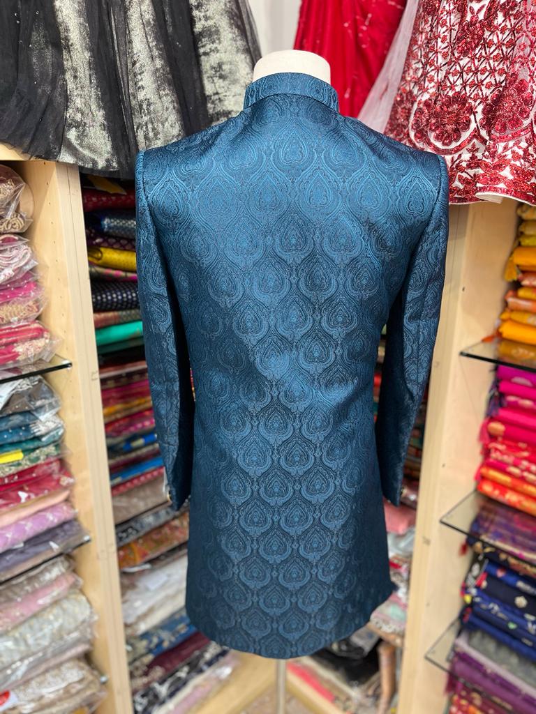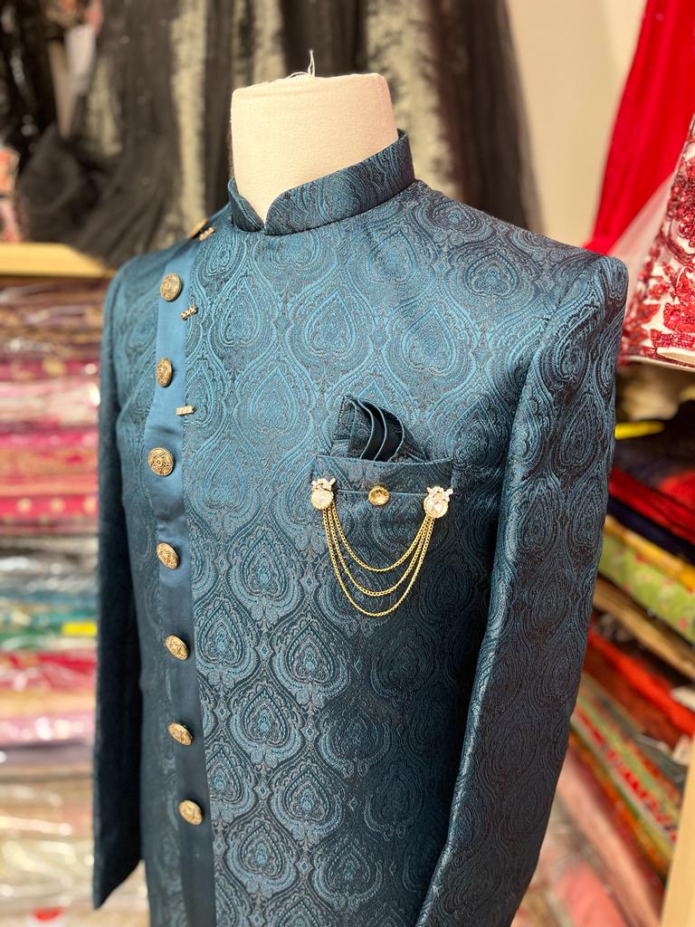 asymmetric sherwani in Teal color with Bronze buttons perfect for sangeet and reception.
