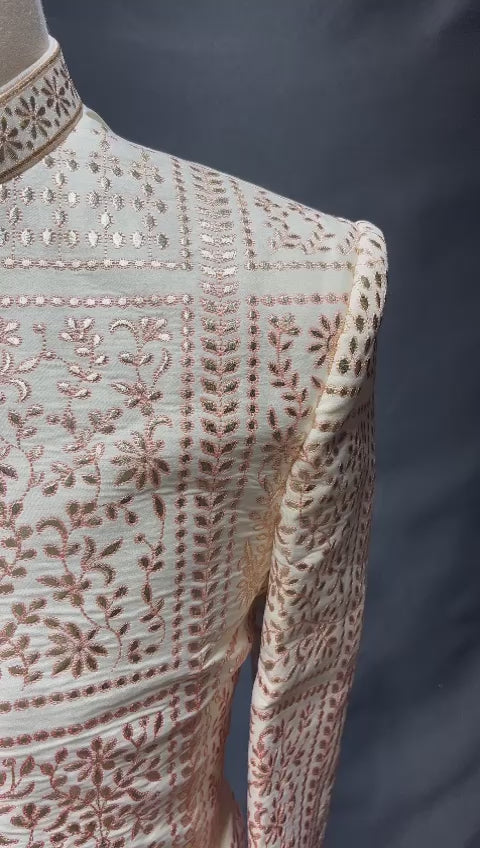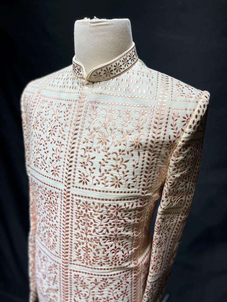 The Mens Sherwani U2-S06 offers a classic style with intricate detail. The ivory color and thread work make this sherwani perfect for formal occasions. It is made from superior quality material, offering a luxurious look and feel.