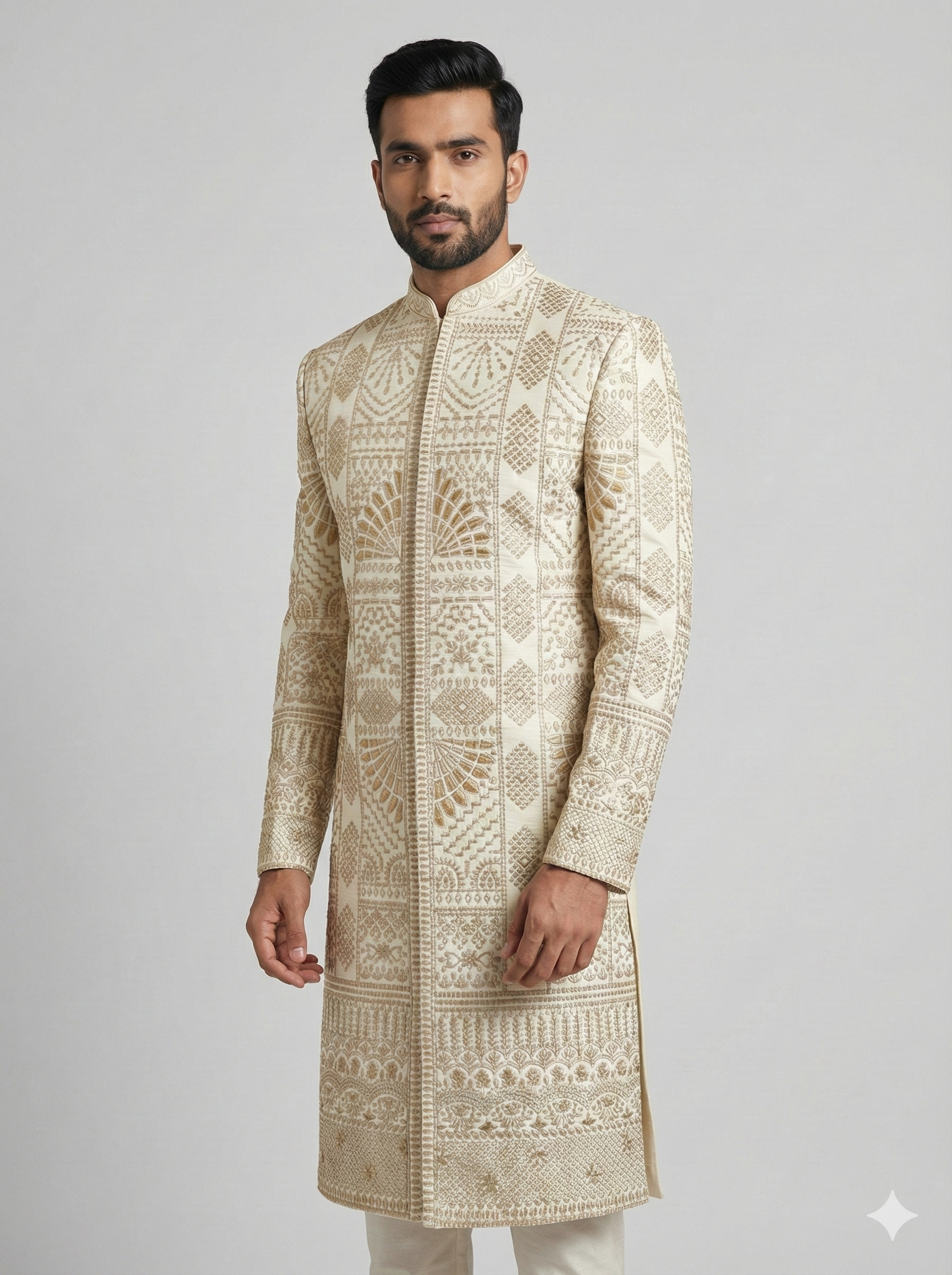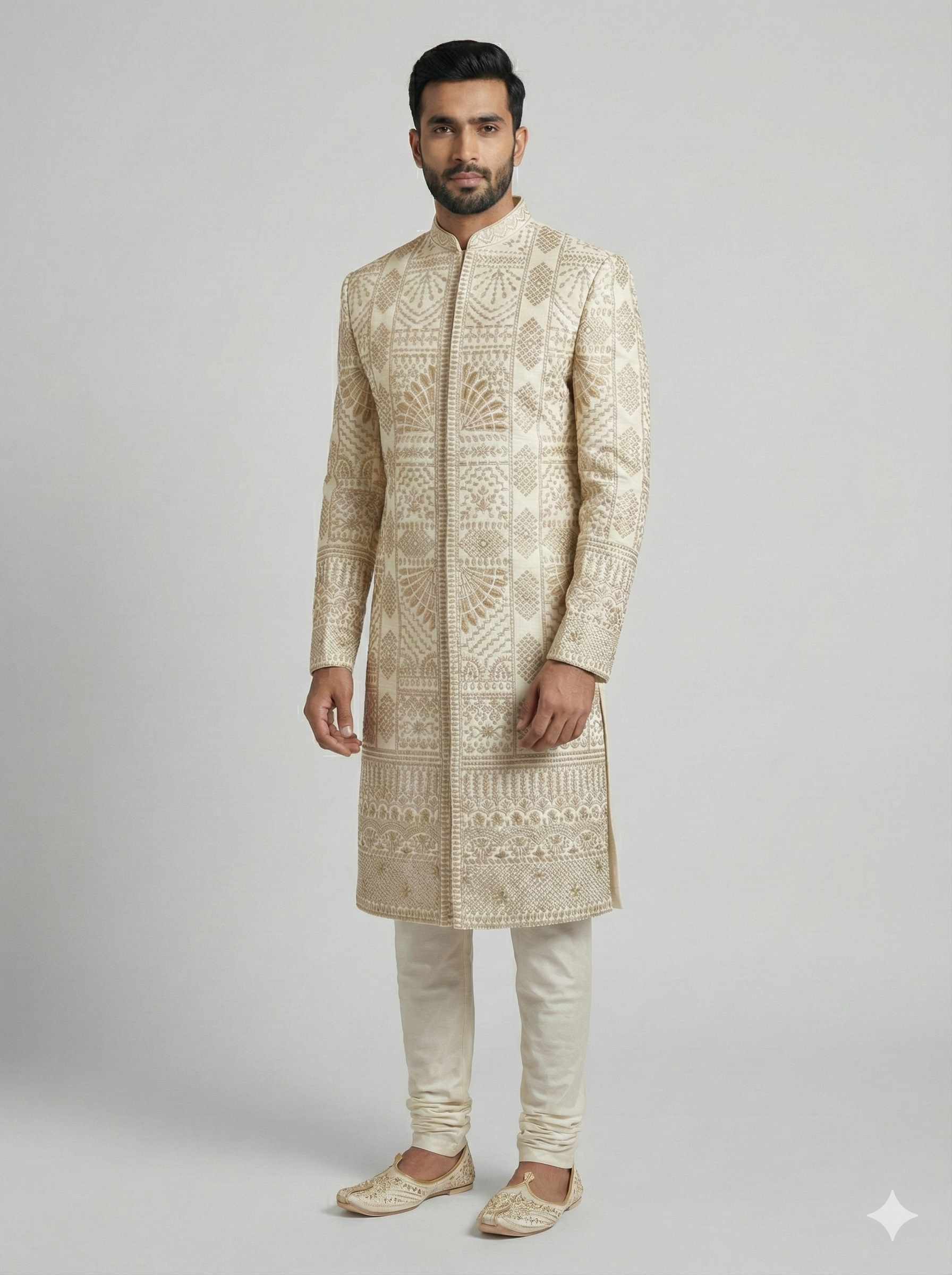 Our Men's Sherwani U2-S07 is an ivory sherwani with intricate thread work. The lightweight fabric is perfect for formal occasions, and the premium quality and enduring design ensure you look your best. Be the center of attention with this timeless classic.