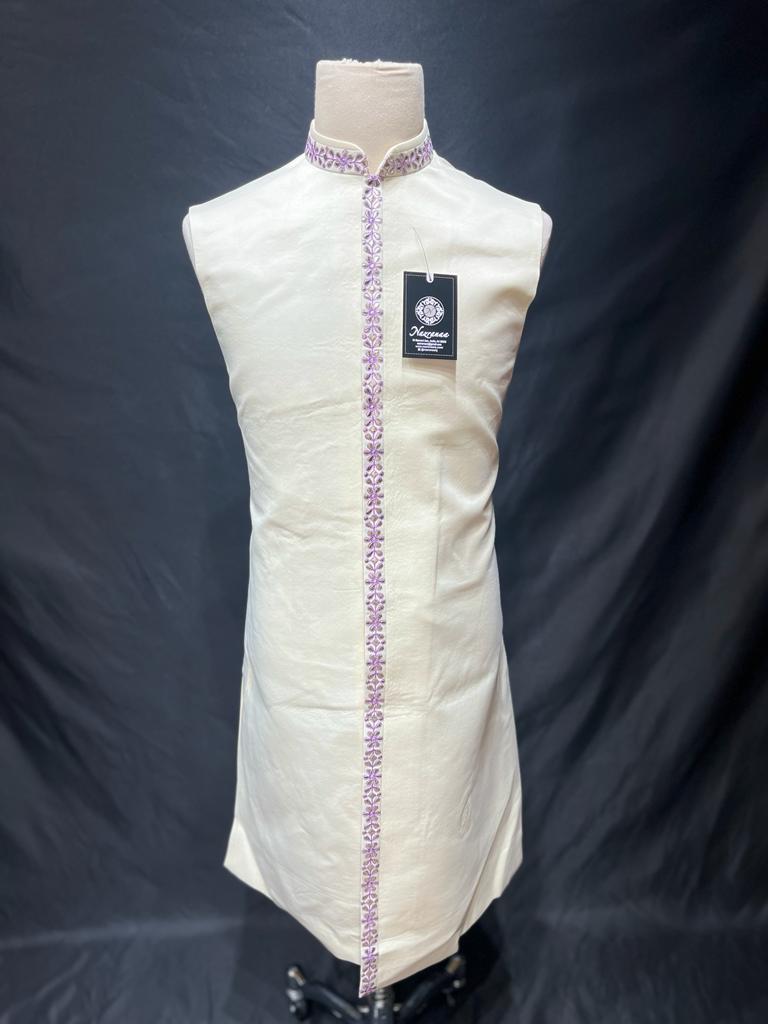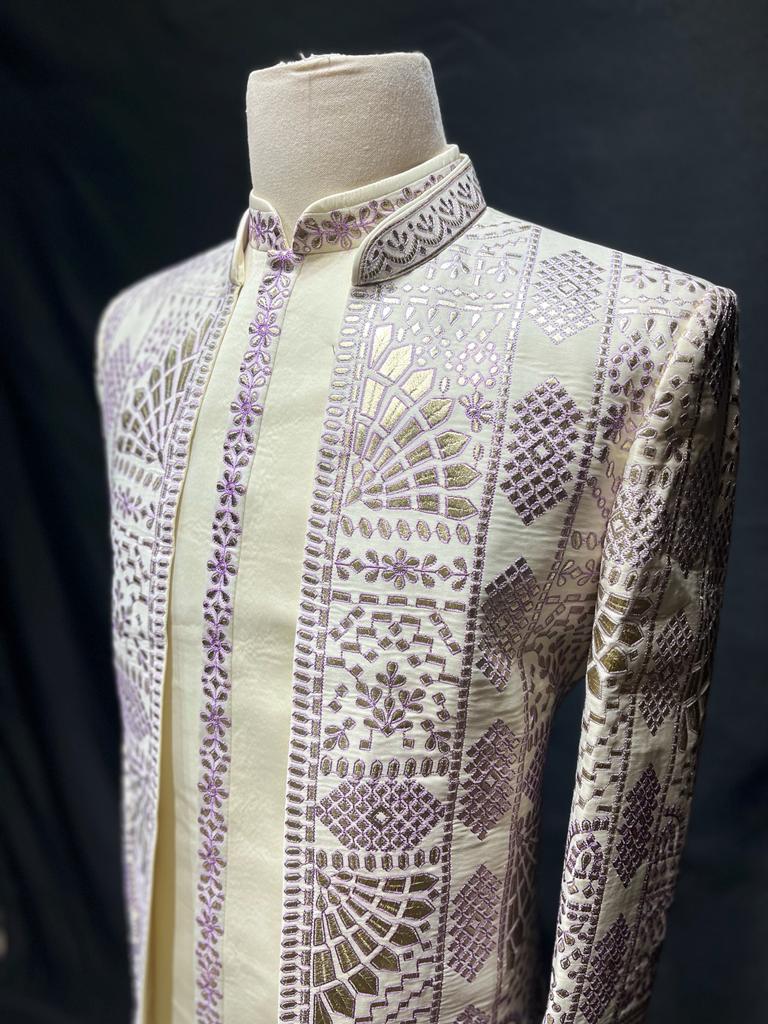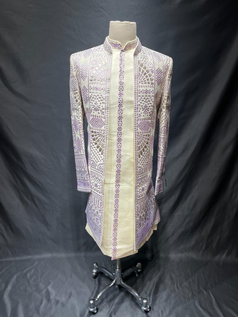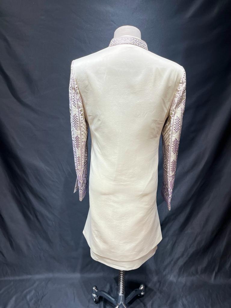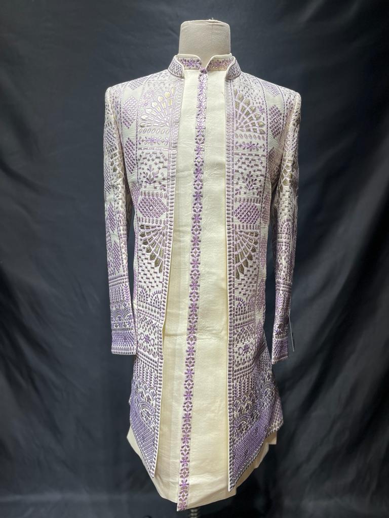Experience the perfect blend of style and culture with this Mens Sherwani. Hand crafted with an open jacket, detailed with intricate thread work and fine material, this elegant garment is a stunning choice for any special occasion.