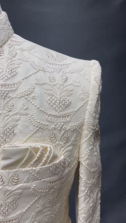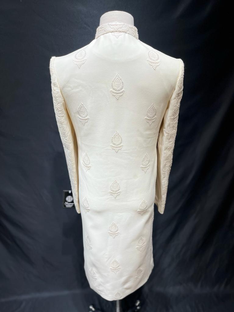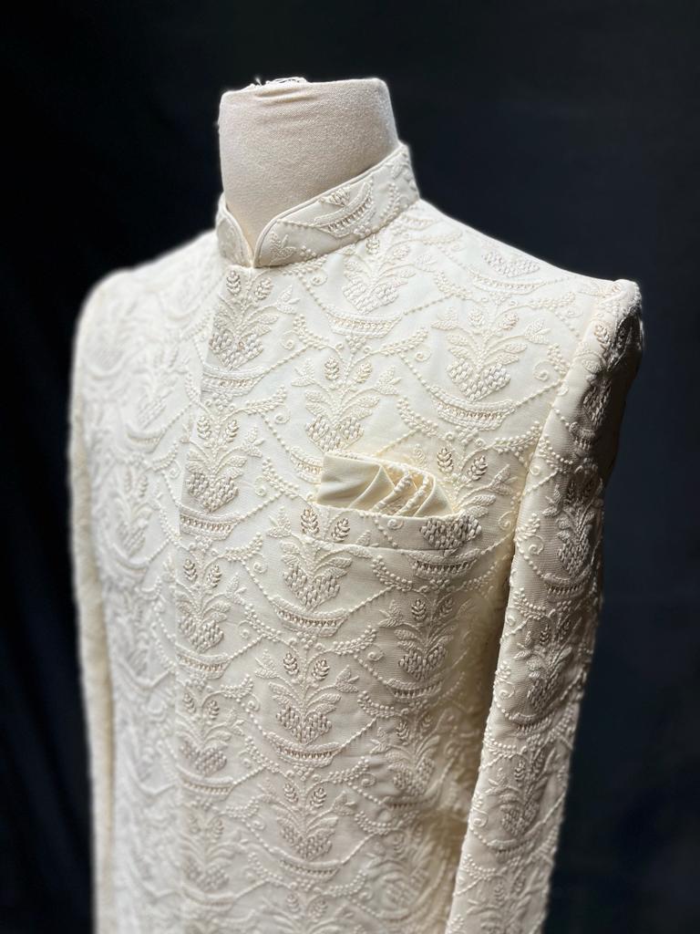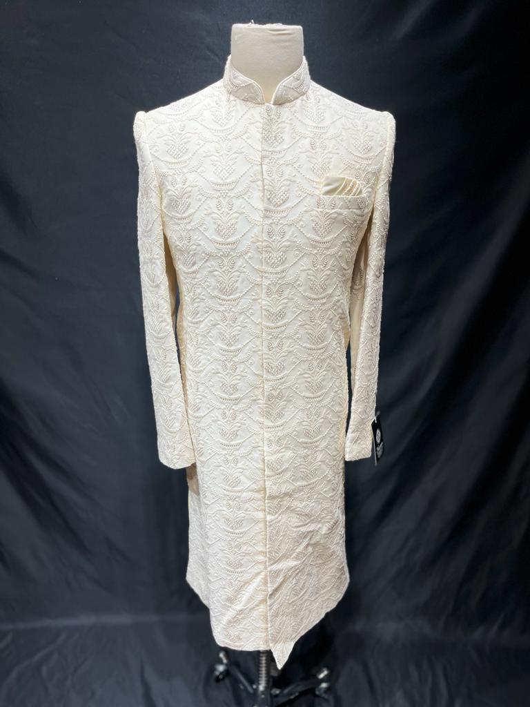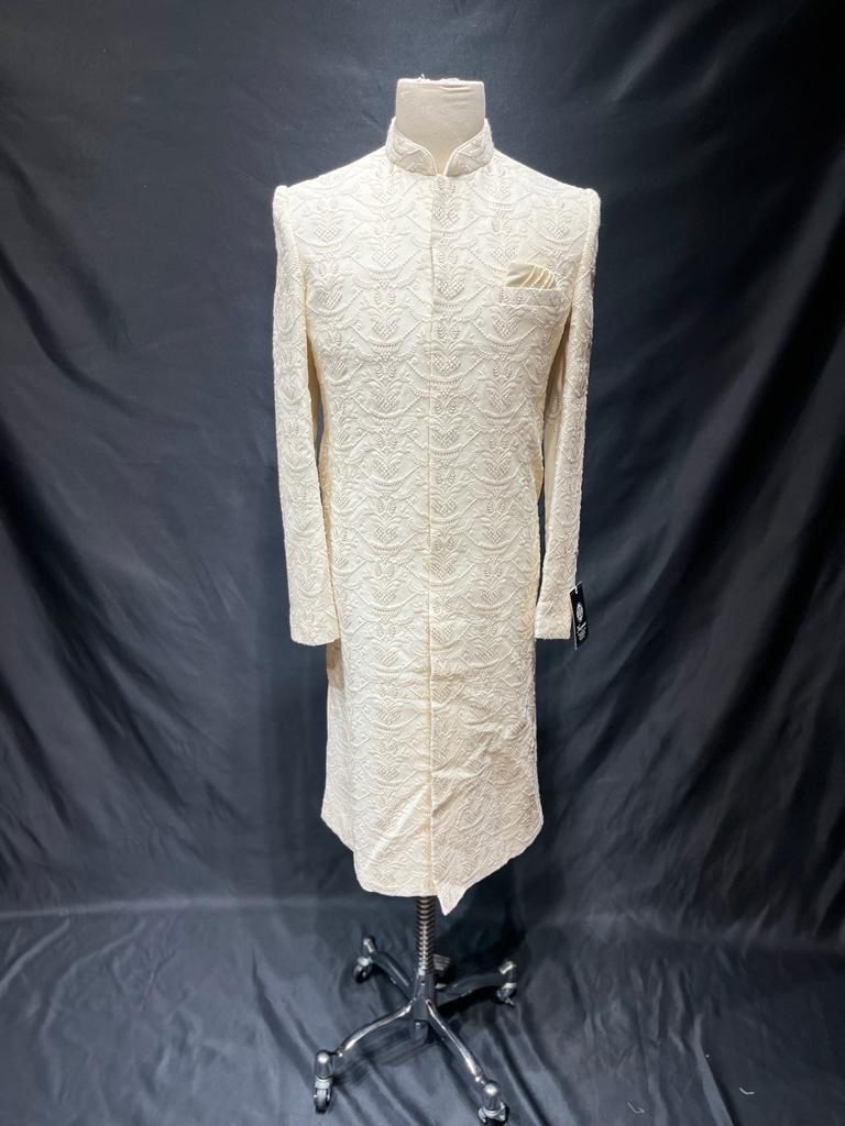 Our Mens Sherwani is crafted with exquisite lucknowi thread work, perfect for special occasions. The intricate embroidery adds a touch of elegance to any look, and is sure to make a lasting impression.