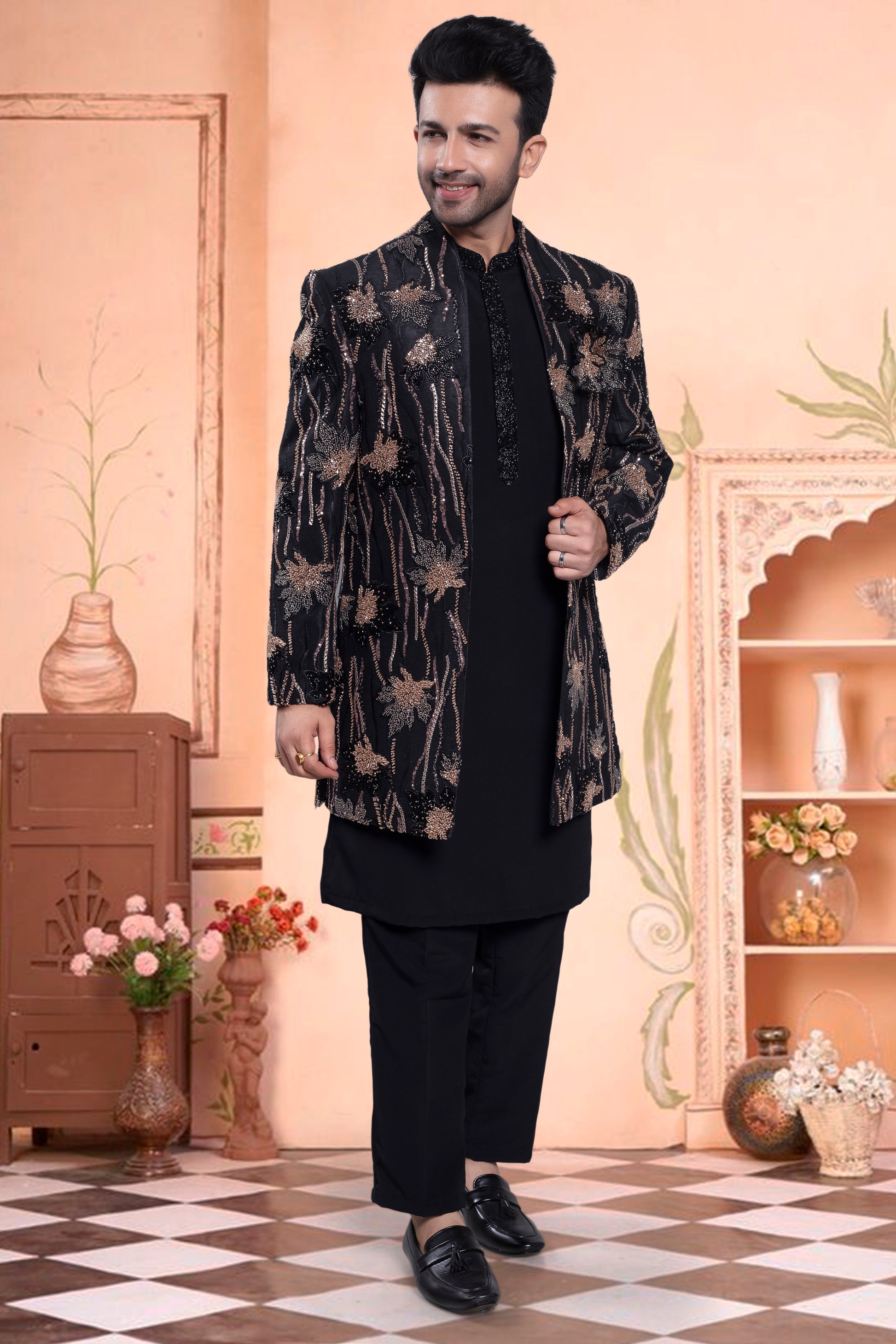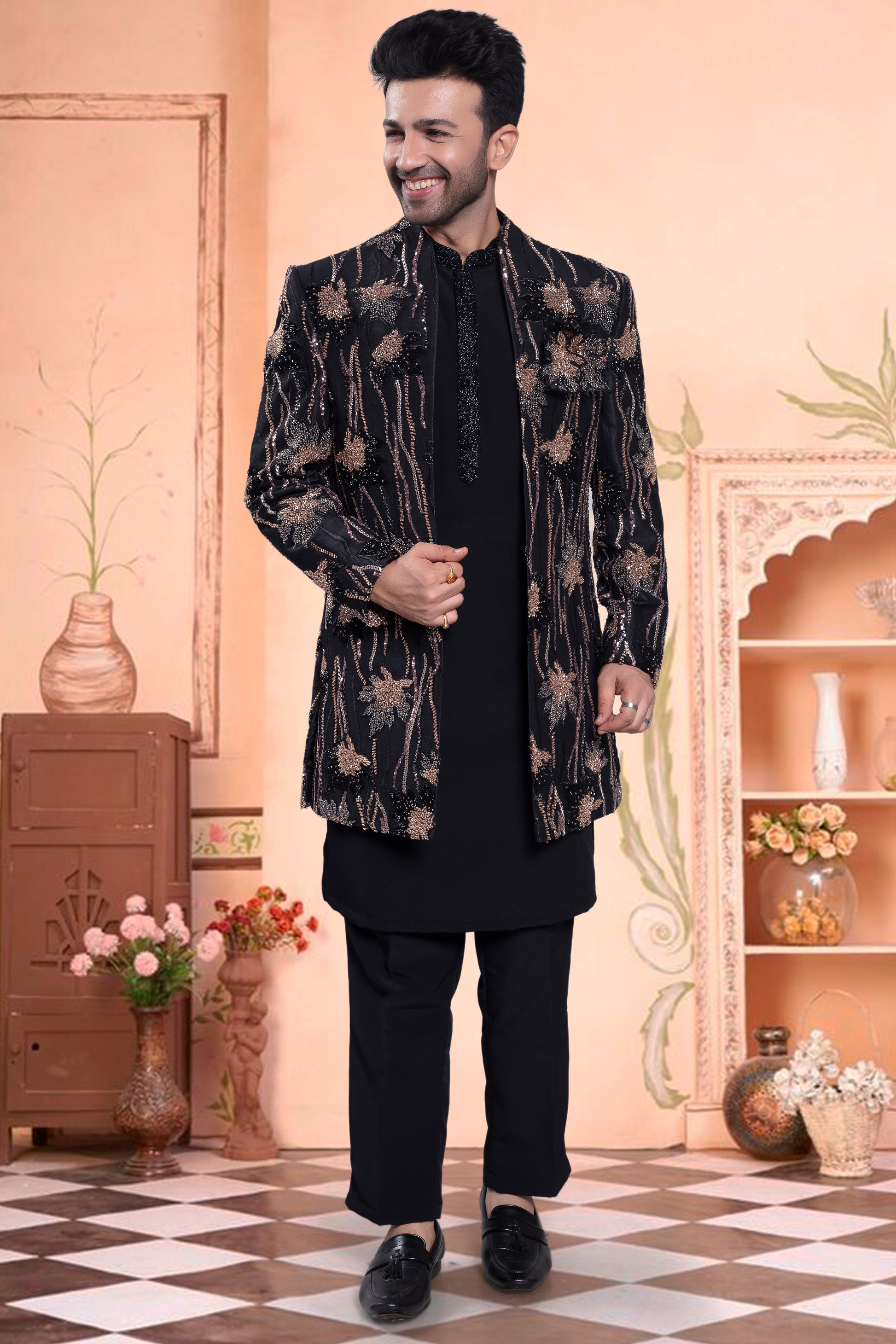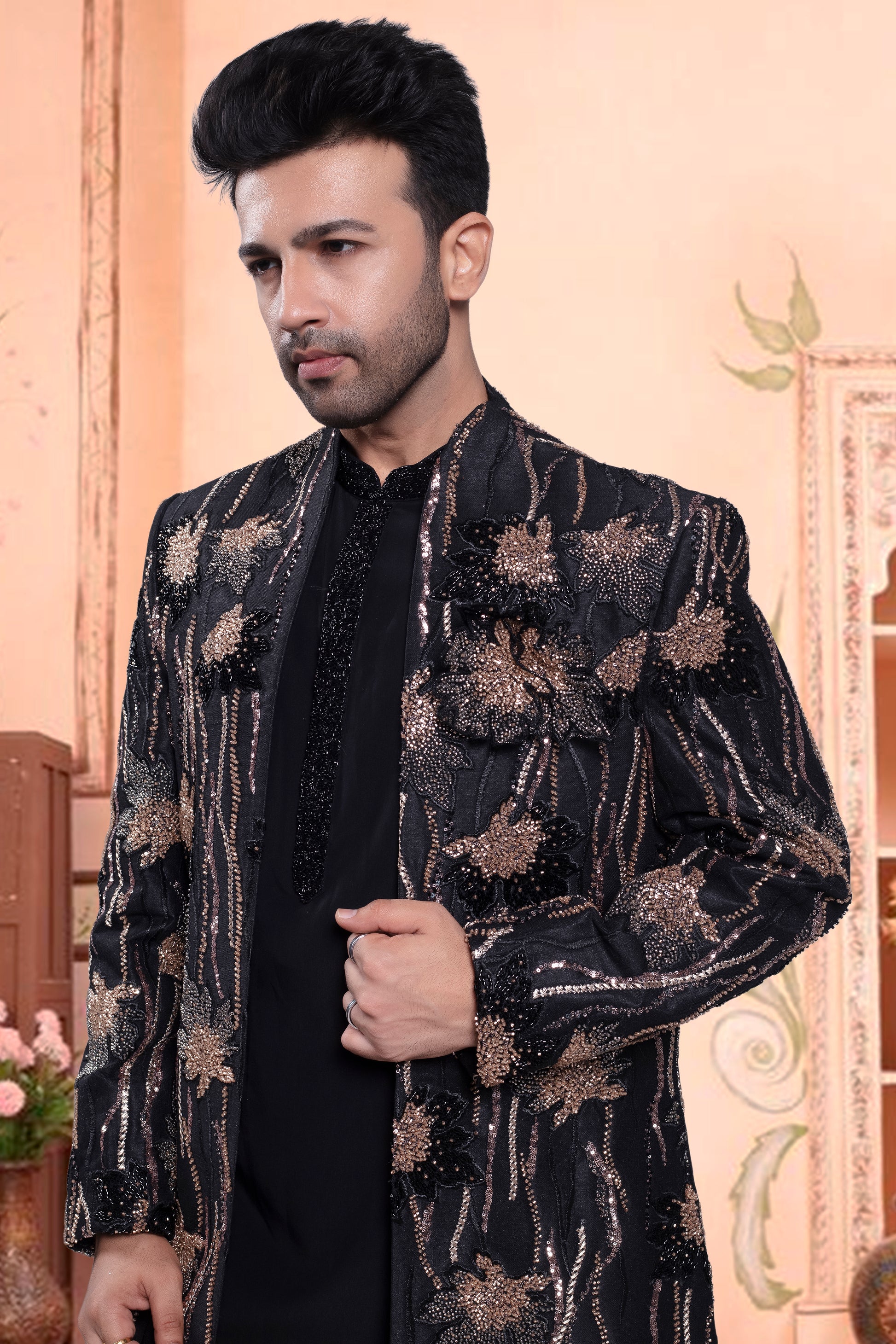 Get ready to look dashing in our Men's Sherwani! This open black jacket features stunning embroidery and bead details, making it the perfect choice for any special occasion. Stand out in style with our U2-S403 design.