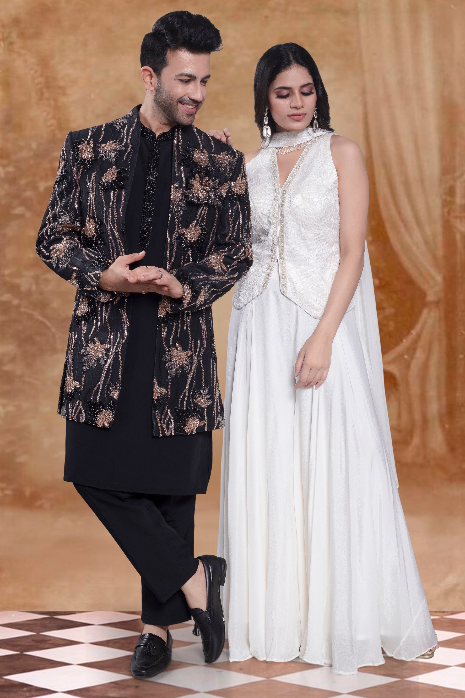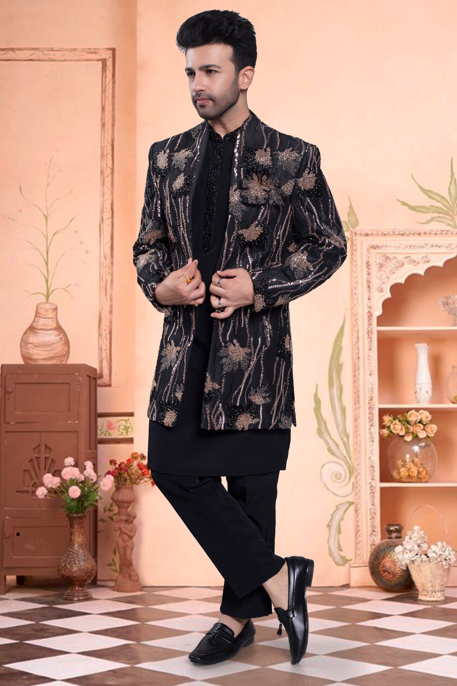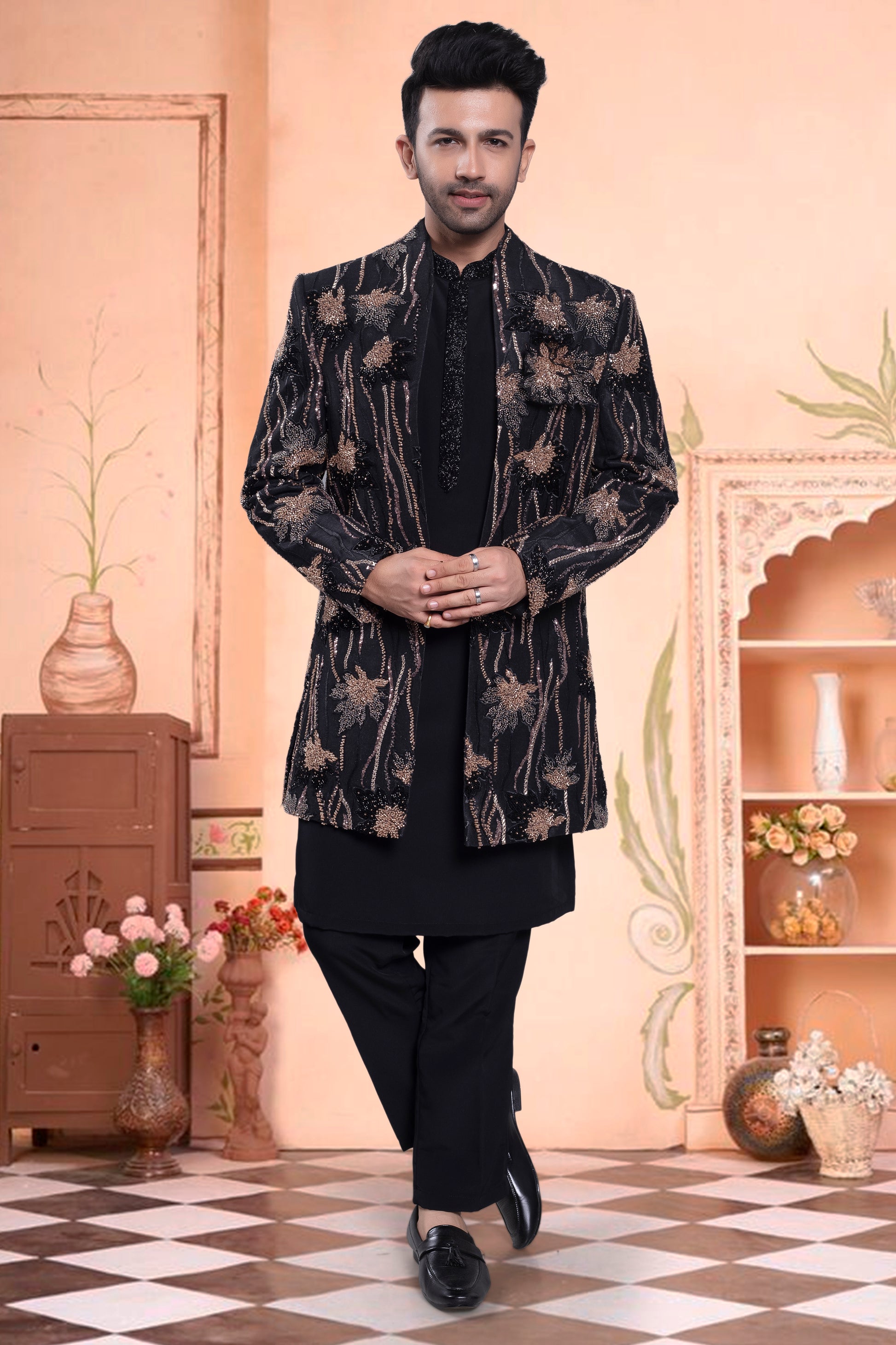 Get ready to look dashing in our Men's Sherwani! This open black jacket features stunning embroidery and bead details, making it the perfect choice for any special occasion. Stand out in style with our U2-S403 design.