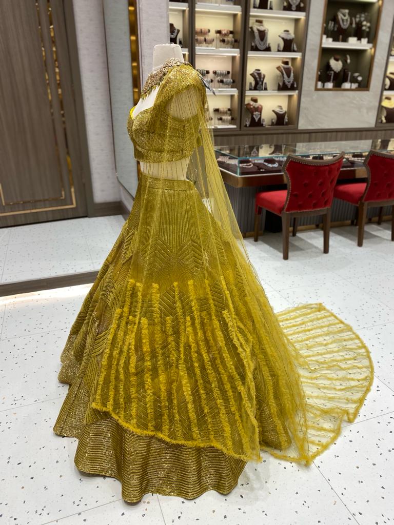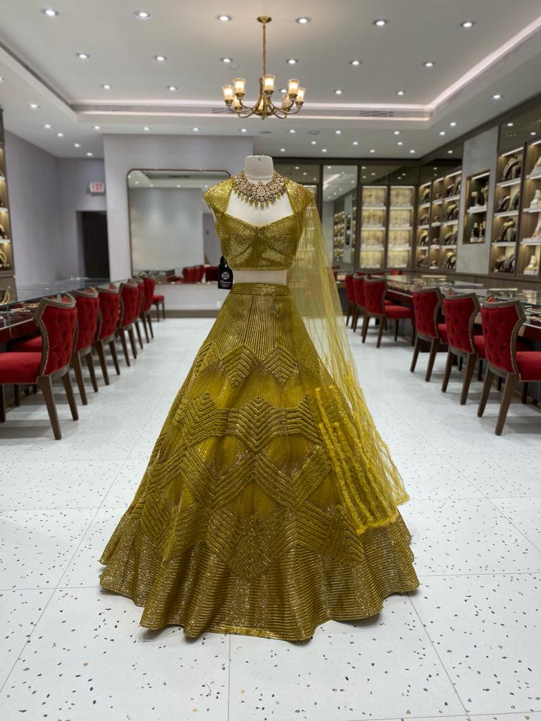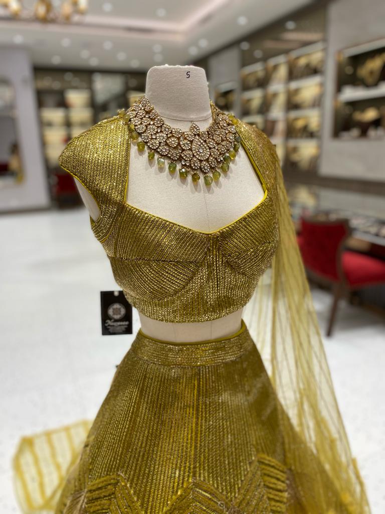 Elevate your bridal look with our Metallic Yellow Bridal Lehenga BL-121! The stunning metallic yellow color, beautifully complemented by intricate foil work, will make you stand out on your special day. Make a bold statement and feel like a princess with this breathtaking lehenga!
