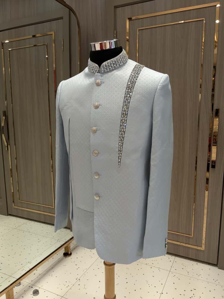 From the Dhruva Collection, Castor shines in icy blue with subtle shimmer. Its crystal-detailed collar and cosmic-inspired diagonal embellishment bring modern refinement to a timeless silhouette — designed for men who want to glow with understated brilliance.
