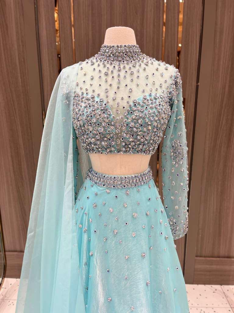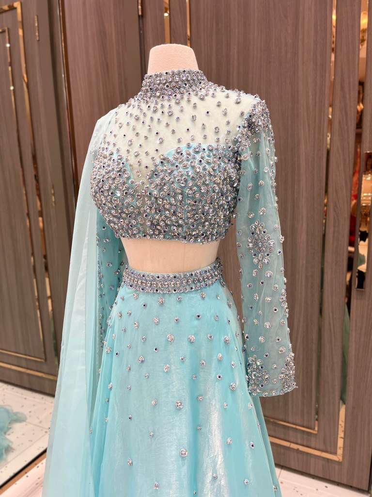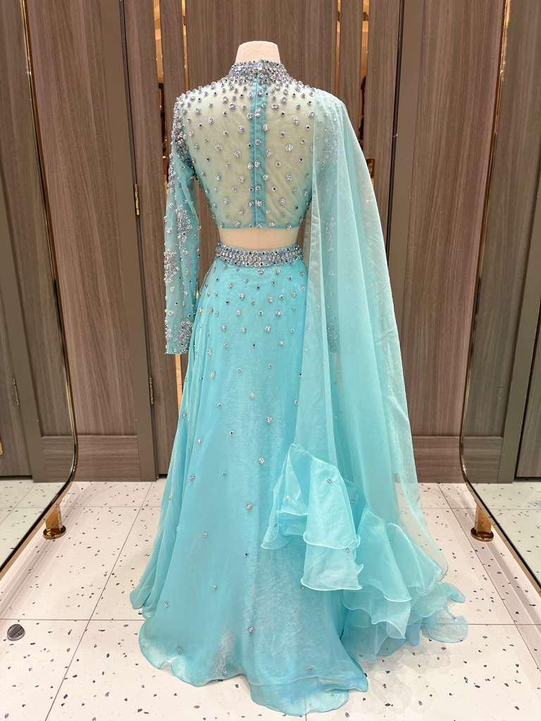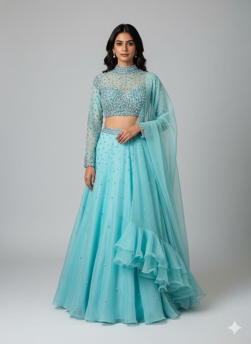 From our Dhruva Collection, this aqua blue lehenga set embodies ethereal elegance. The high-neck sheer blouse is hand-embellished with shimmering crystals, creating a dazzling yet refined look. The flowing skirt, scattered with delicate stonework, moves with grace, while the soft organza dupatta completes the ensemble. A timeless choice for sangeets, cocktail nights, or receptions.