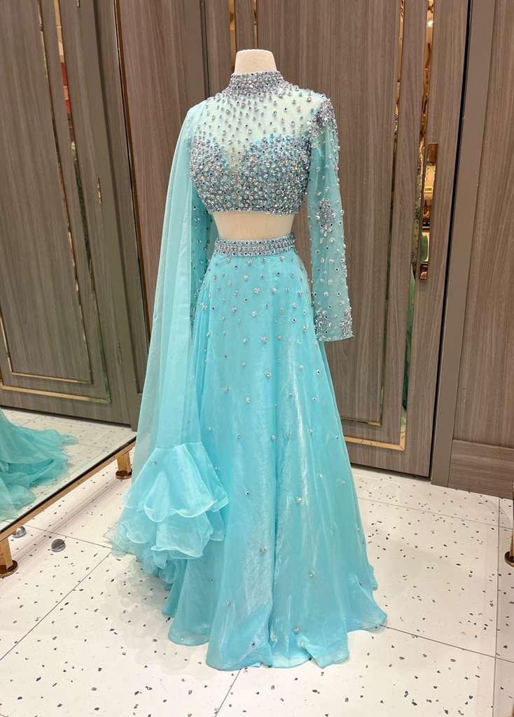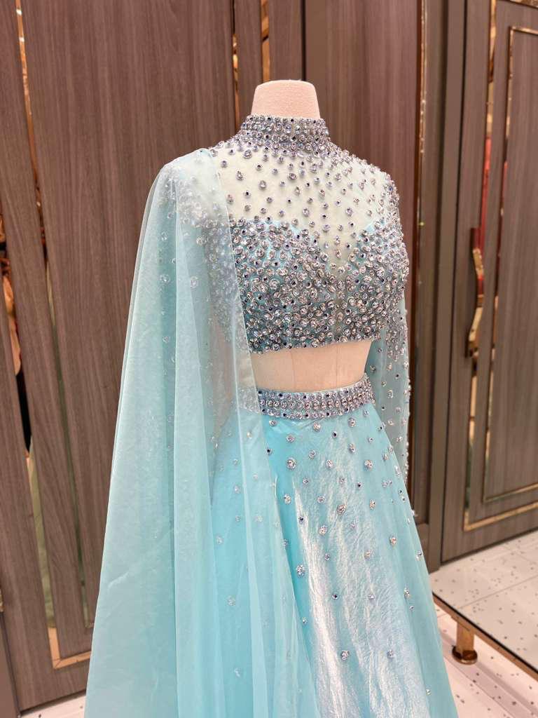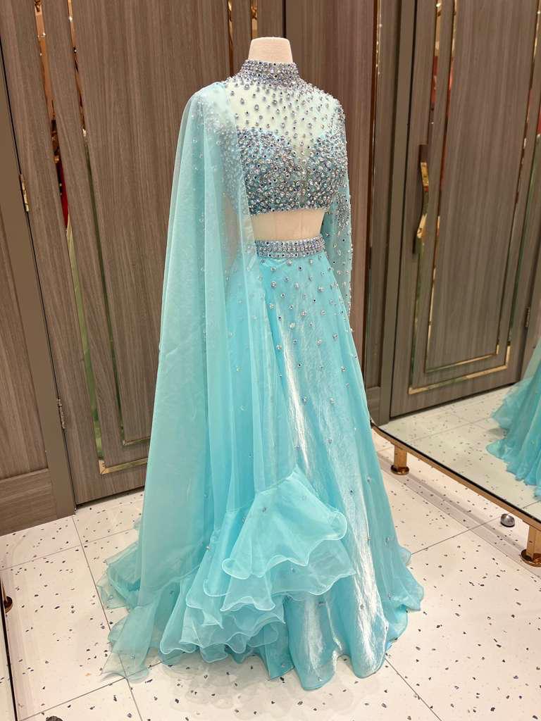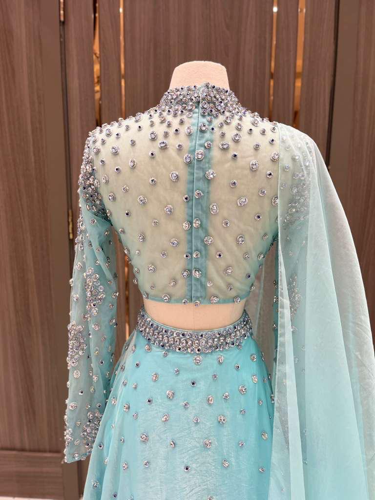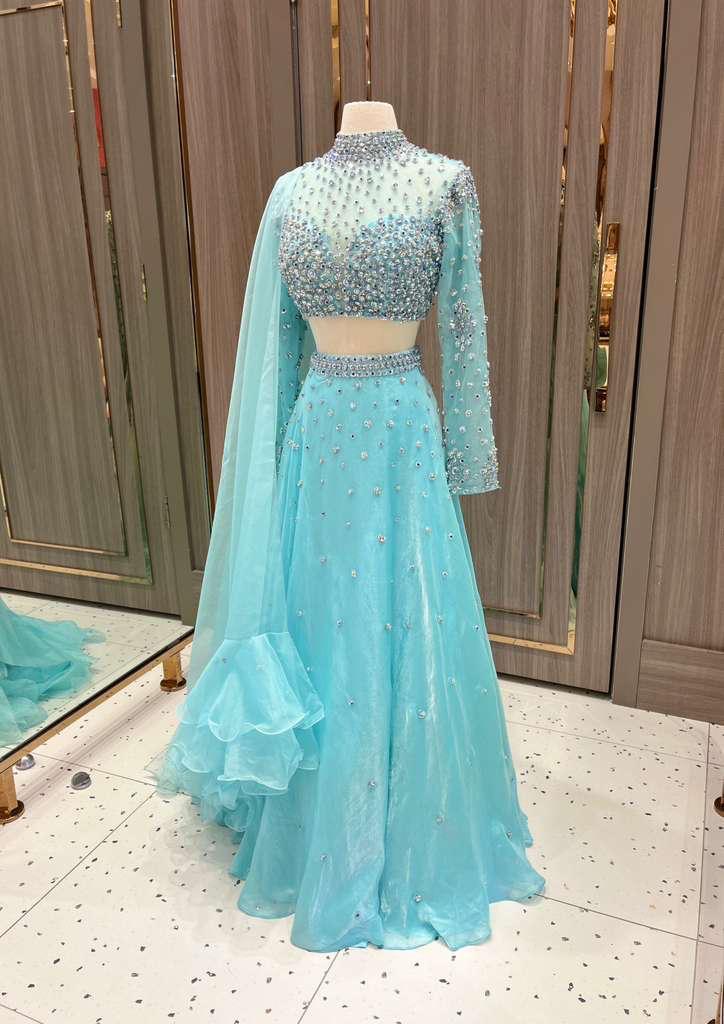 From our Dhruva Collection, this aqua blue lehenga set embodies ethereal elegance. The high-neck sheer blouse is hand-embellished with shimmering crystals, creating a dazzling yet refined look. The flowing skirt, scattered with delicate stonework, moves with grace, while the soft organza dupatta completes the ensemble. A timeless choice for sangeets, cocktail nights, or receptions.
