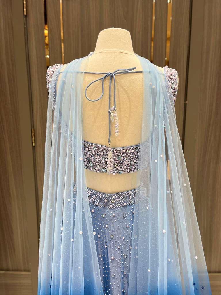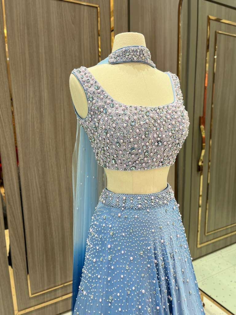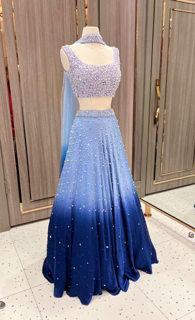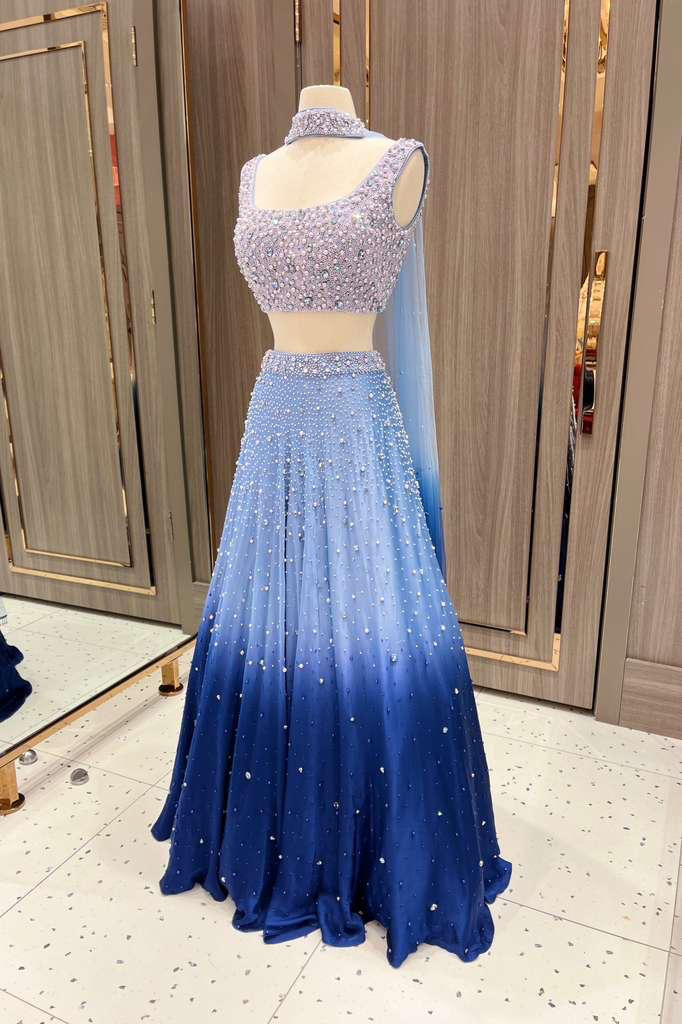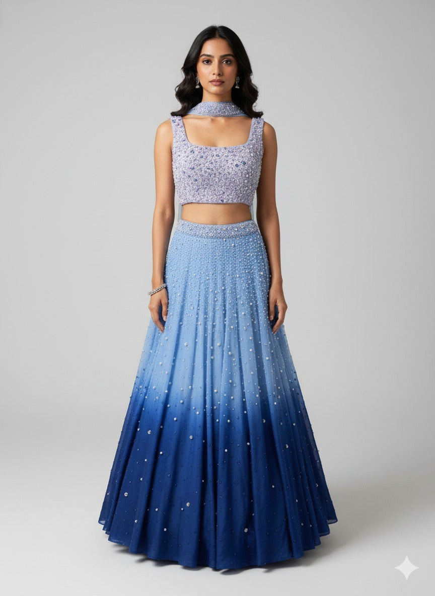Introducing Azha from the Dhruva Collection, this midnight ombré lehenga is a true showstopper. The blouse is heavily adorned with intricate pearl work. Scattered embellishments across the lehenga create the illusion of a starlit night sky, making this piece a celestial dream for receptions, sangeets, or evening soirées.