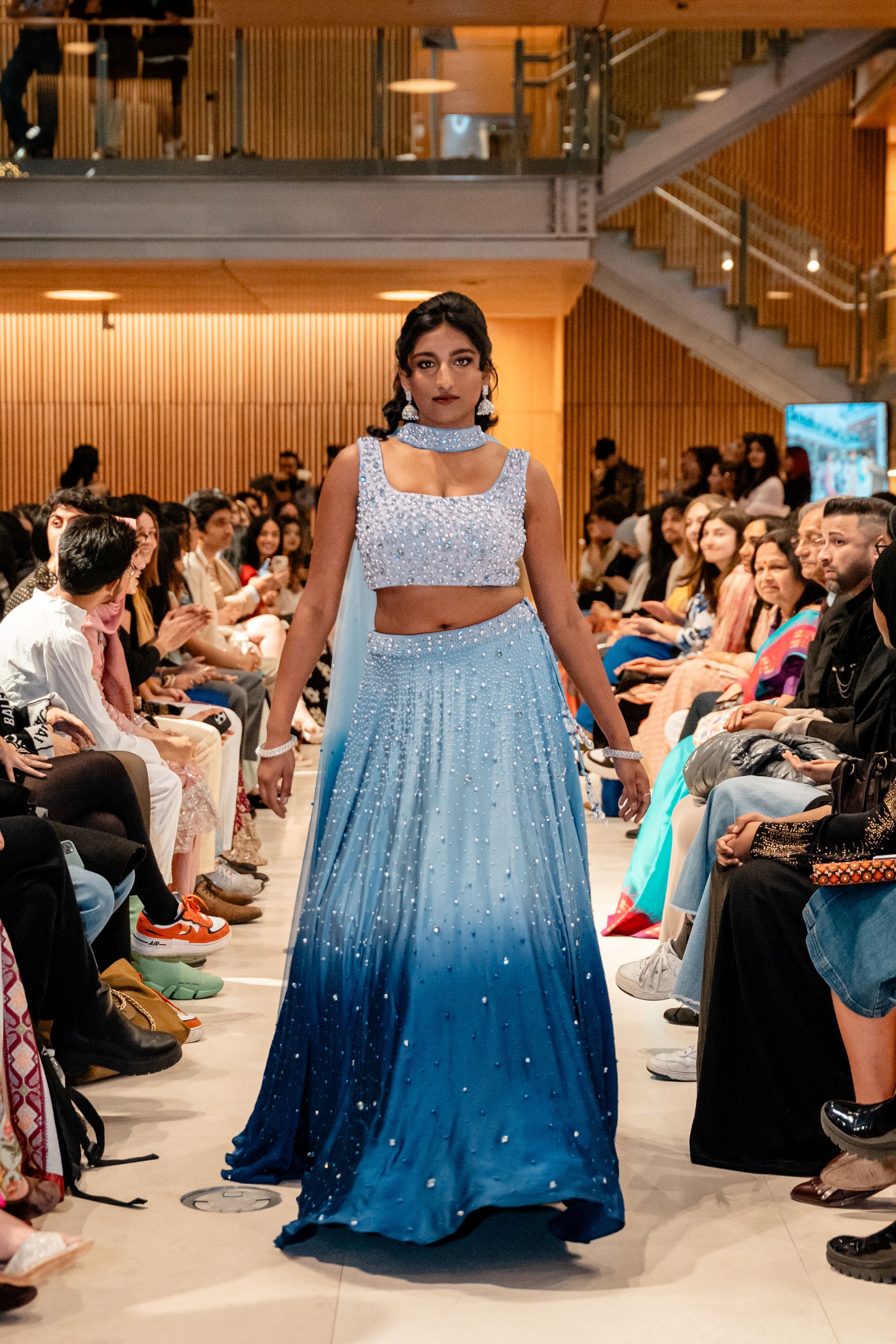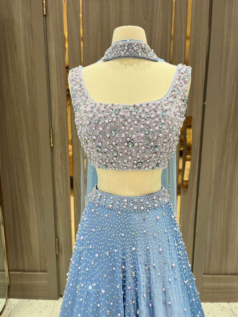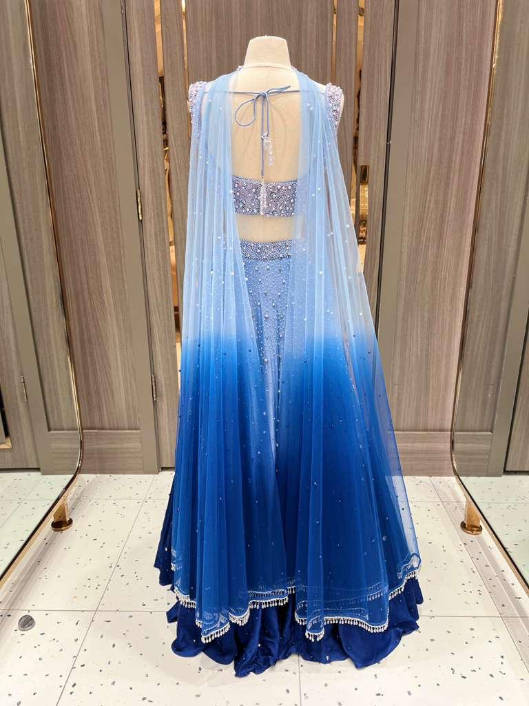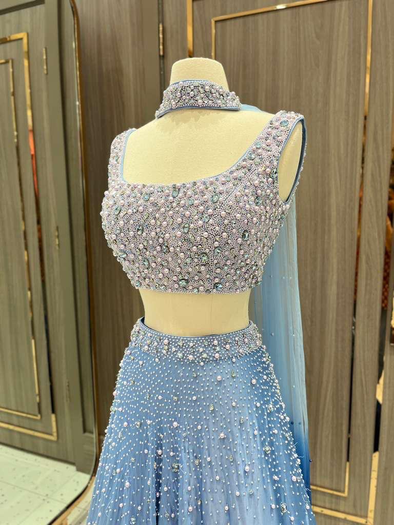 Introducing Azha from the Dhruva Collection, this midnight ombré lehenga is a true showstopper. The blouse is heavily adorned with intricate pearl work. Scattered embellishments across the lehenga create the illusion of a starlit night sky, making this piece a celestial dream for receptions, sangeets, or evening soirées.