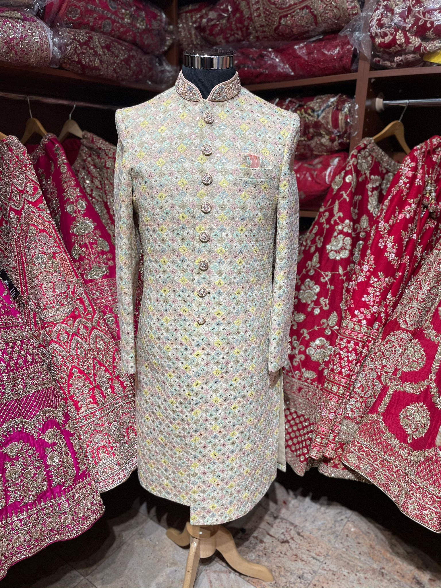 White sherwani is completely enriched with sequence & multi resham embroidered patterns is paired with a matching churidar bottom.