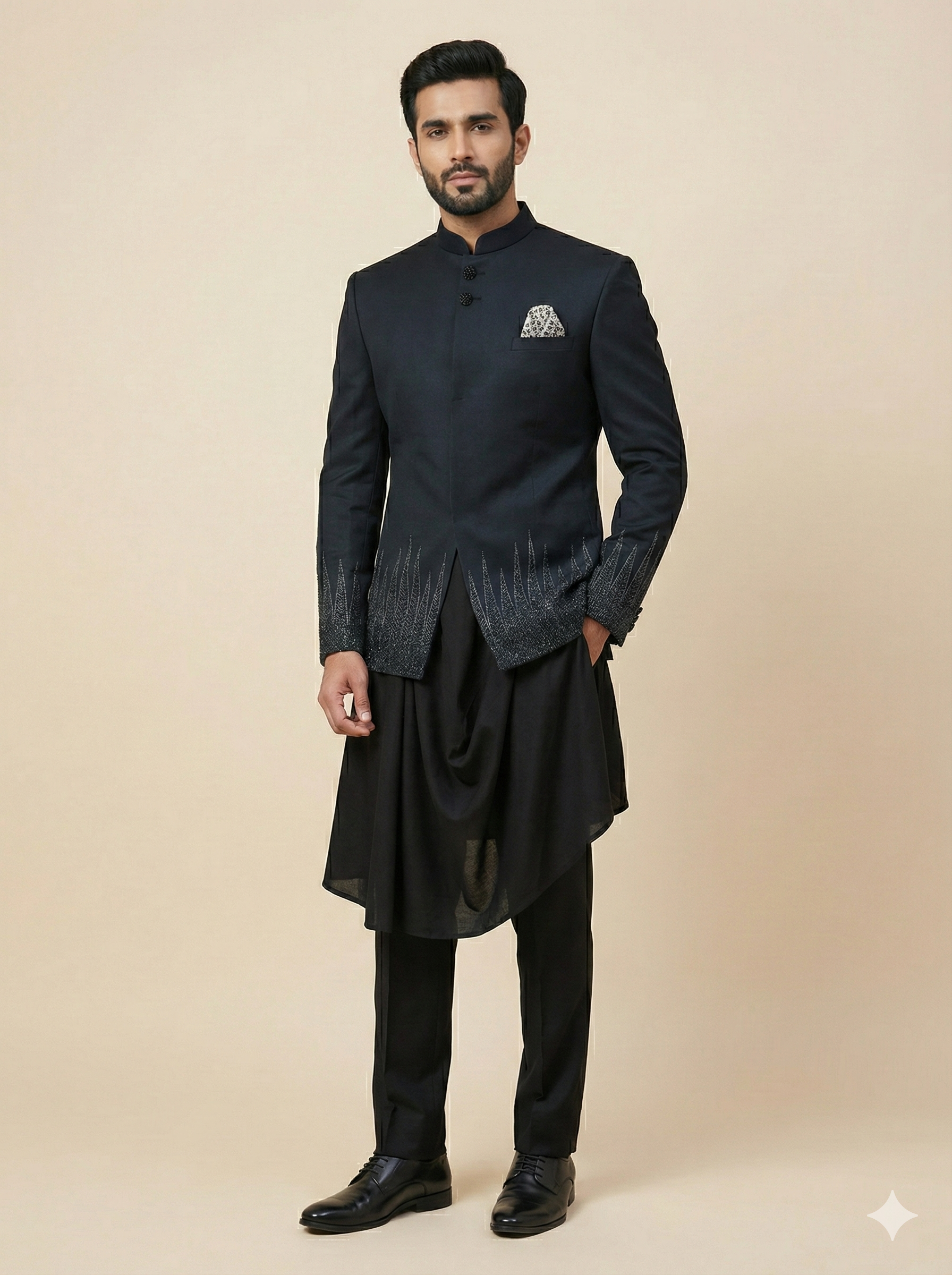 Awesome navy blue Bandhgala with asymmetrical kurta inside to give a touch of new style