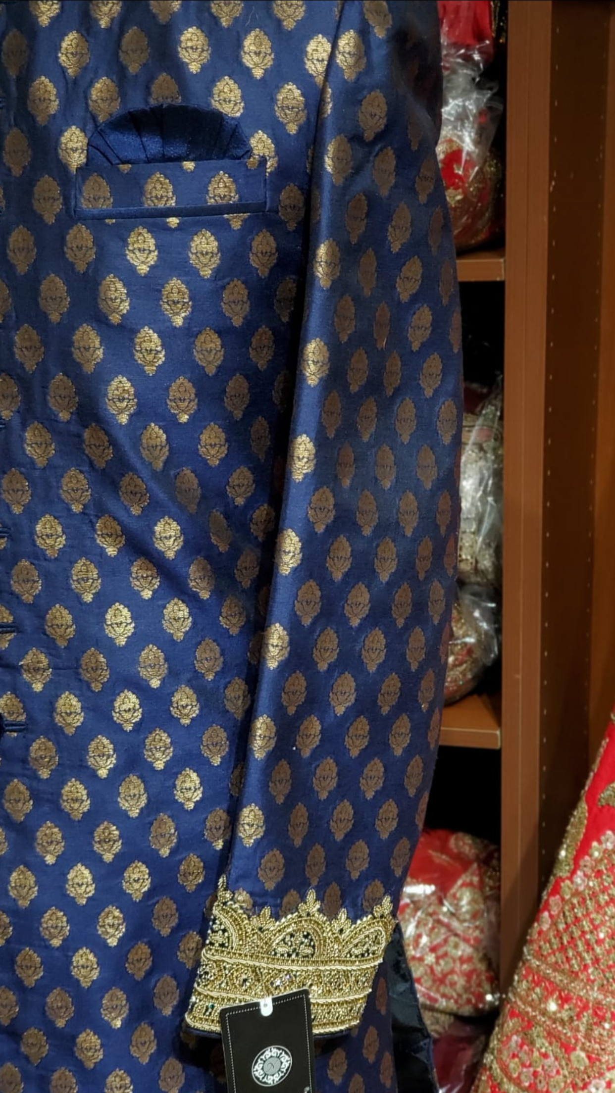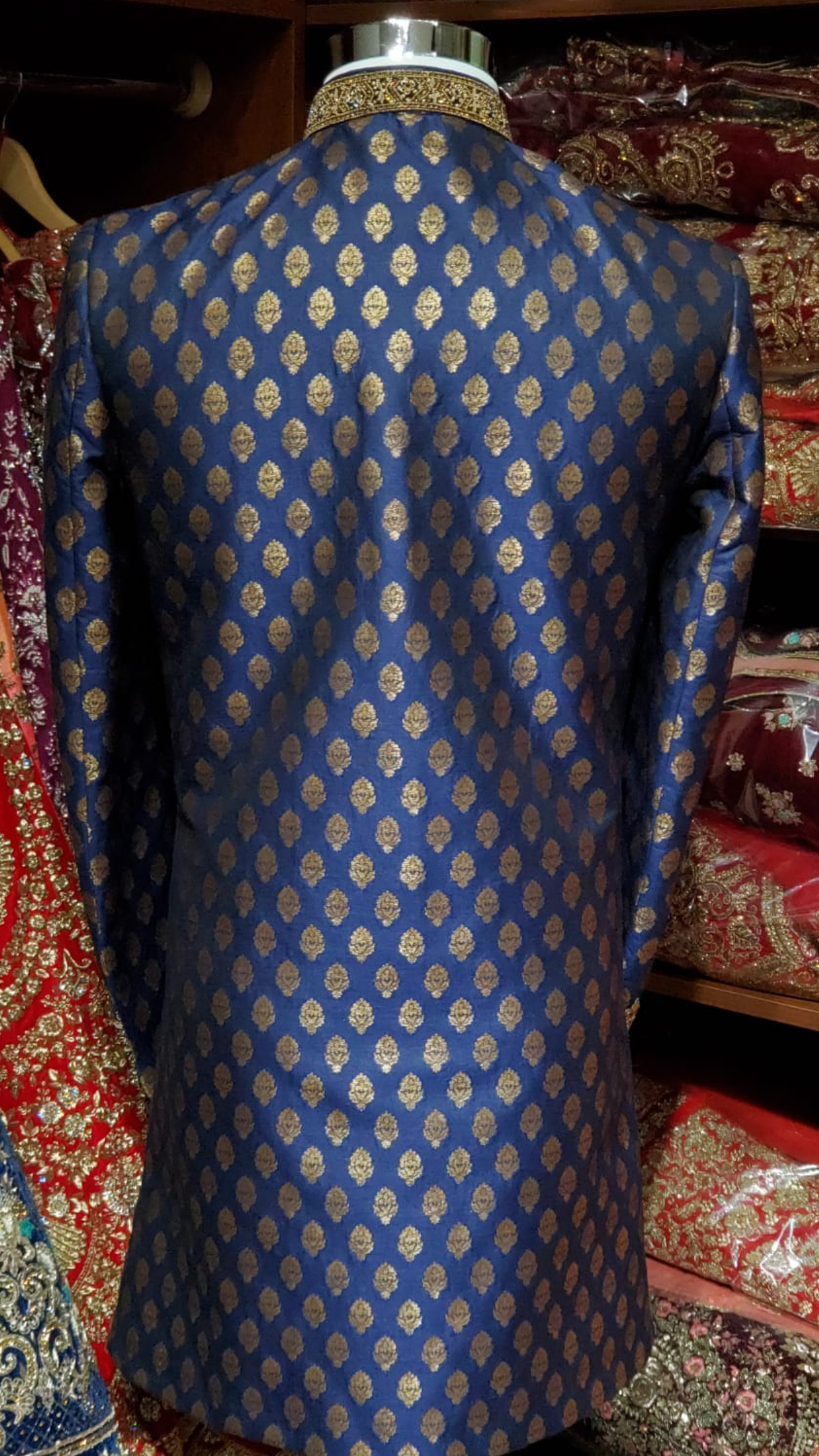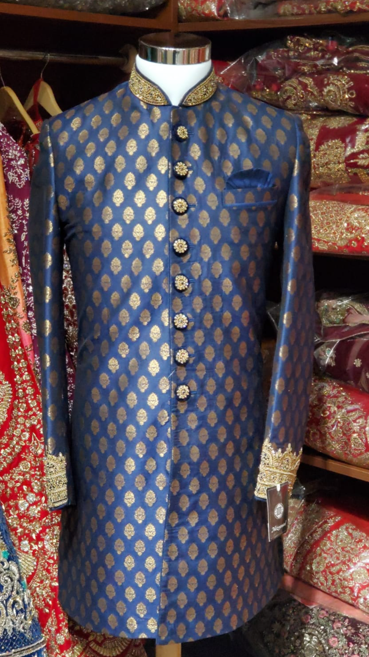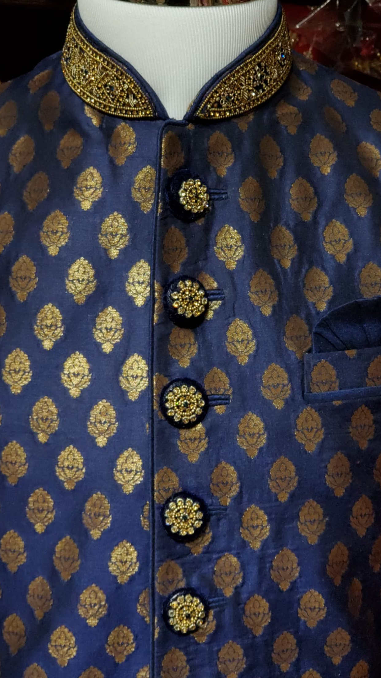 Navy blue brocade sherwani with gold zardosi and crystal embroidery on collar and wrist! Paired with a gold chudidar and accented with embroidered buttons