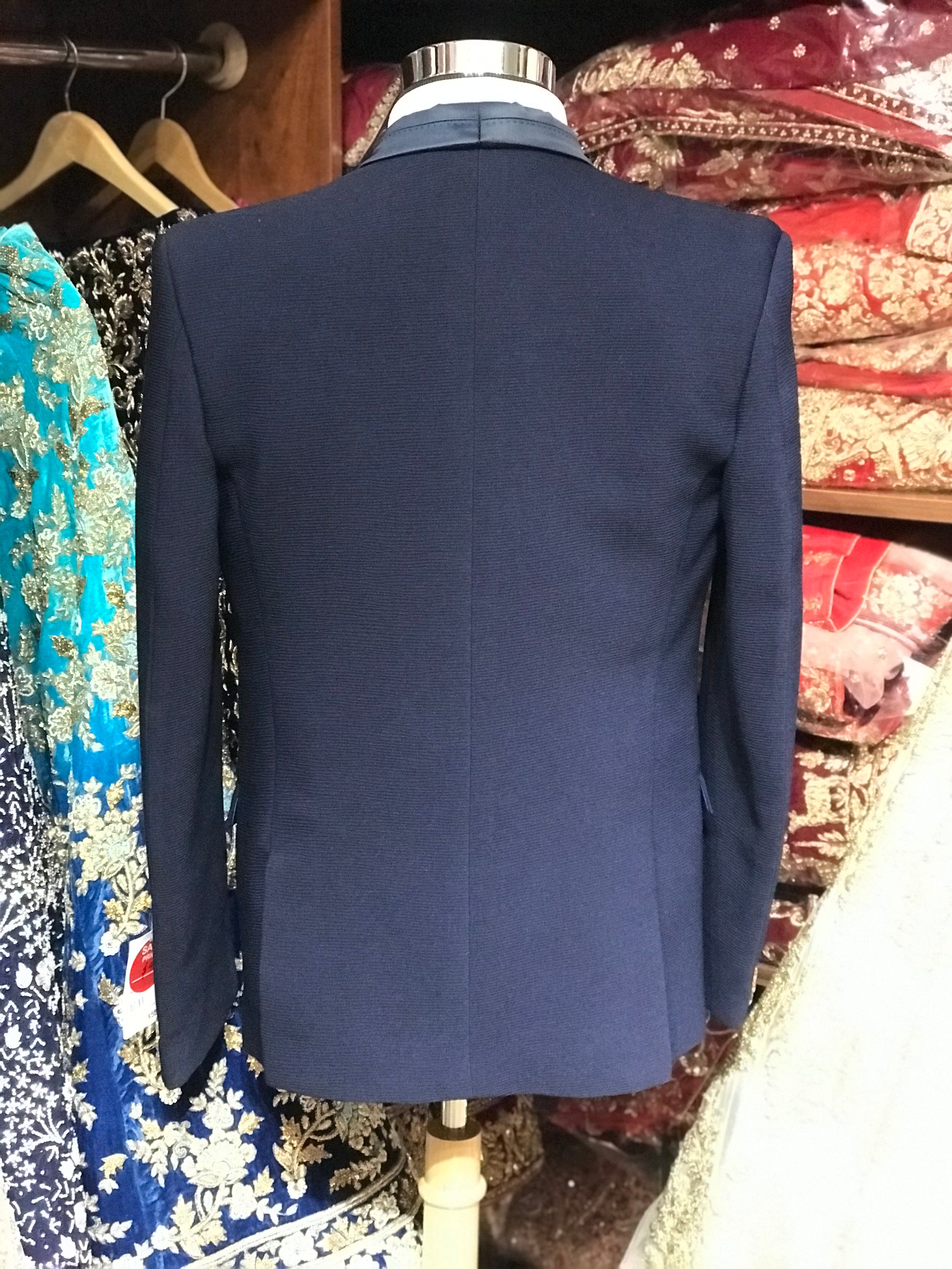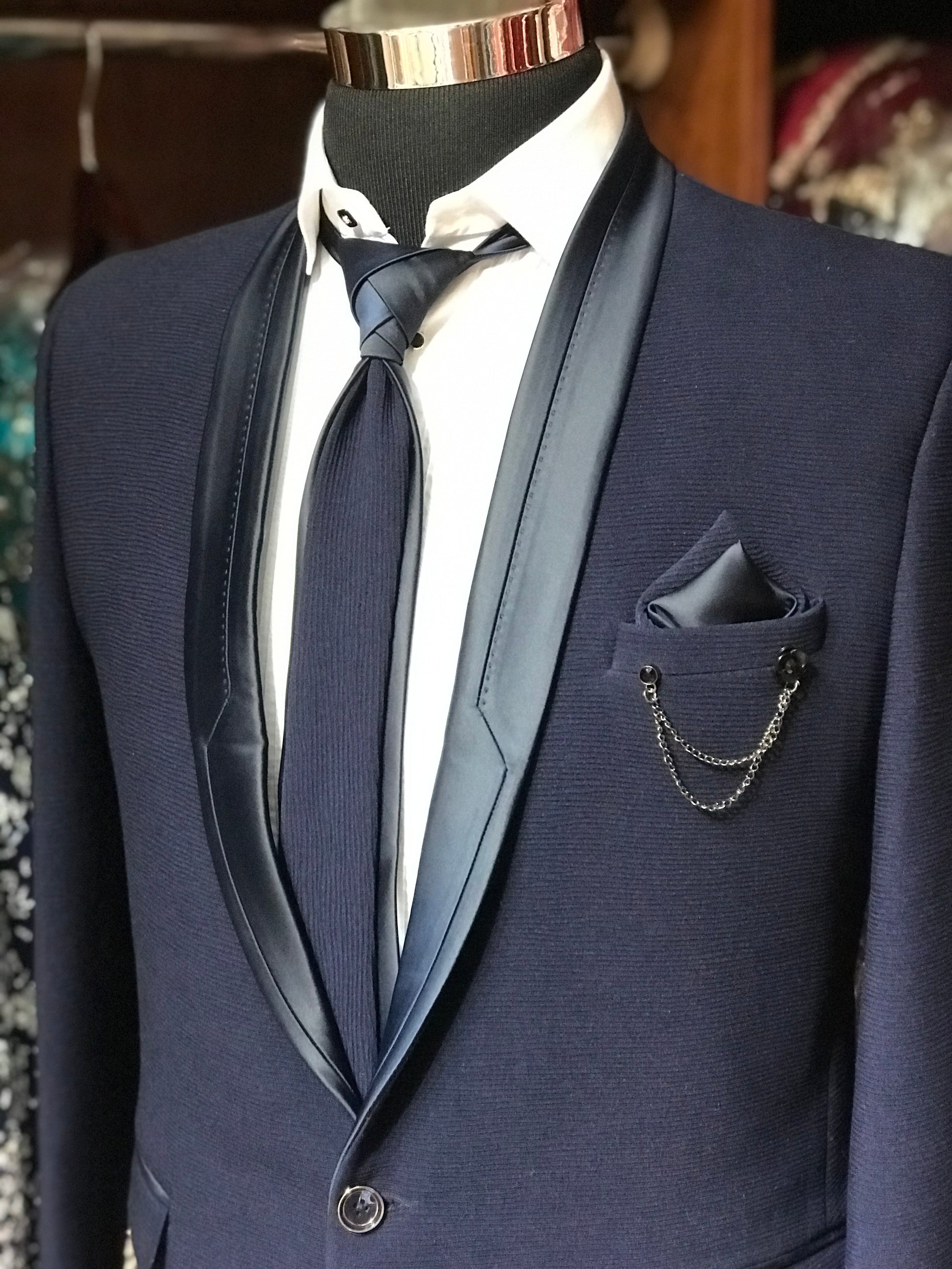 Navy self embossed jacket with chest and waist pockets paired with a pinstripe white shirt, navy pants and navy tie! Perfect for a reception!