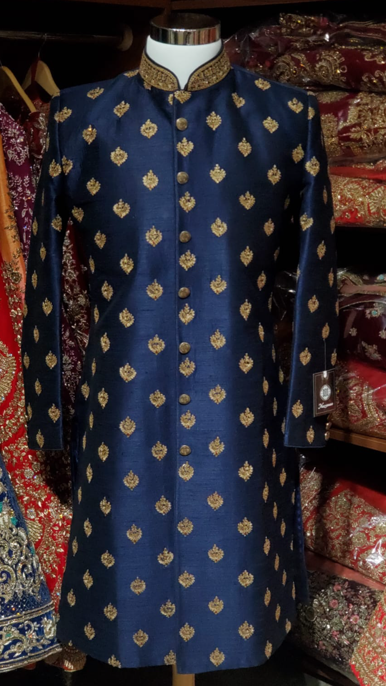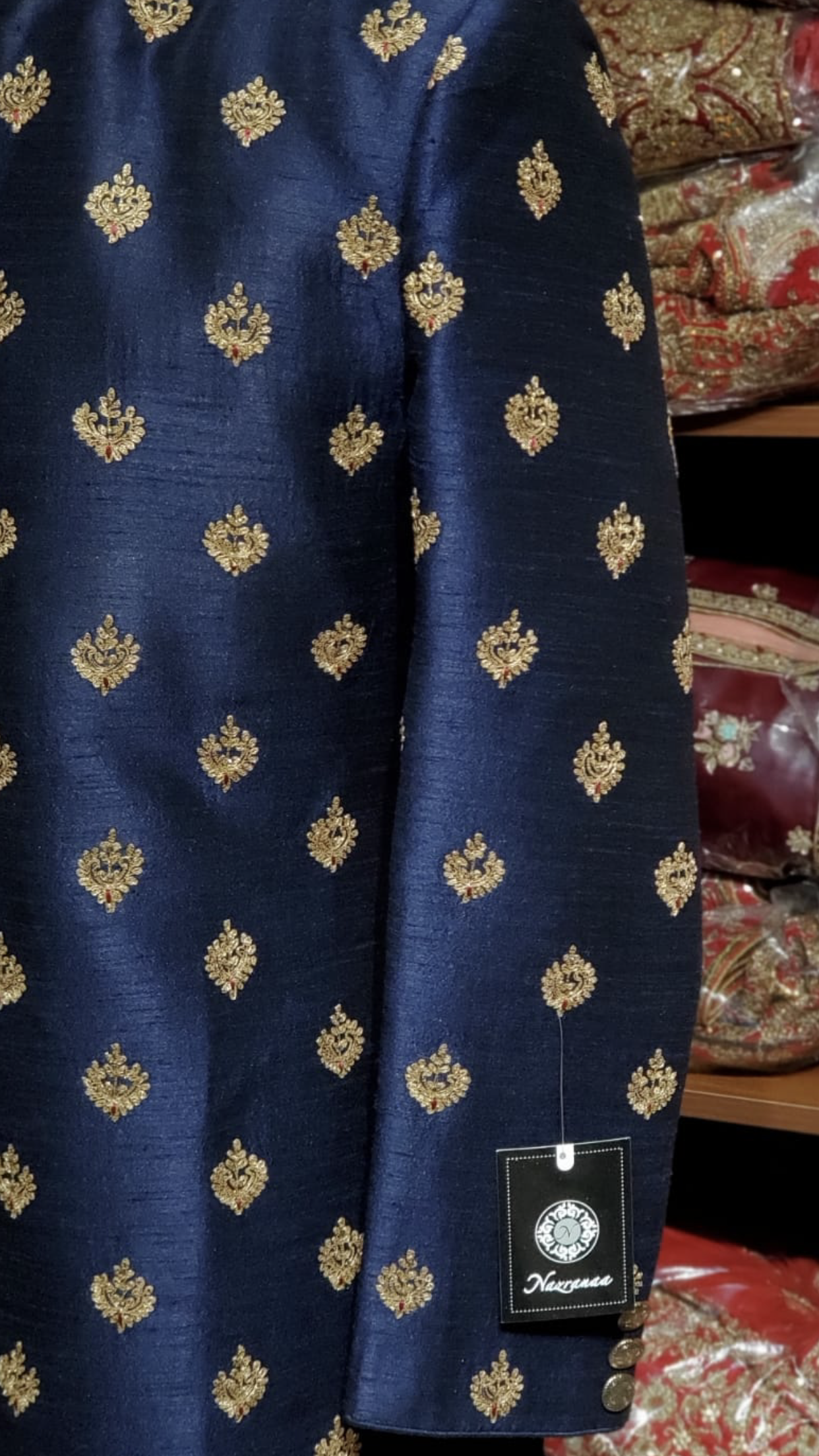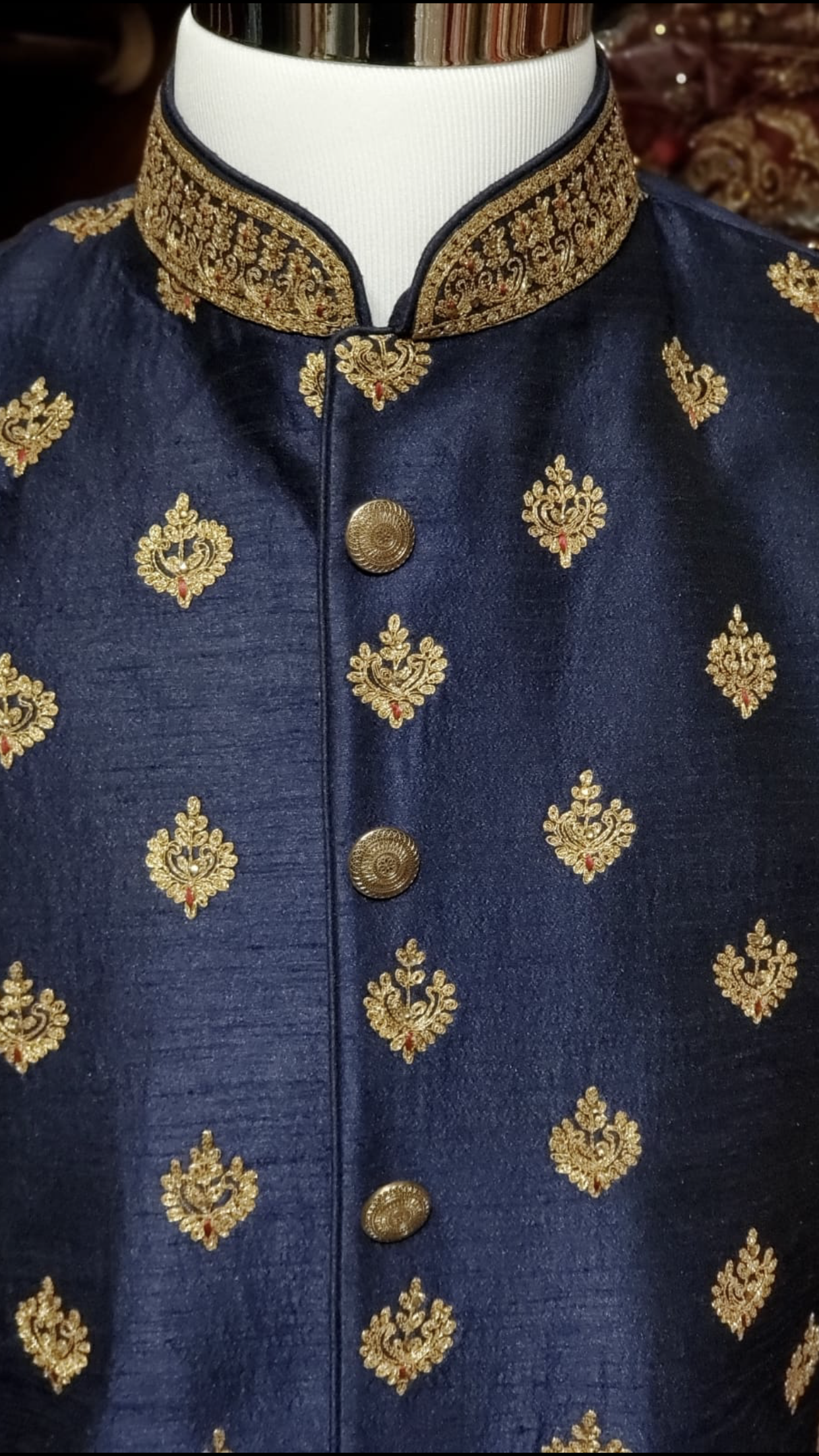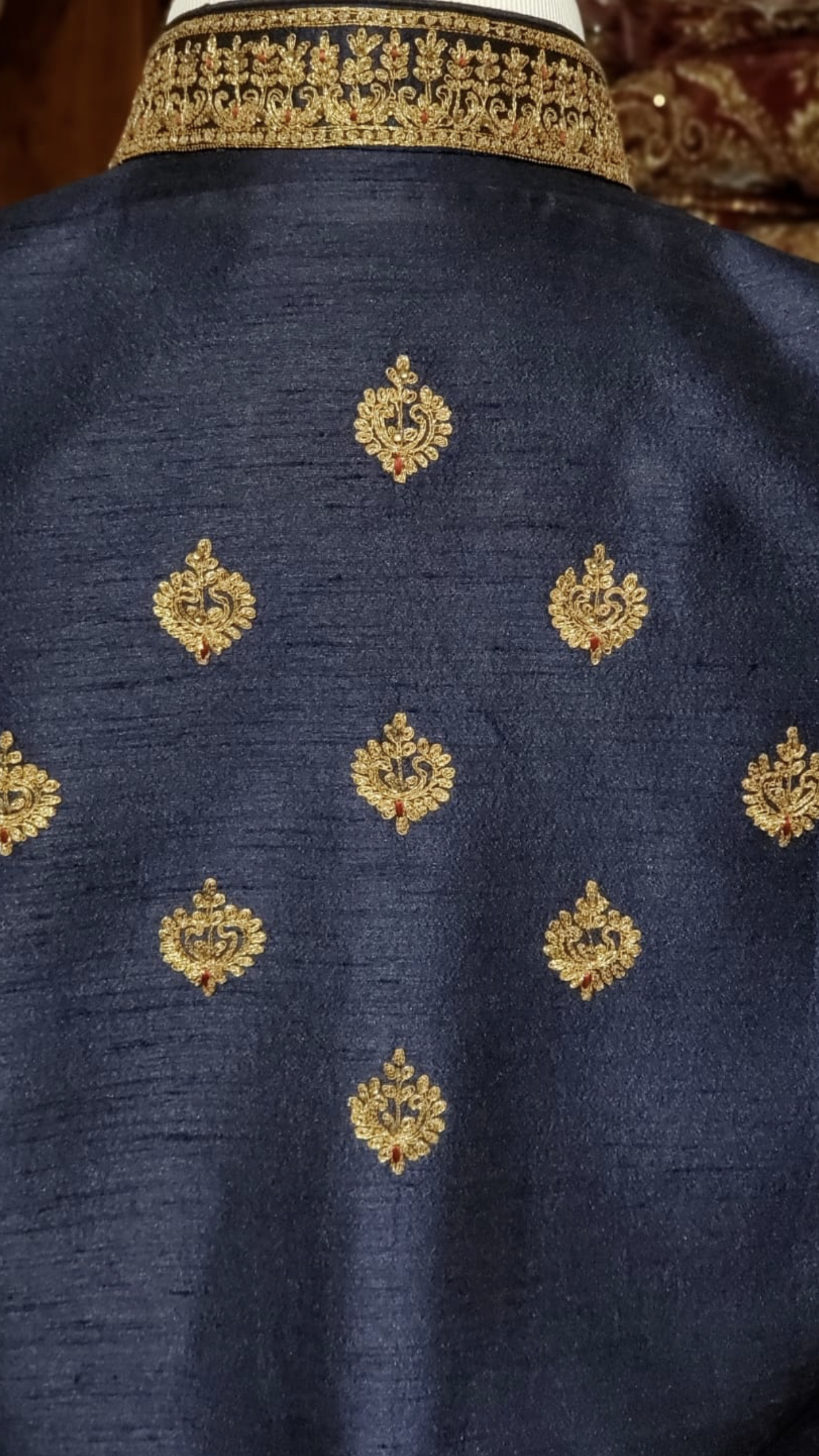 Navy blue raw silk sherwani with gold aari embroidery with hints of red resham embroidery! Paired with a gold chudidar.
