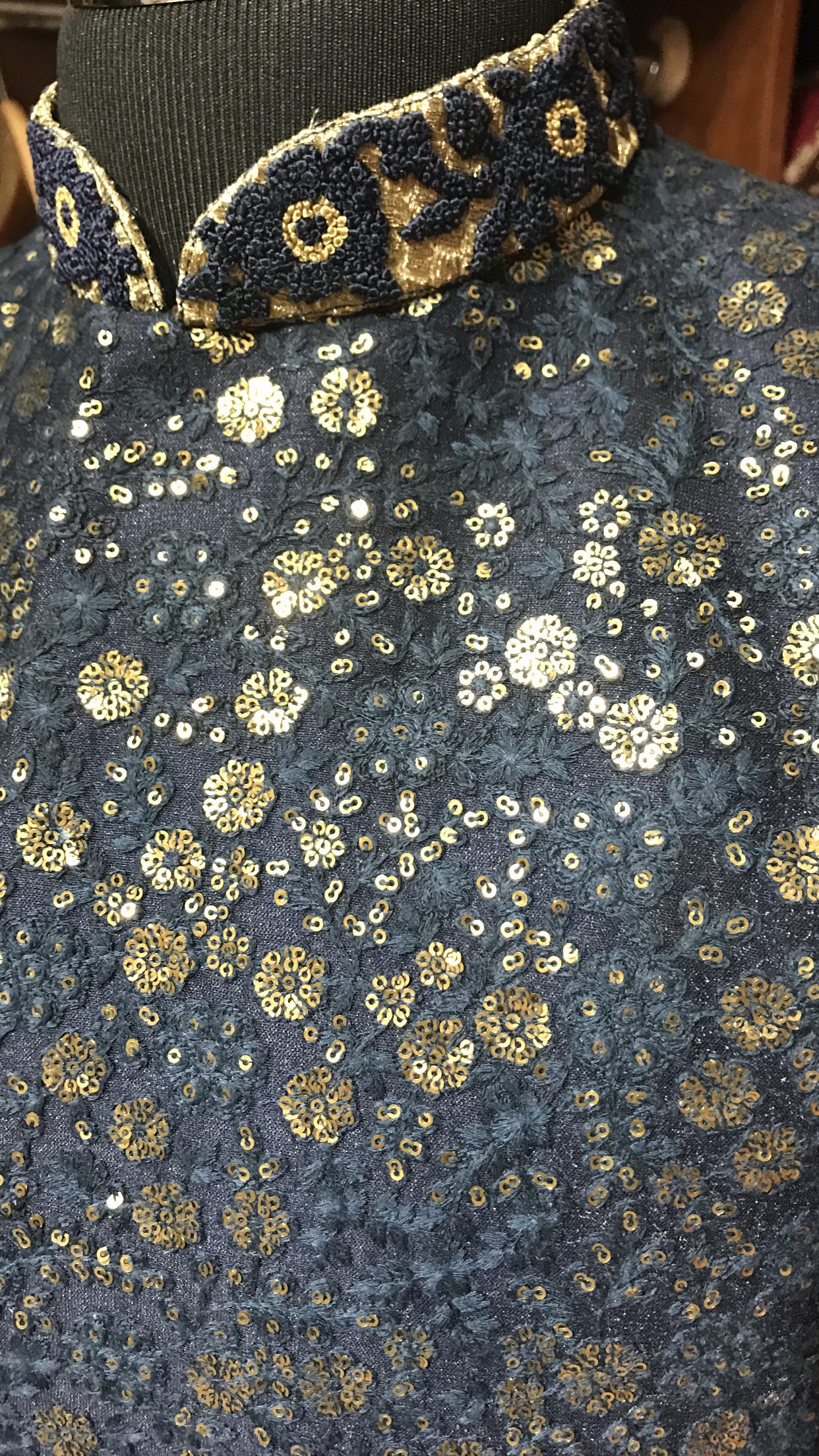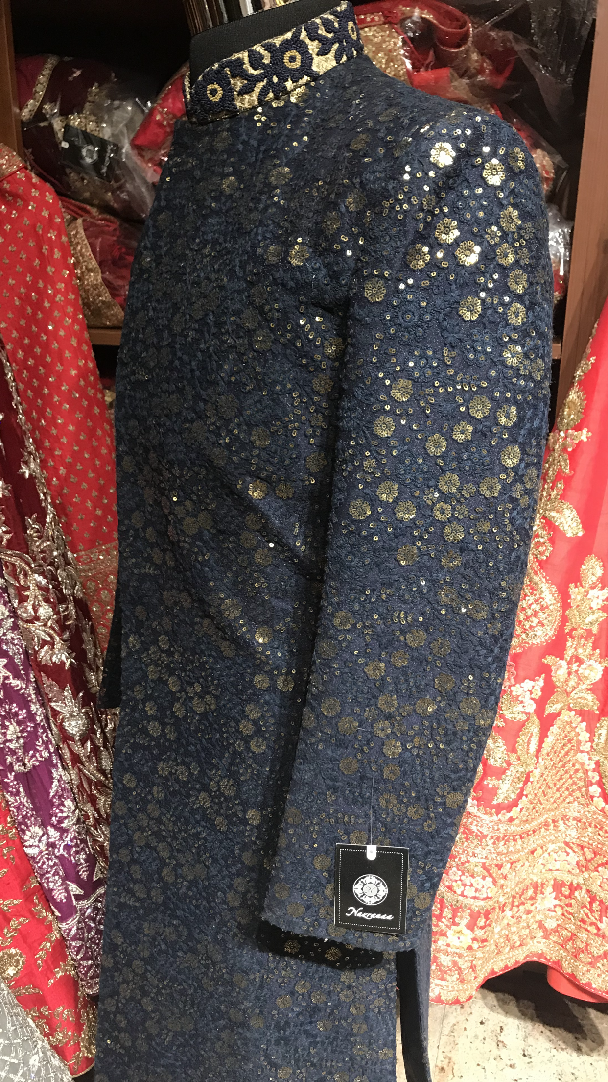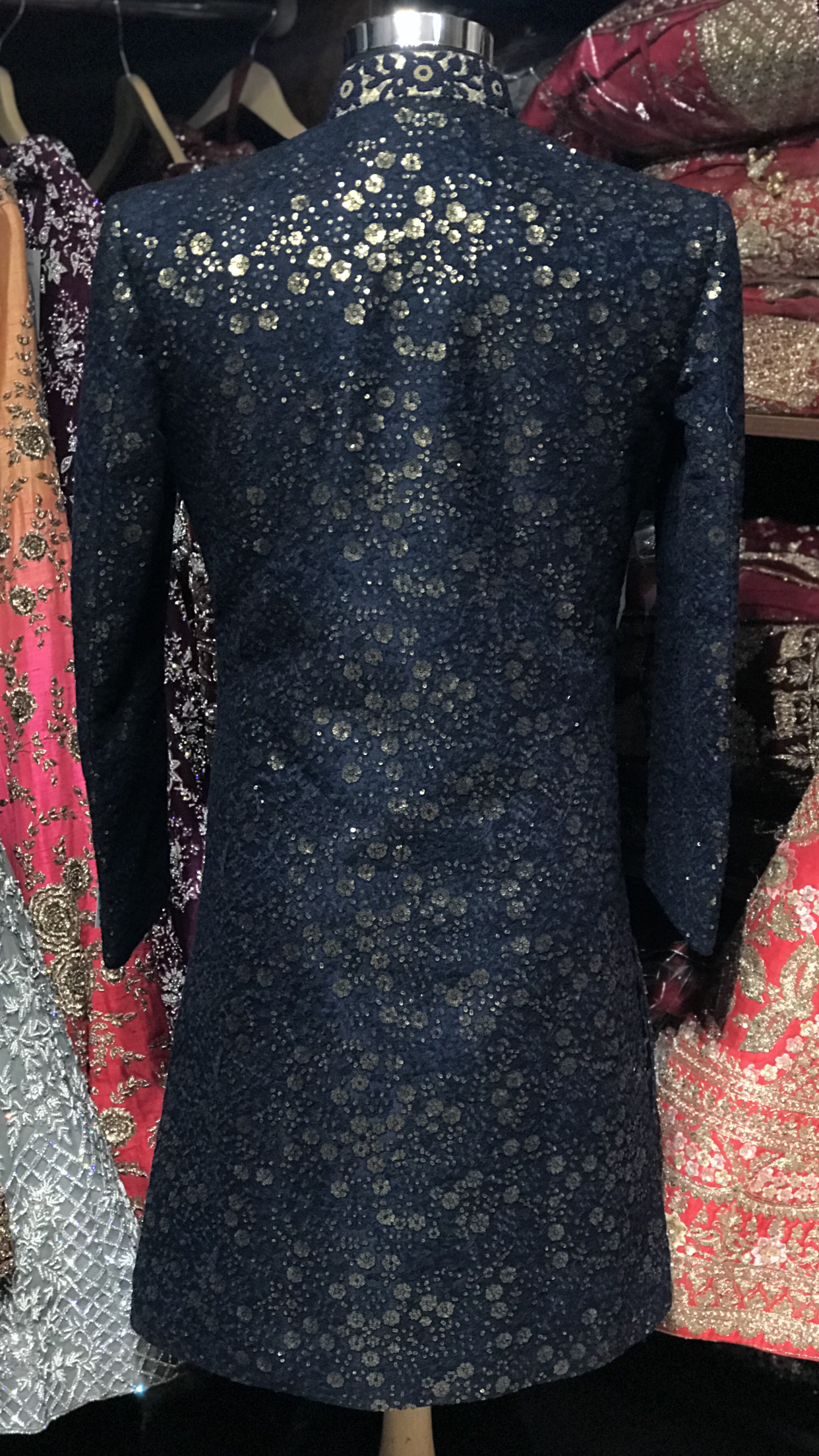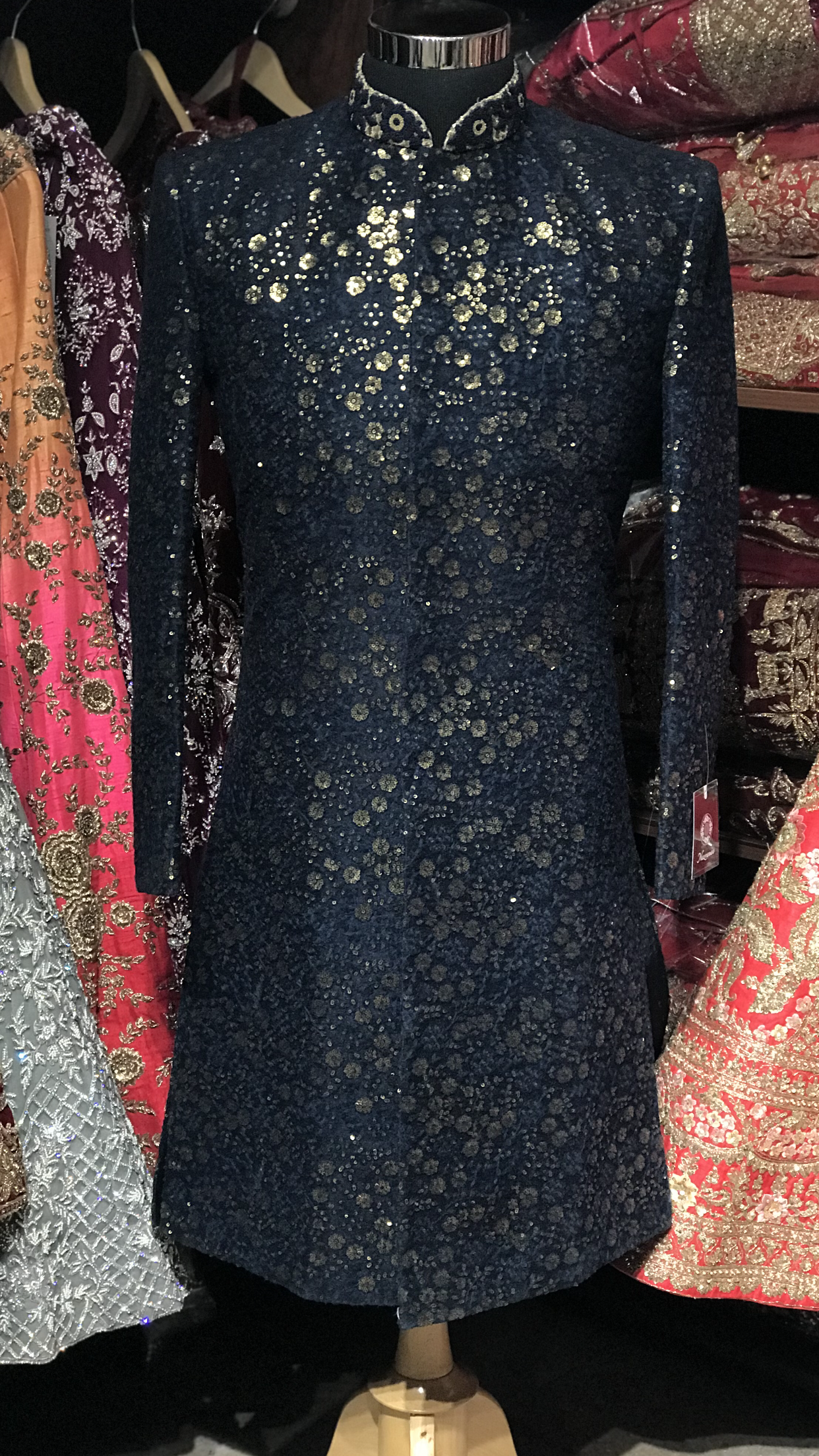 Navy raw silk sherwani with exquisite tonal embroidery and highlighted sequin embroidery! Paired with a gold chudidar!