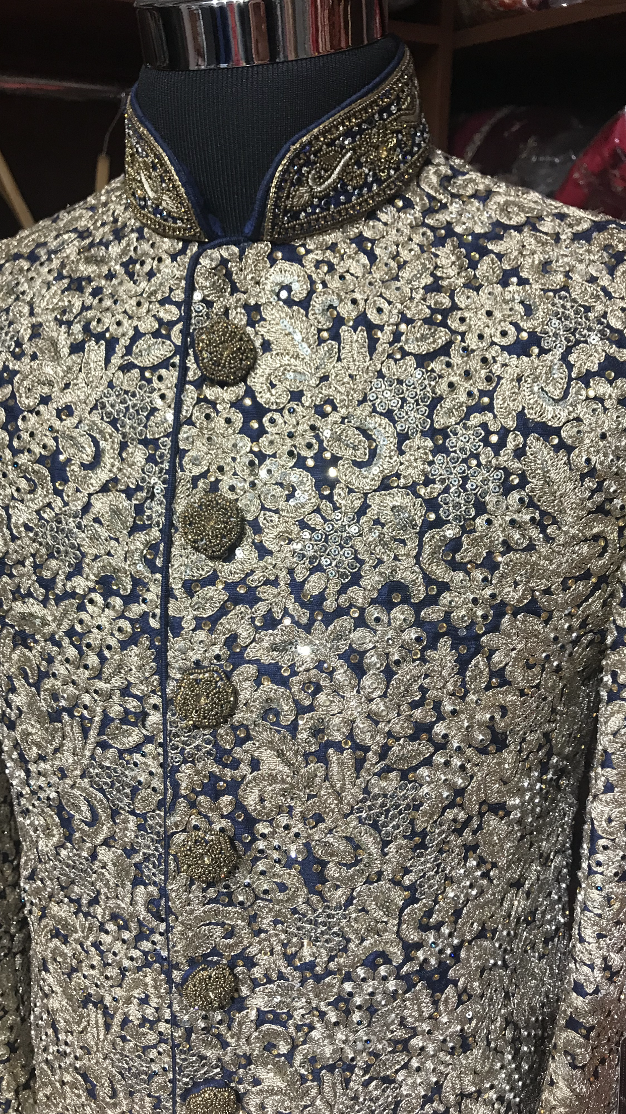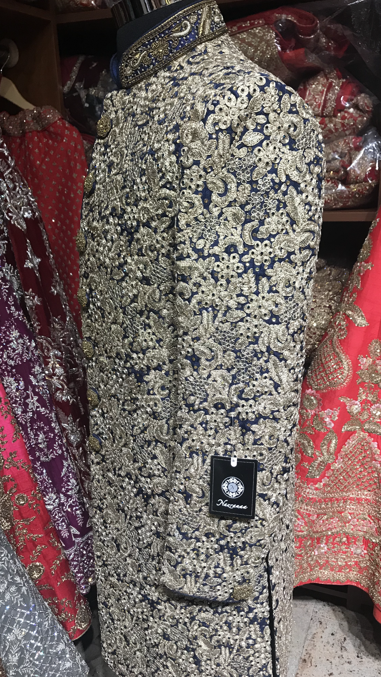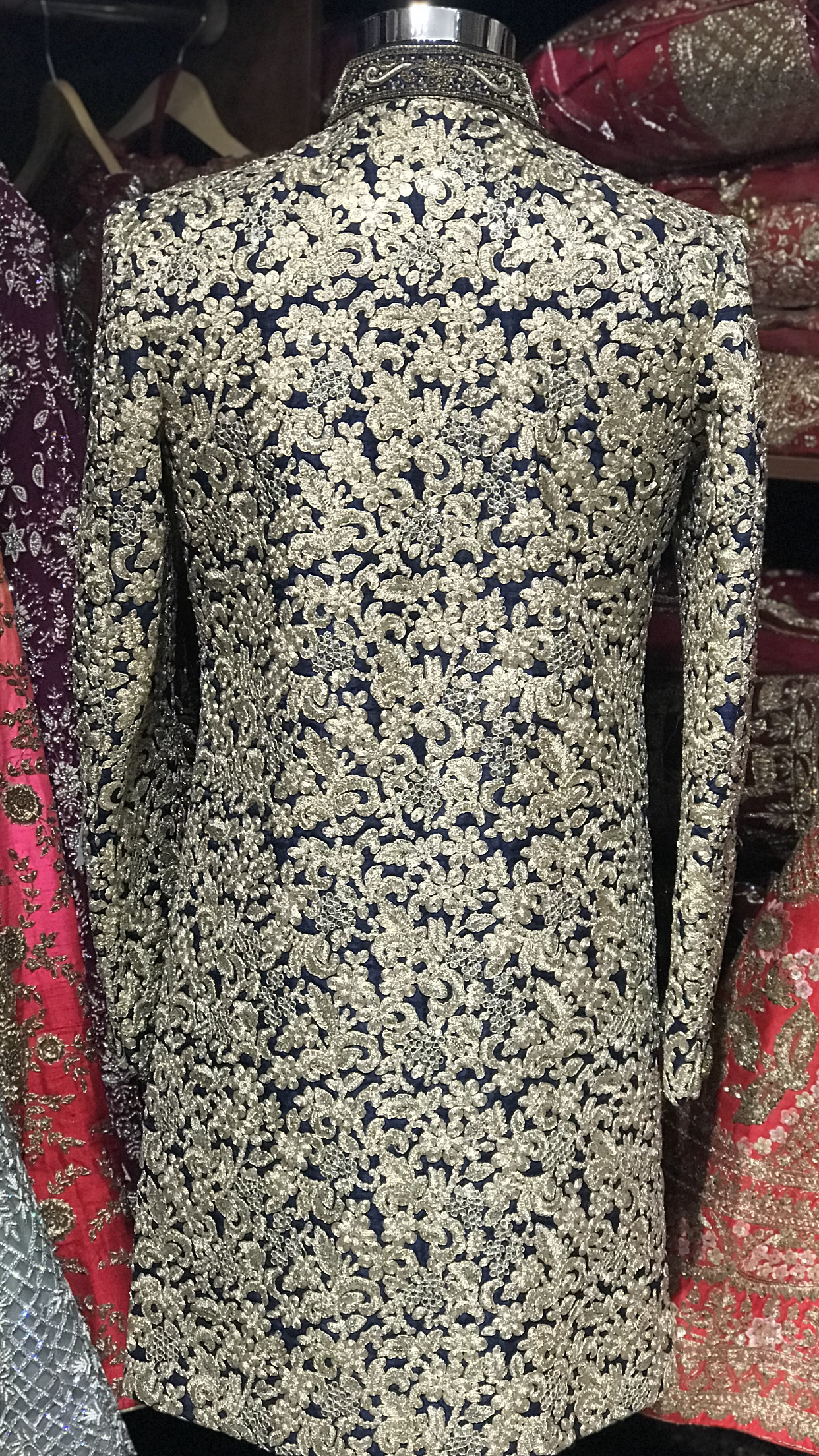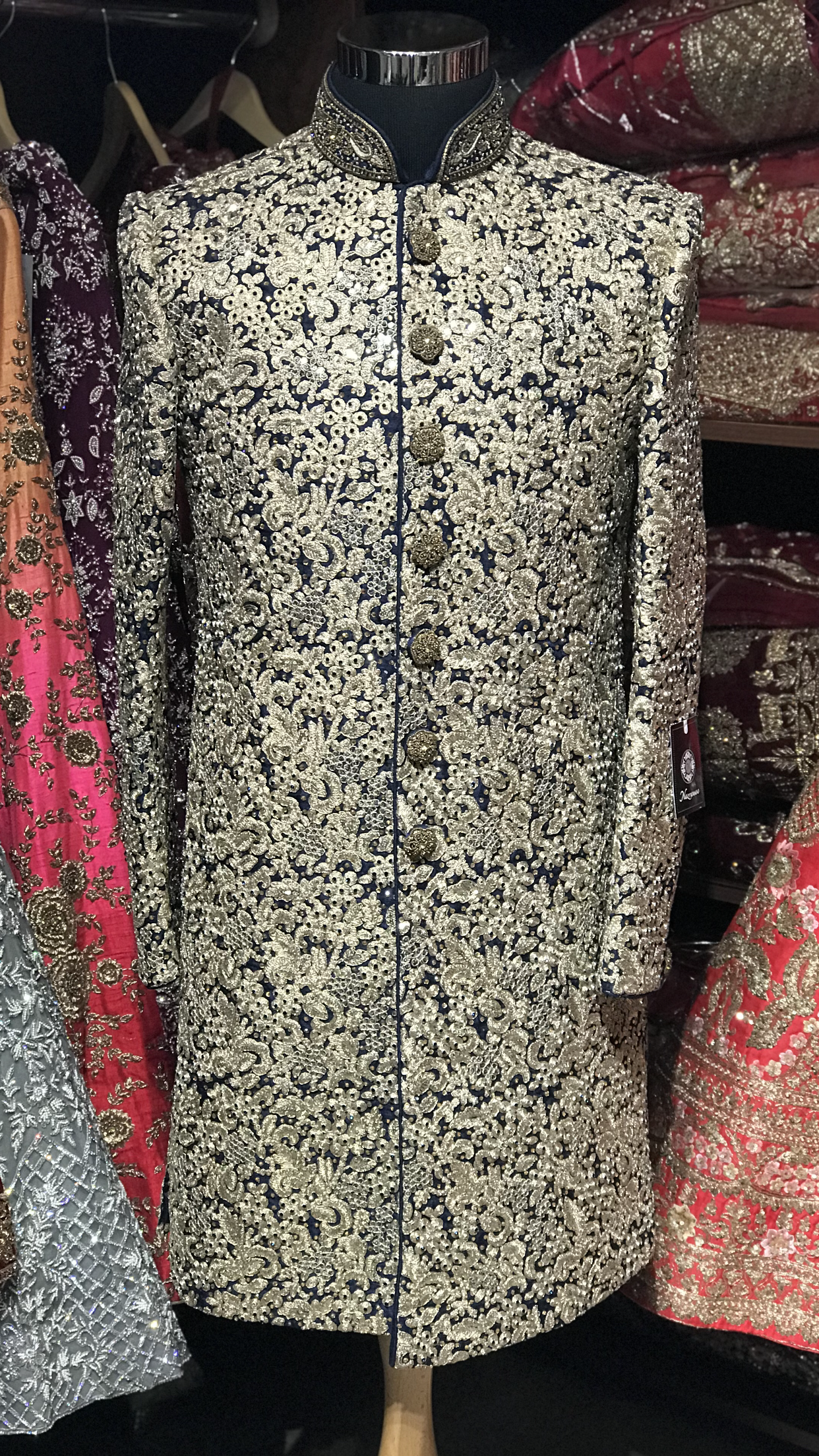 Navy raw silk sherwani with all over heavy sequin and crystal embroidery! Perfect for the groom! Paired with a gold chudidar!