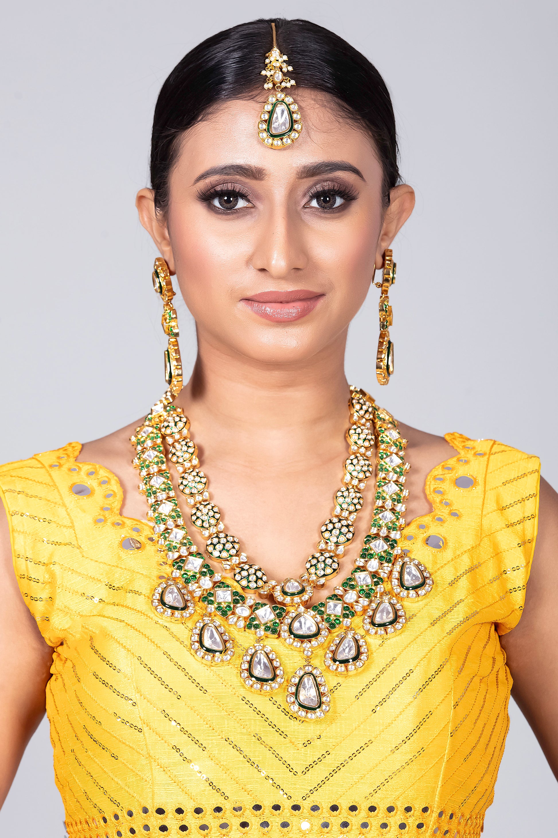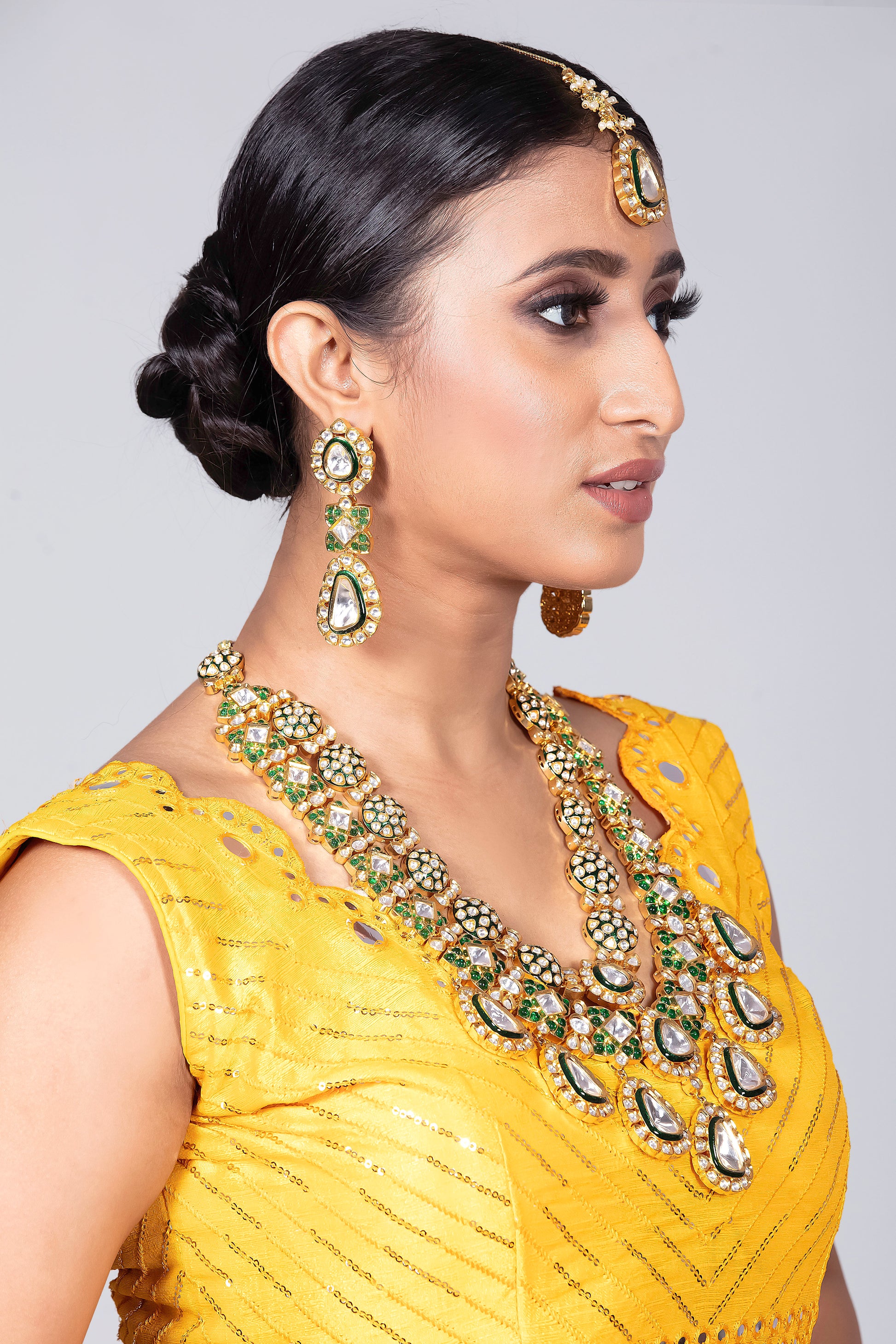 Long kundan maharani necklace with enameling work with earring and mang tikka is a perfect accessory for any night event. It is sure to make you stand out in a crowded room.
