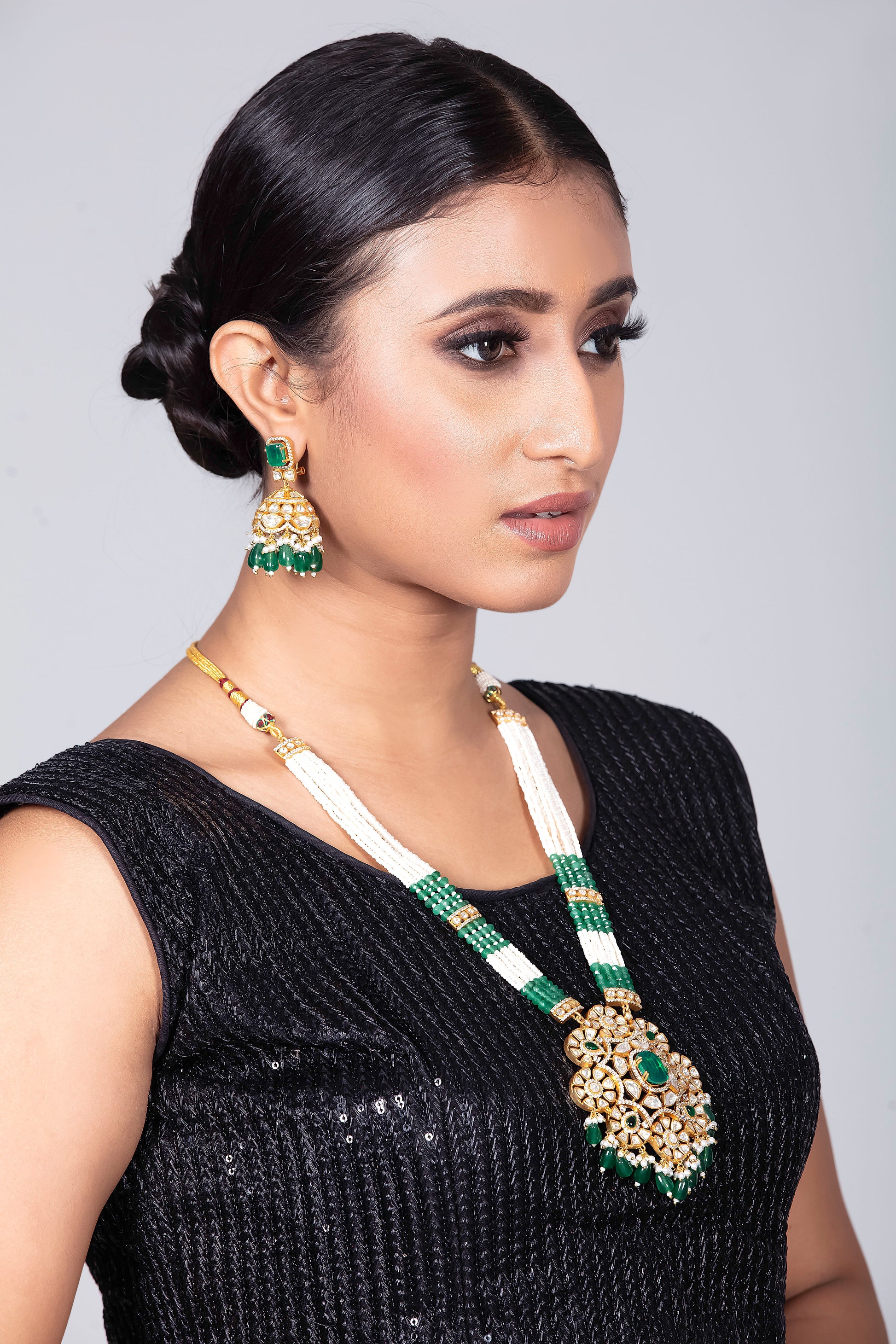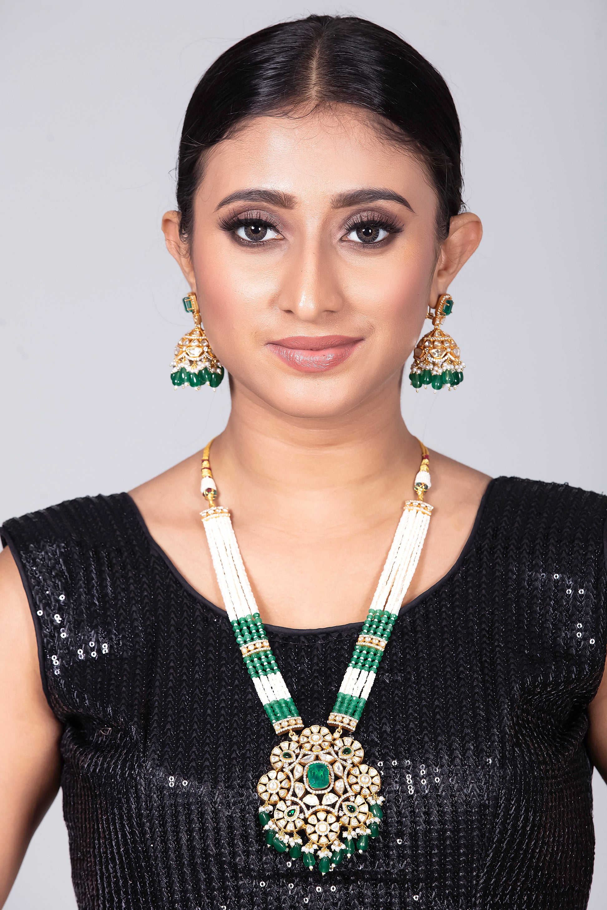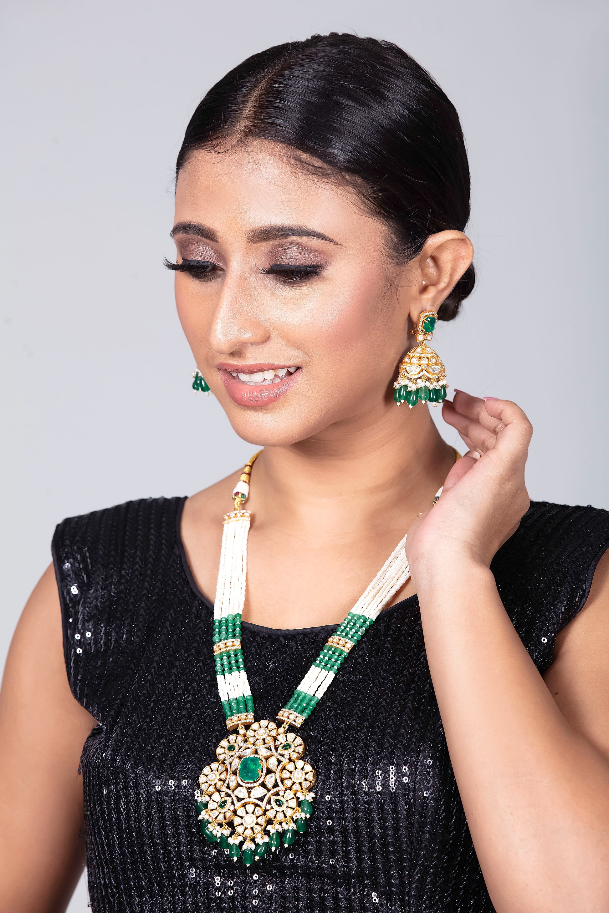 Moissanite long kundan necklace with emerald accents with Jhumka earrings is a perfect accessory for any night event. It is sure to make you stand out in a crowded room.