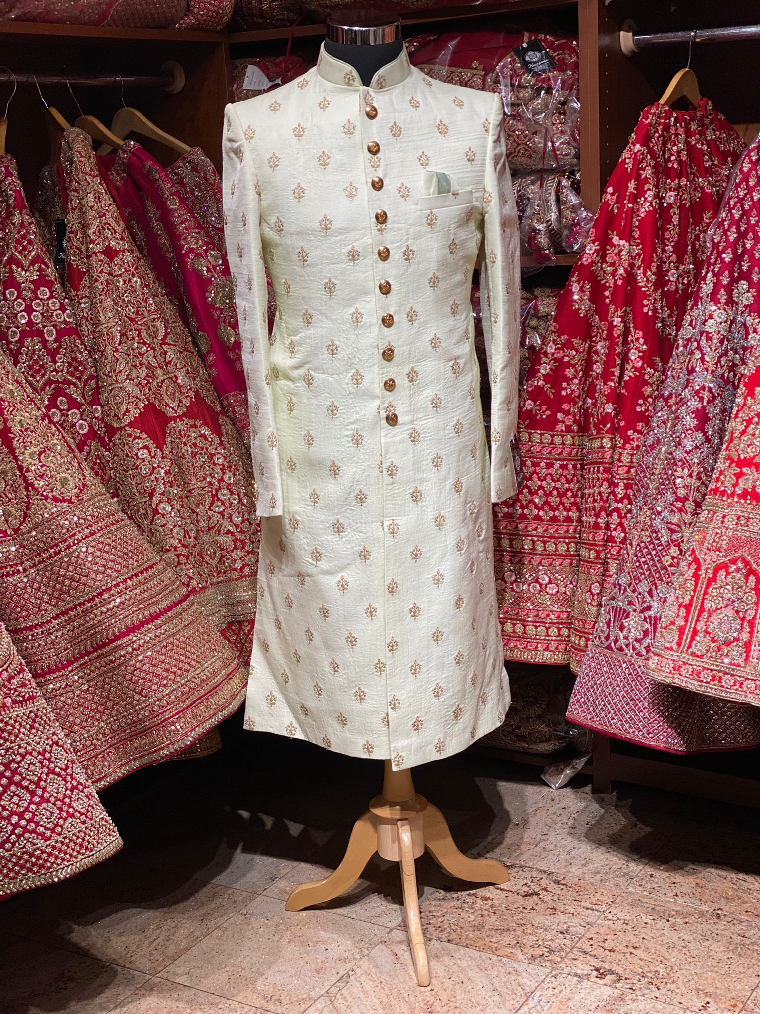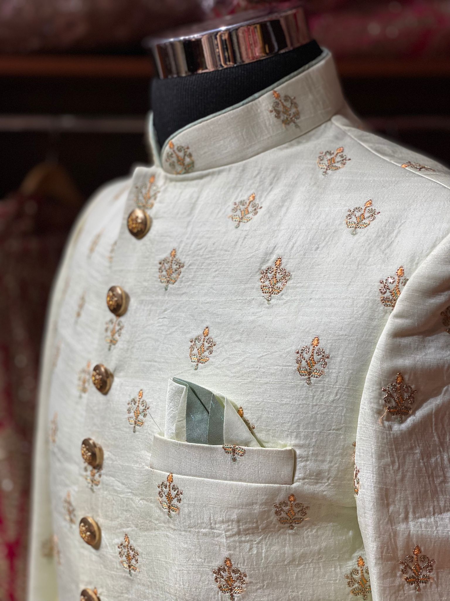 Pearl white entire sherwani is magnificently handcrafted with floral embroidered buttas scattered evenly. The sherwani is perfectly paired with a churidar for the perfect go.