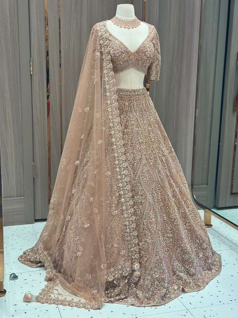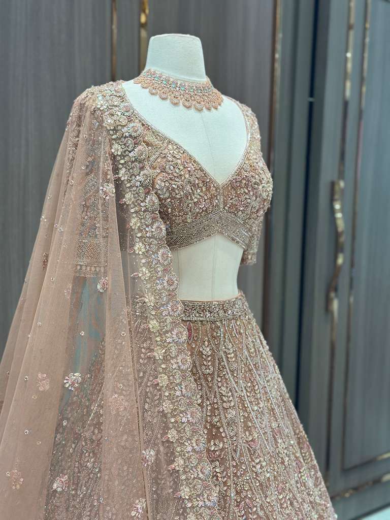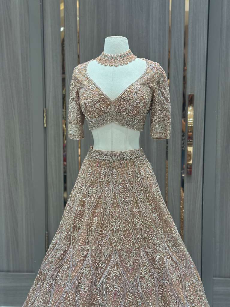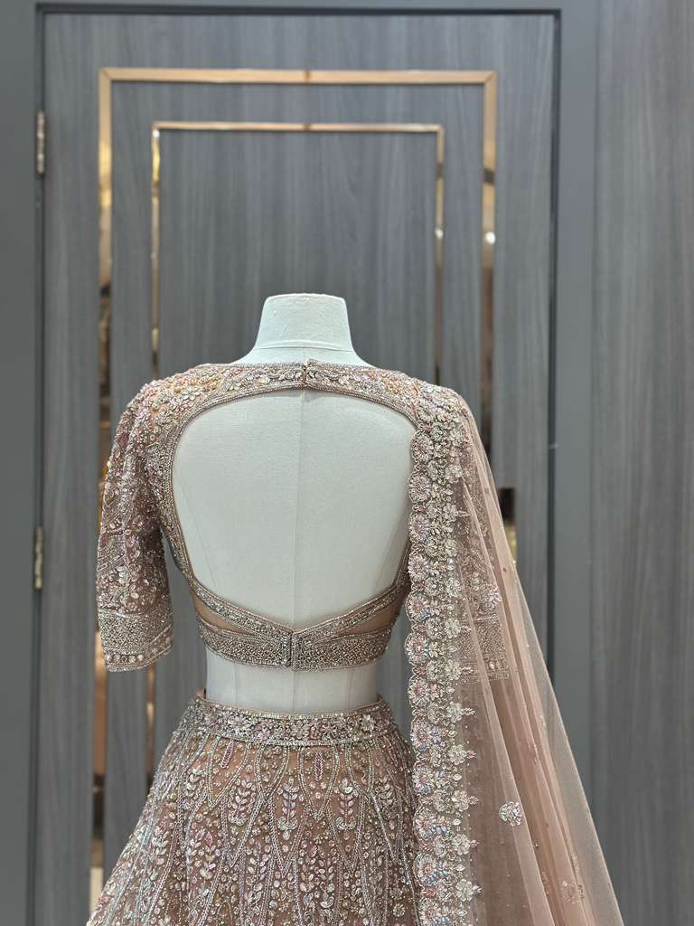 This online-exclusive peach outfit features intricate leaf and floral embroidery, enhanced with exquisite zardosi and beadwork, and accented by tones. The fine embellishments add depth and brilliance, elevating the ensemble’s elegance. Complemented by a beautifully scalloped bordered dupatta, it offers a graceful silhouette that seamlessly blends tradition with modern sophistication. Perfect for every occasion, this refined attire embodies timeless beauty with a contemporary edge, ensuring you leave a polished and memorable impression.
