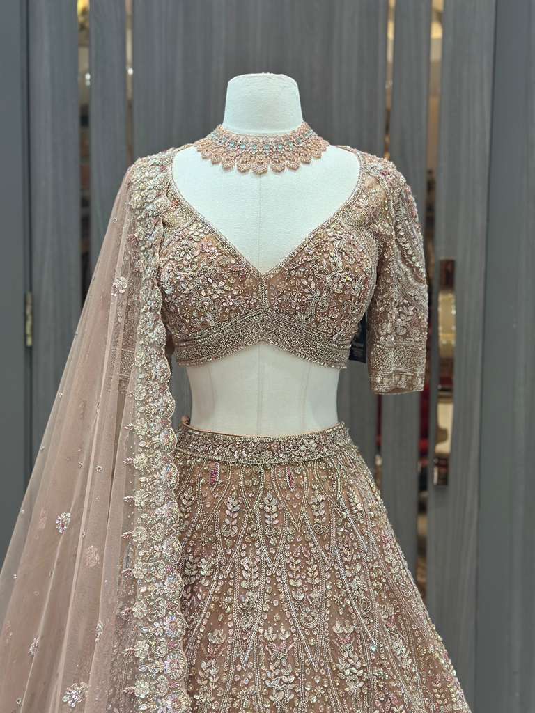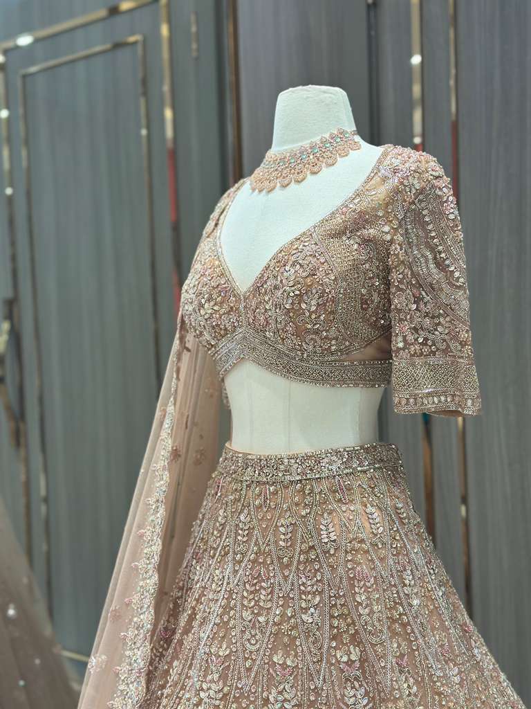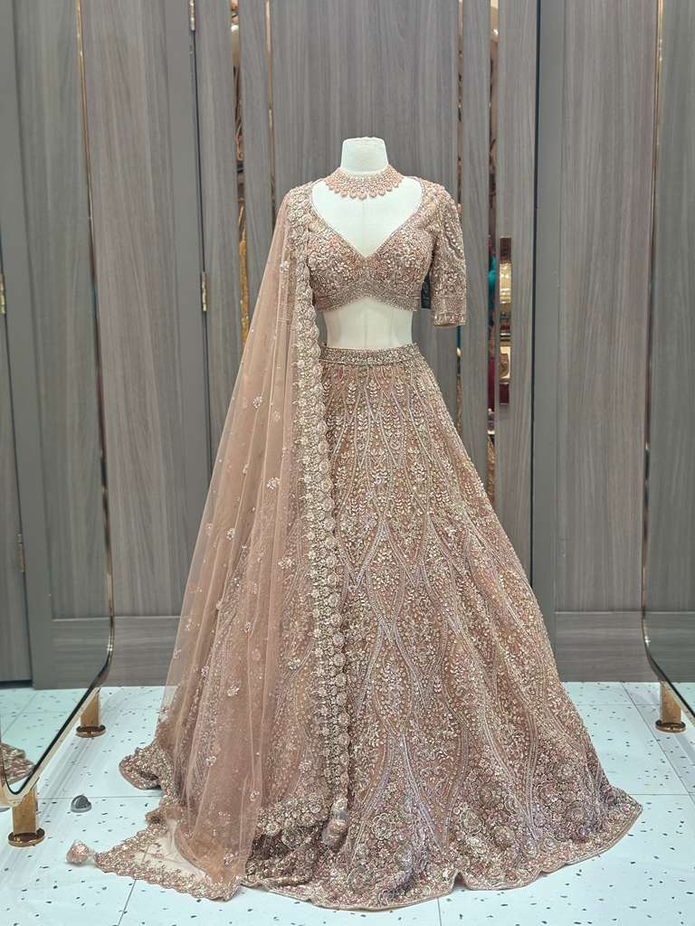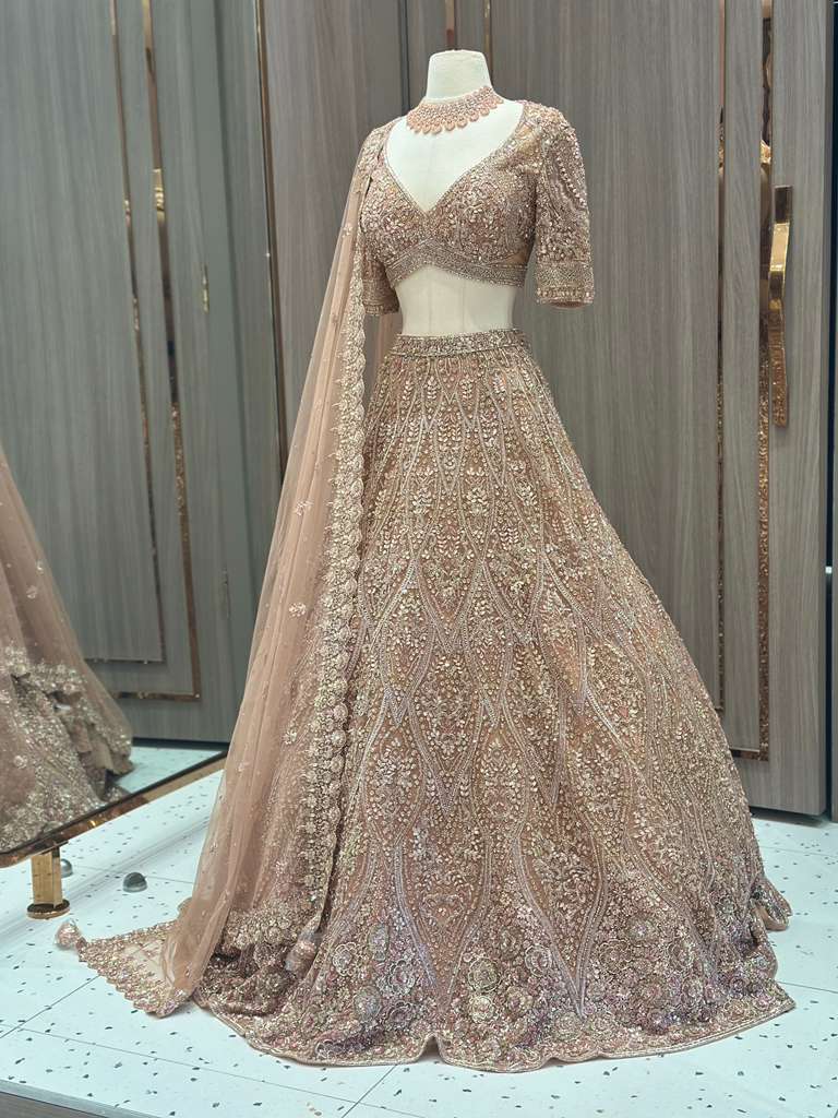 This online-exclusive peach outfit features intricate leaf and floral embroidery, enhanced with exquisite zardosi and beadwork, and accented by tones. The fine embellishments add depth and brilliance, elevating the ensemble’s elegance. Complemented by a beautifully scalloped bordered dupatta, it offers a graceful silhouette that seamlessly blends tradition with modern sophistication. Perfect for every occasion, this refined attire embodies timeless beauty with a contemporary edge, ensuring you leave a polished and memorable impression.