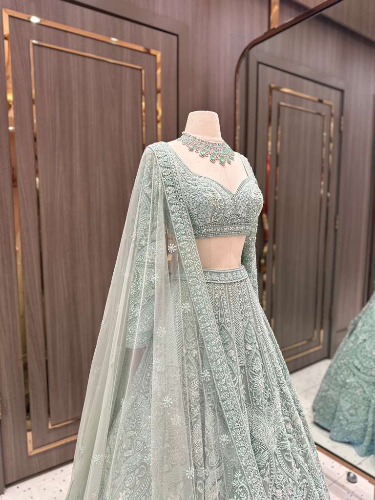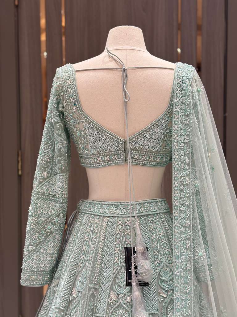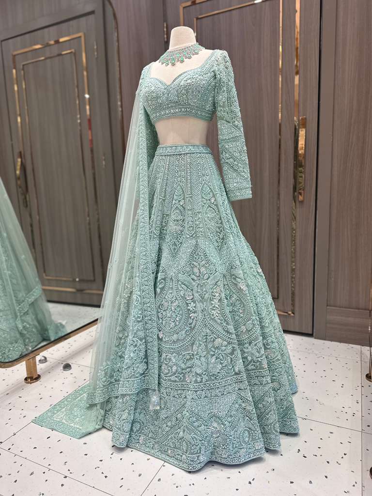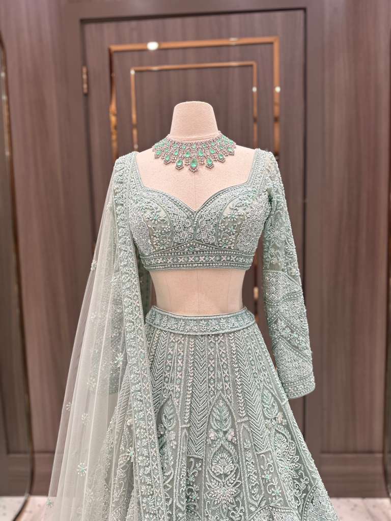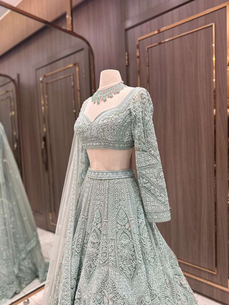 This mint green outfit radiates timeless elegance with delicate sequins and pearl work that add a refined shimmer. Traditional patterns, enriched with intricate small designs and motifs, showcase exceptional craftsmanship throughout. The long-sleeve top combines modesty with graceful style, perfect for formal events or festive occasions. Exclusively available, this piece fuses heritage artistry with contemporary sophistication, making it a distinguished addition to your wardrobe.