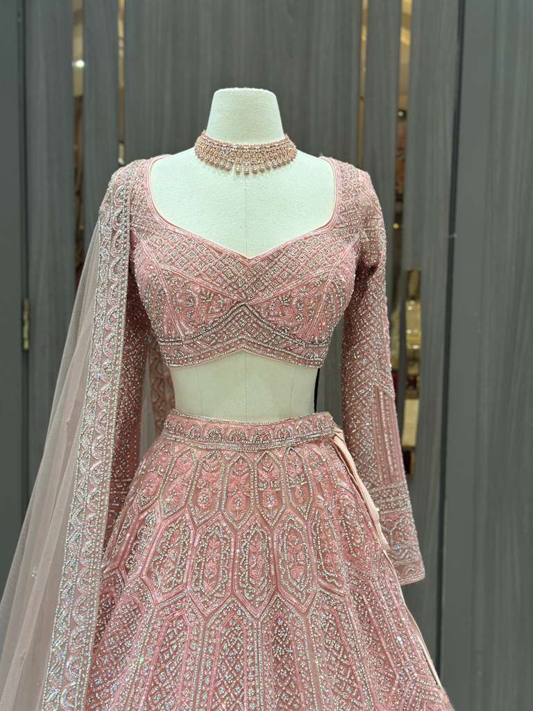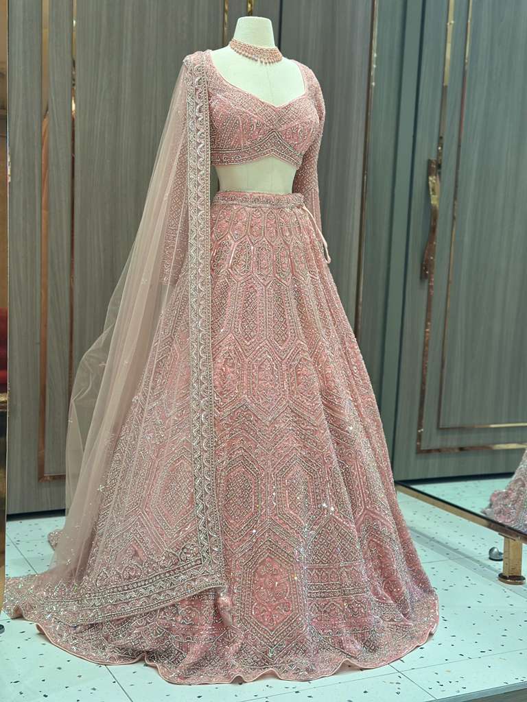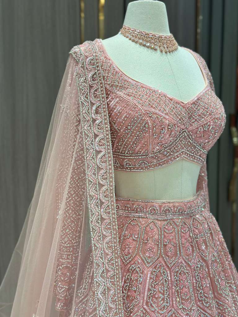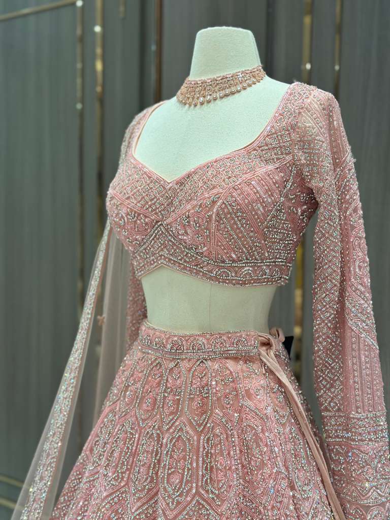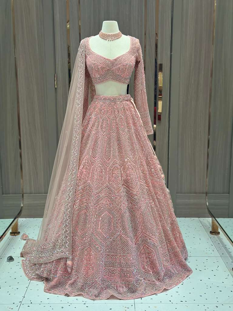 This exquisite pink outfit showcases a captivating geometric pattern meticulously embroidered with tonal threads that highlight each intricate design. Enhanced with silver stones, it offers a refined sparkle ideal for sophisticated occasions. The long sleeves and detailed craftsmanship combine to create a timeless outfit that embodies elegance.