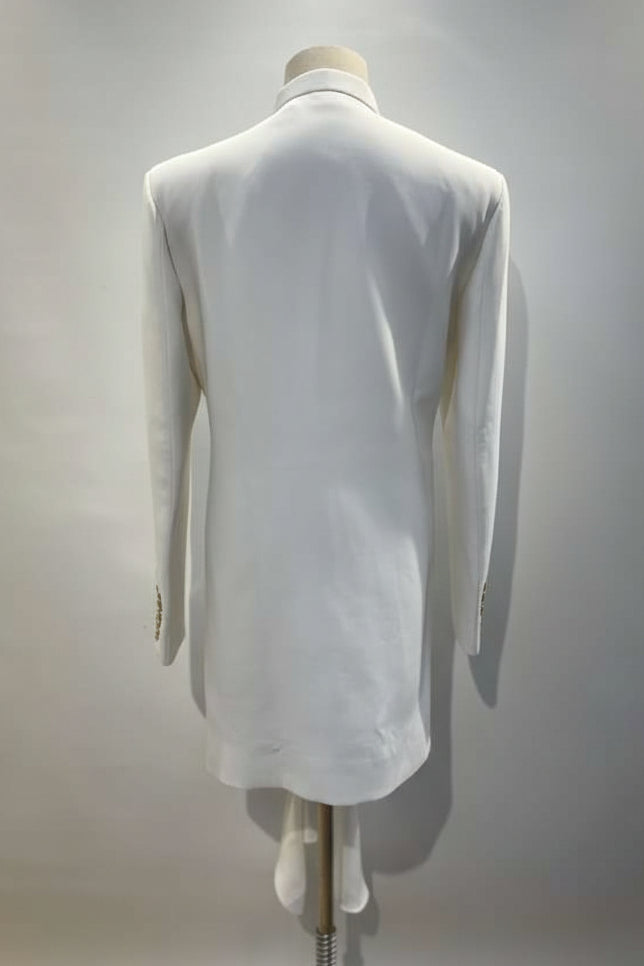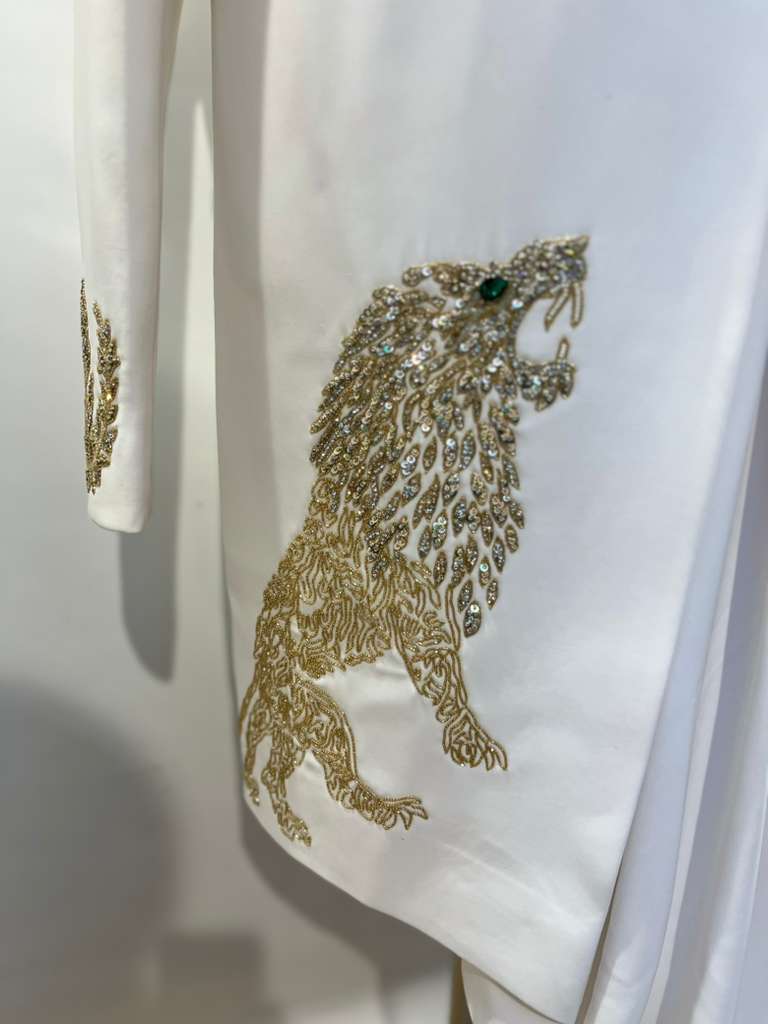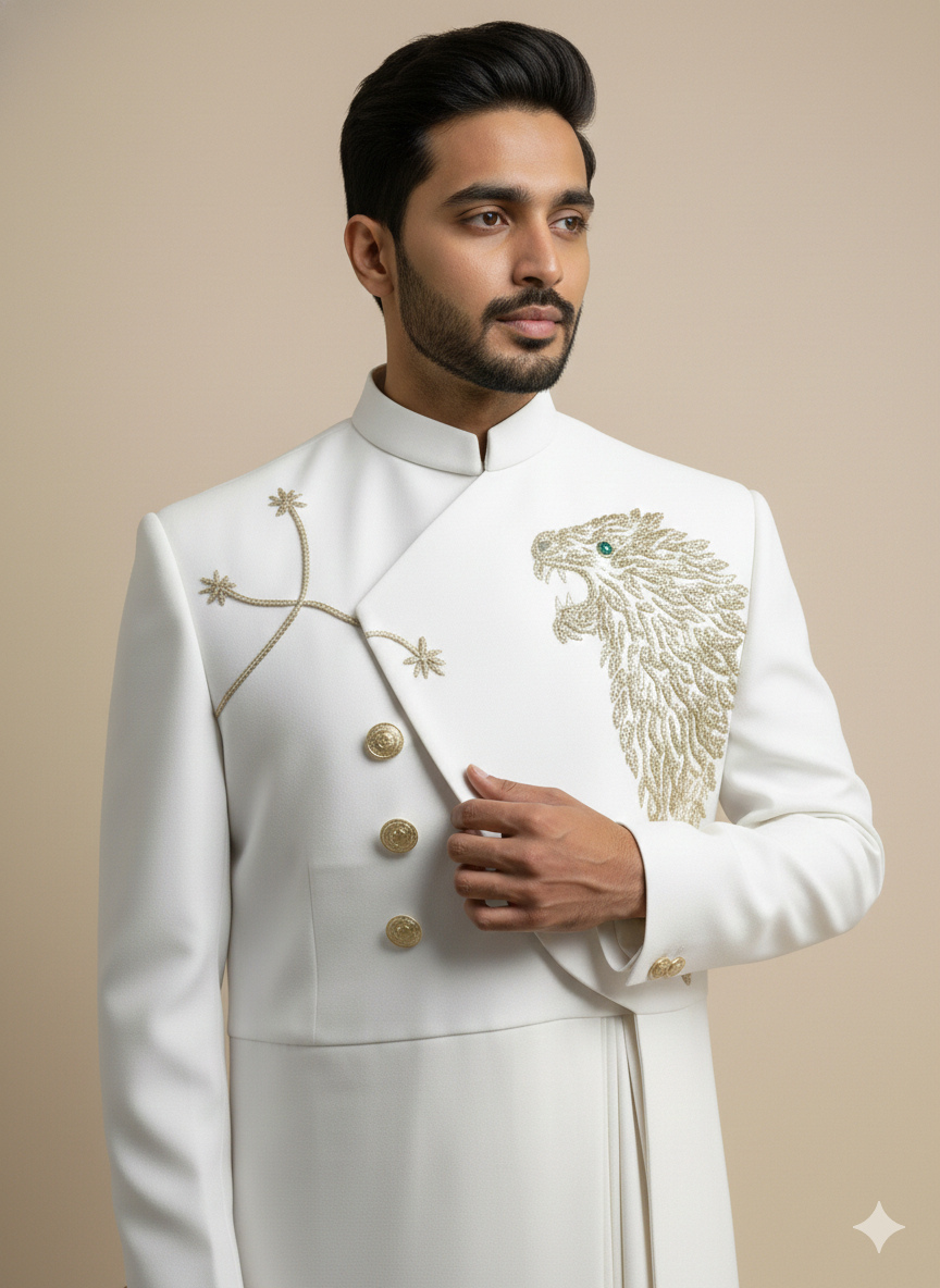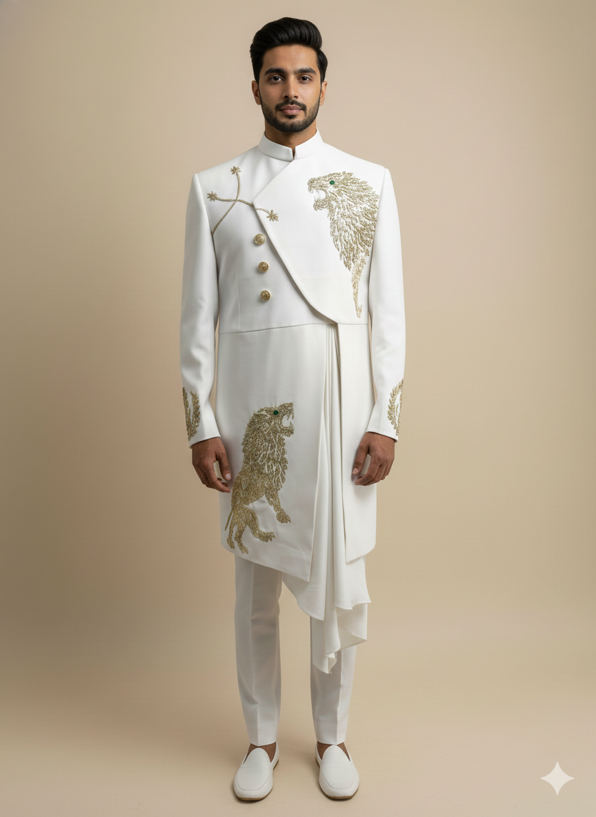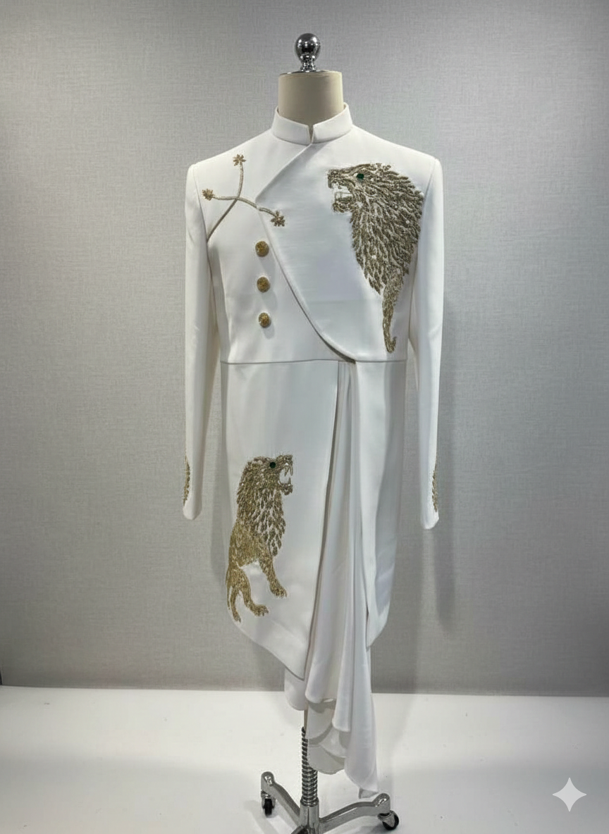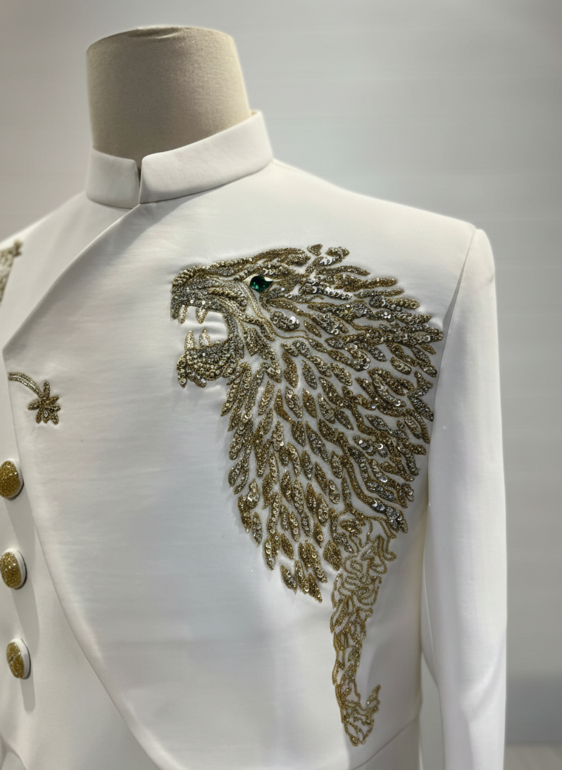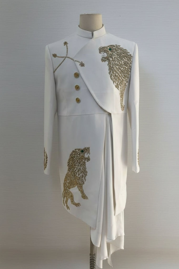 This White sherwani is a bold yet elegant statement outfit. It features a modern overlapping jacket style with a soft draped panel for a refined look. The highlight of the outfit is the hand-embroidered lion motif done in Sequin, cut dana and green stone detailing, symbolizing strength and royalty. Delicate floral embroidery and gold buttons add a classy touch. Paired with matching pants, this outfit is perfect for a groom or anyone looking to make a powerful, sophisticated impression.
