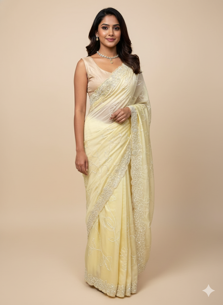 • Light yellow saree embroidered with sequins work saree with unstitched blouse.