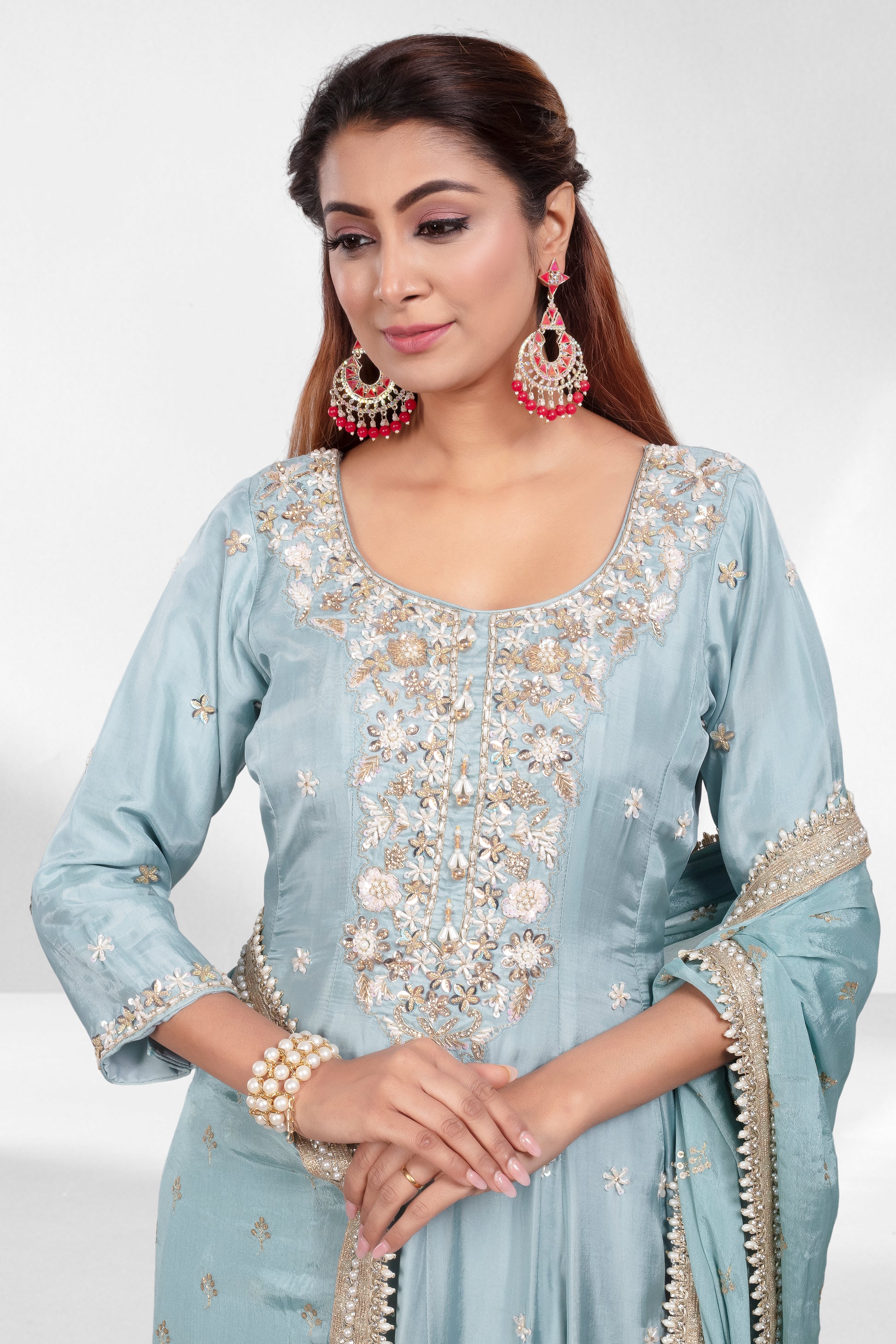 This serene sky-blue sharara set is a vision of elegance and grace. The outfit is beautifully embellished with delicate pearls, creating intricate floral motifs along the neckline and hem. Paired with a matching dupatta featuring dainty embroidered accents and a subtle lace border, this ensemble is perfect for daytime festivities, wedding events, or Eid celebrations.
