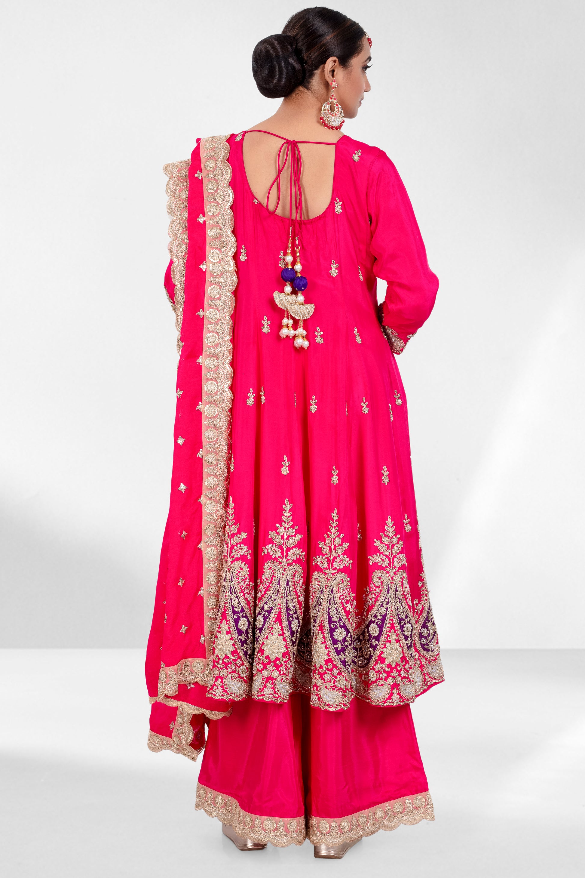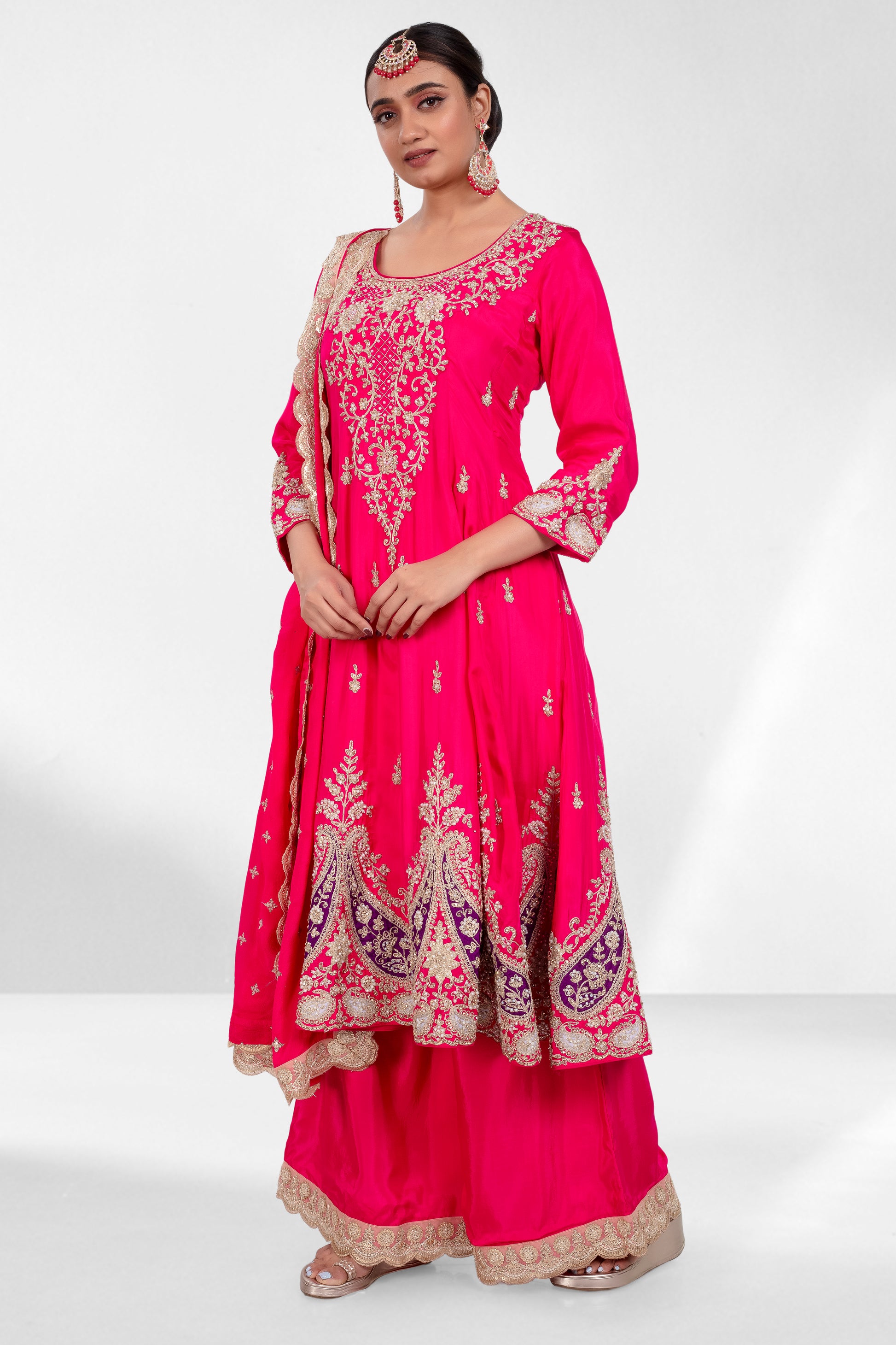 Command attention in this dazzling Pink suit set! The intricately embroidered Anarkali top features ornate motifs in gold threadwork, highlighted with ivory pearls and reflective gold stones. Deep purple thread accents at the hem add a layer of regal depth. Paired with wide-legged pants and a statement dupatta with scalloped detailing, this outfit is a celebration of color and craftsmanship.
